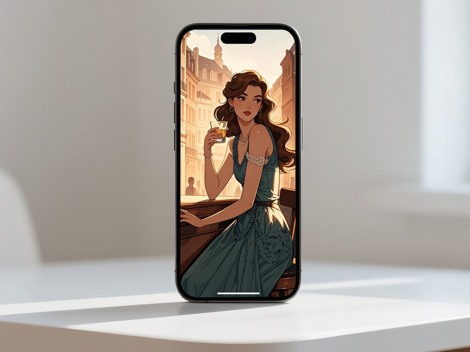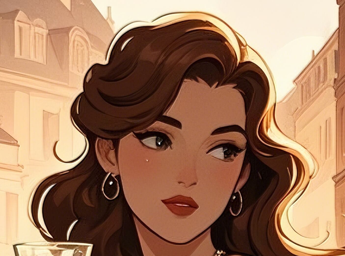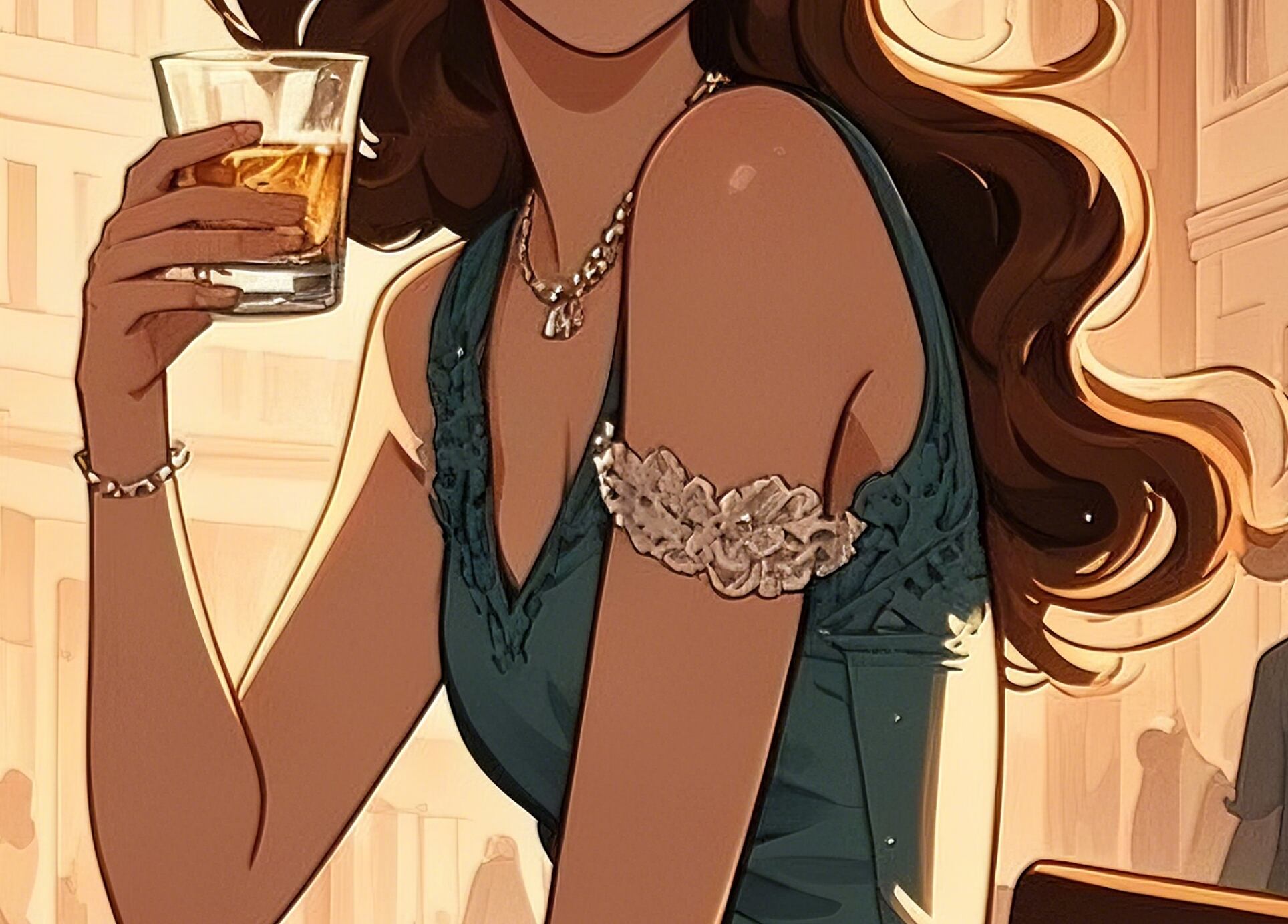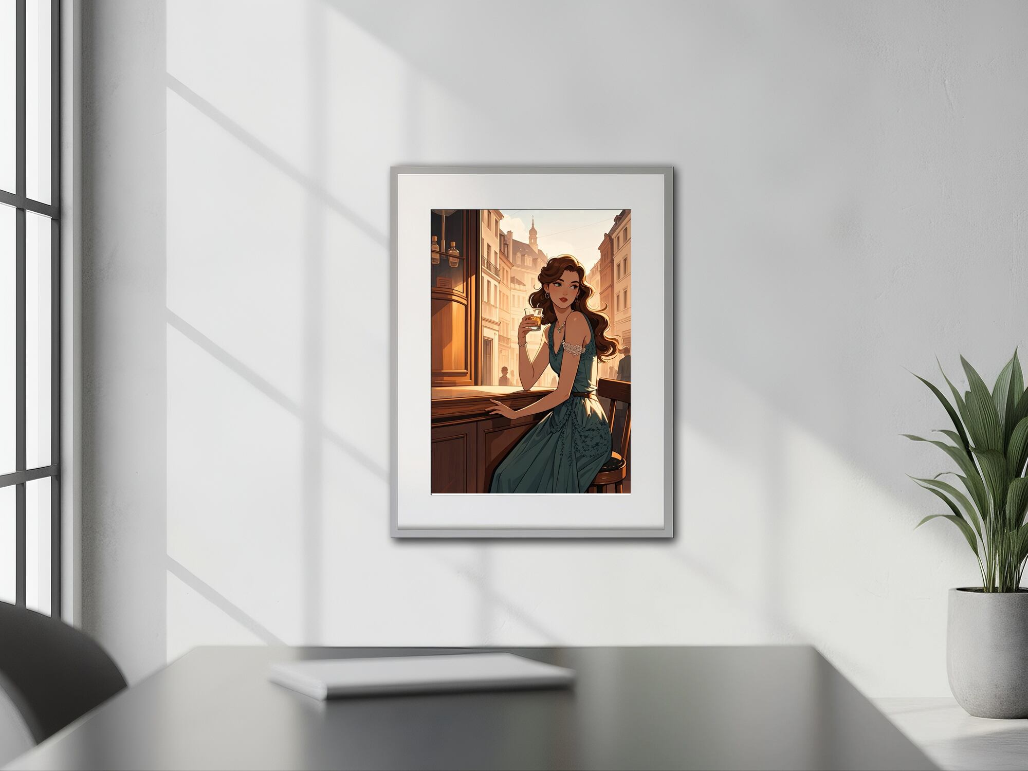 黄金色の光に包まれたこの作品は、過ぎ去った街の夕暮れのロマンスを感じさせる。女性の優雅な姿勢と柔らかな表情、そしてカフェの外に広がる日差しの街並みが、映画のワンシーンのような親密さと郷愁を生み出している。金色や琥珀色のトーンは豊かでありながら穏やかで、夕日の温もりと静かな感情が共存している。グラスの輝きやドレスに落ちる光の繊細な描写が、静かな思索の時間を象徴しているようだ。喧噪の中の静けさ、そして記憶の中の美しい一瞬を捉えた、詩的で感傷的な作品である。
