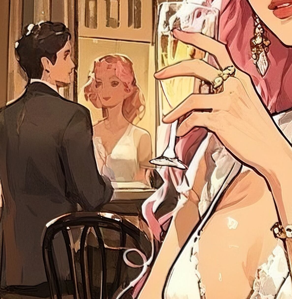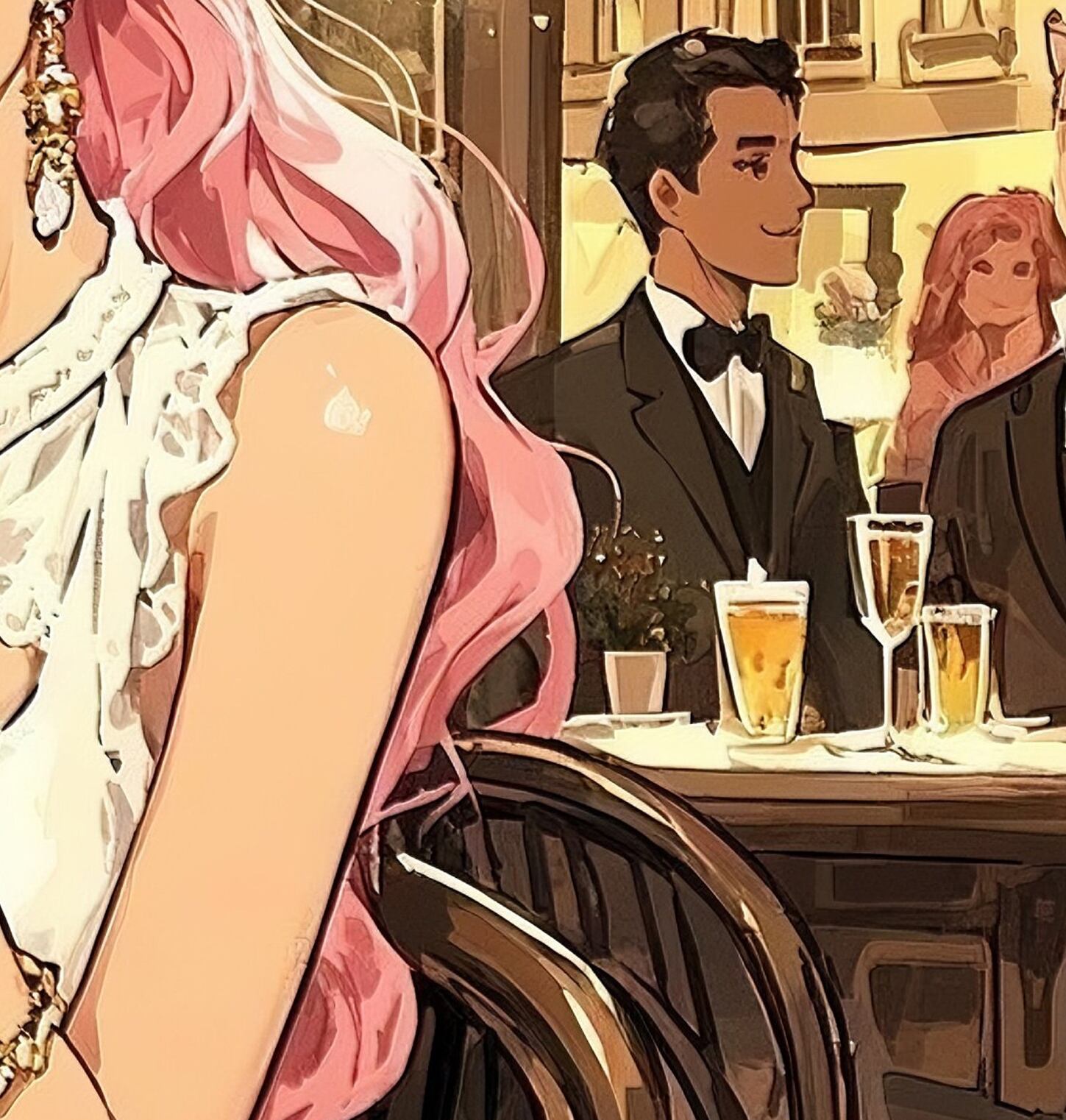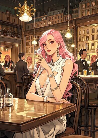 現代的な魅力と華やかさを併せ持つ作品です。ピンクヘアの女性がバーでくつろぐ姿は、都会的で少し挑発的な雰囲気を放っています。背景の人々や照明が細やかに描かれ、物語性を感じさせる構図です。柔らかな光沢とシャープな線描が共存し、モダンアニメ調の中にラグジュアリーな香りを漂わせています。大胆でスタイリッシュな印象が強く、アートとして非常に完成度が高い一枚です。