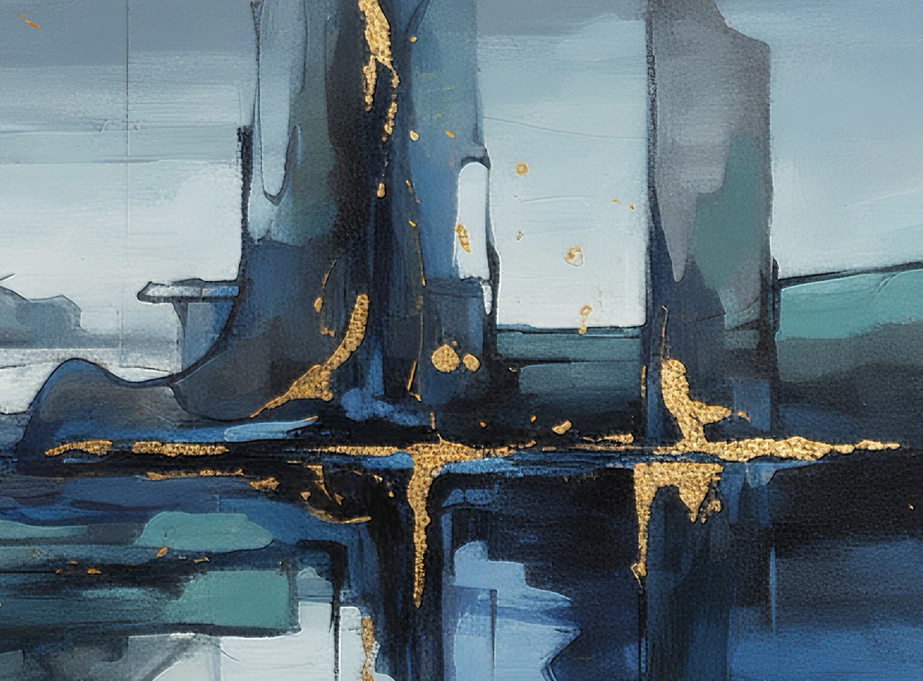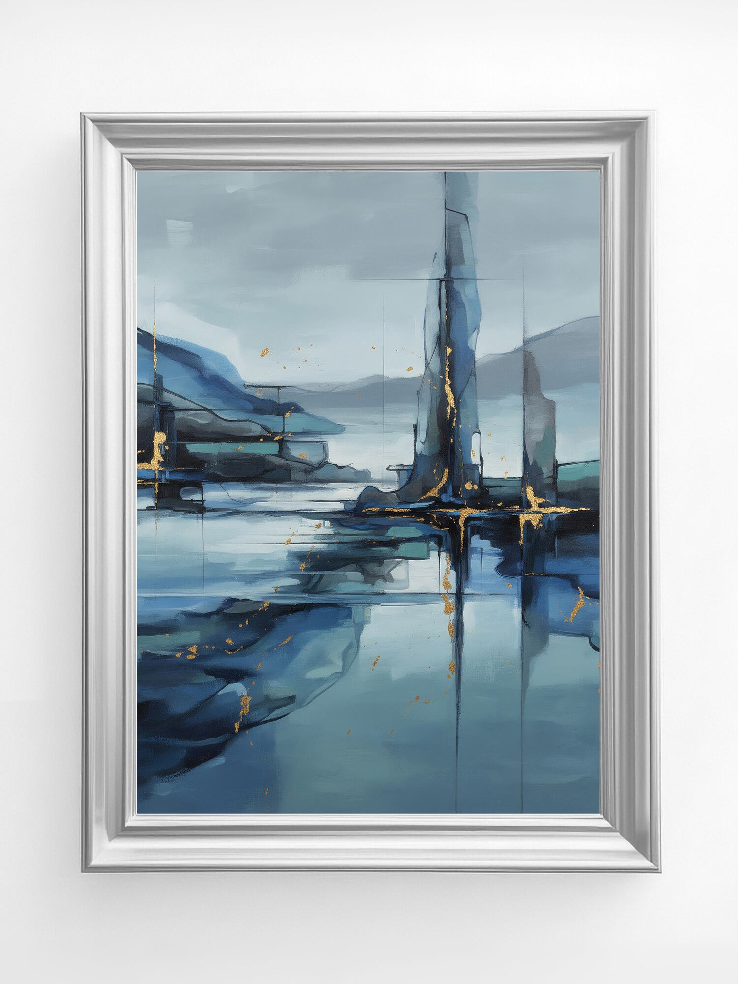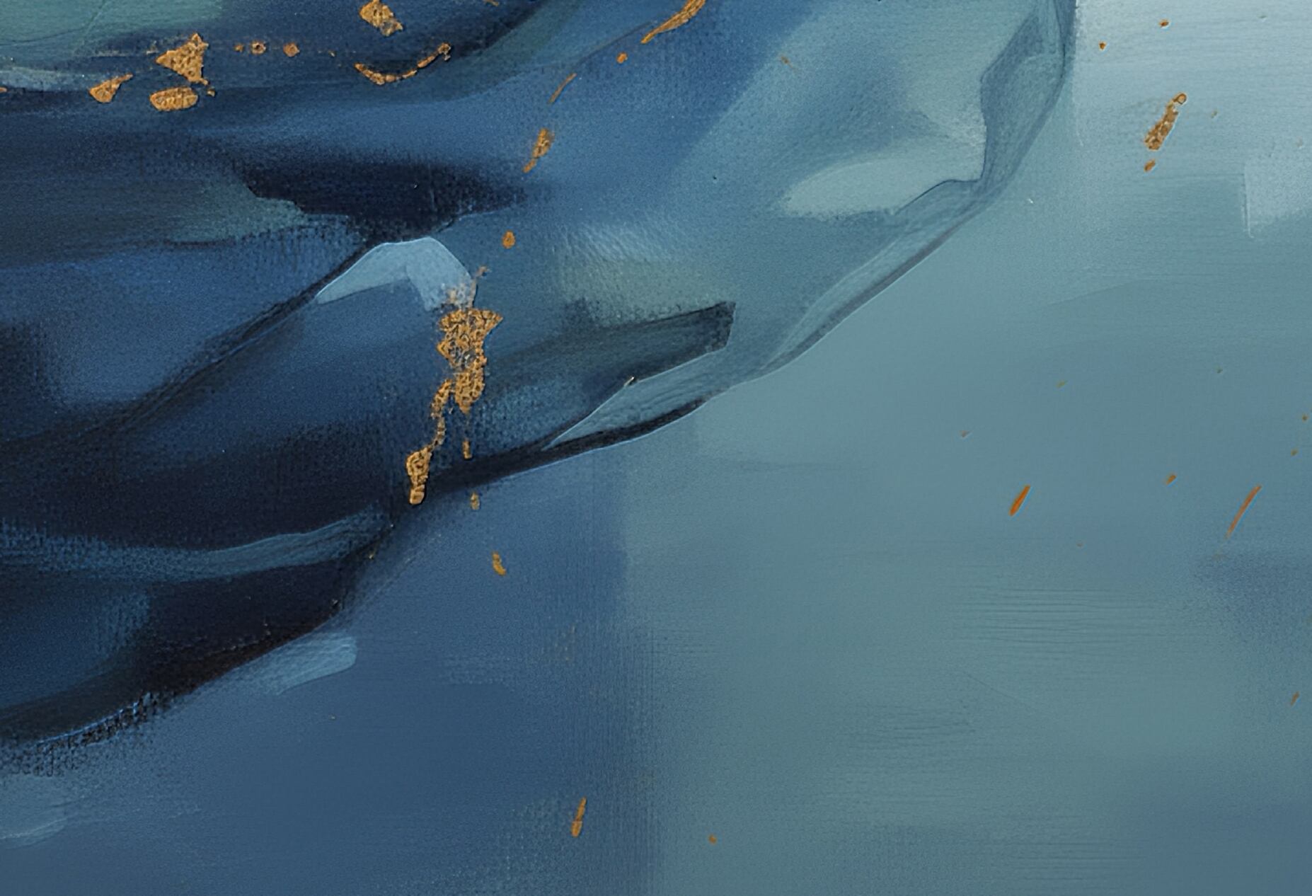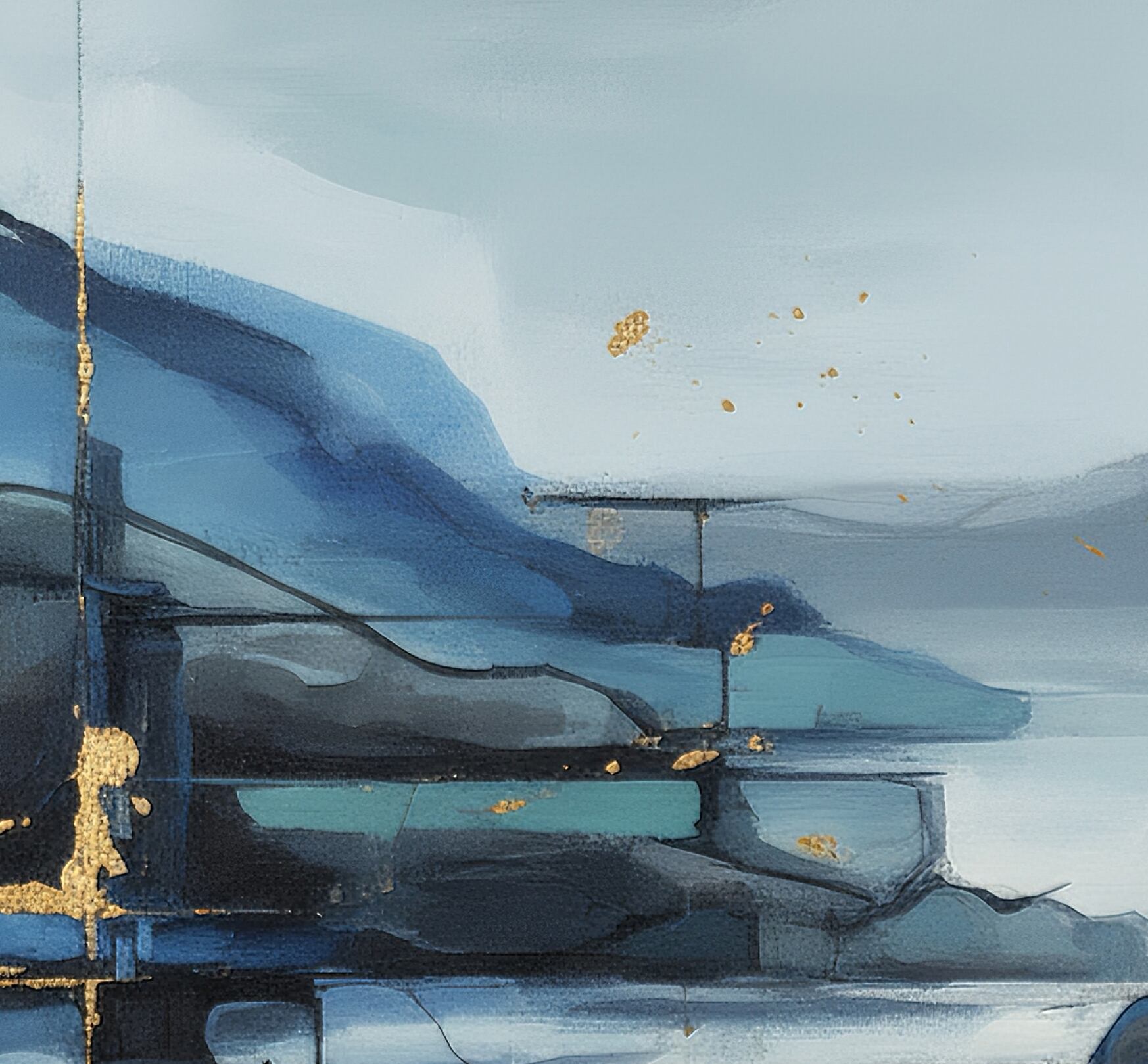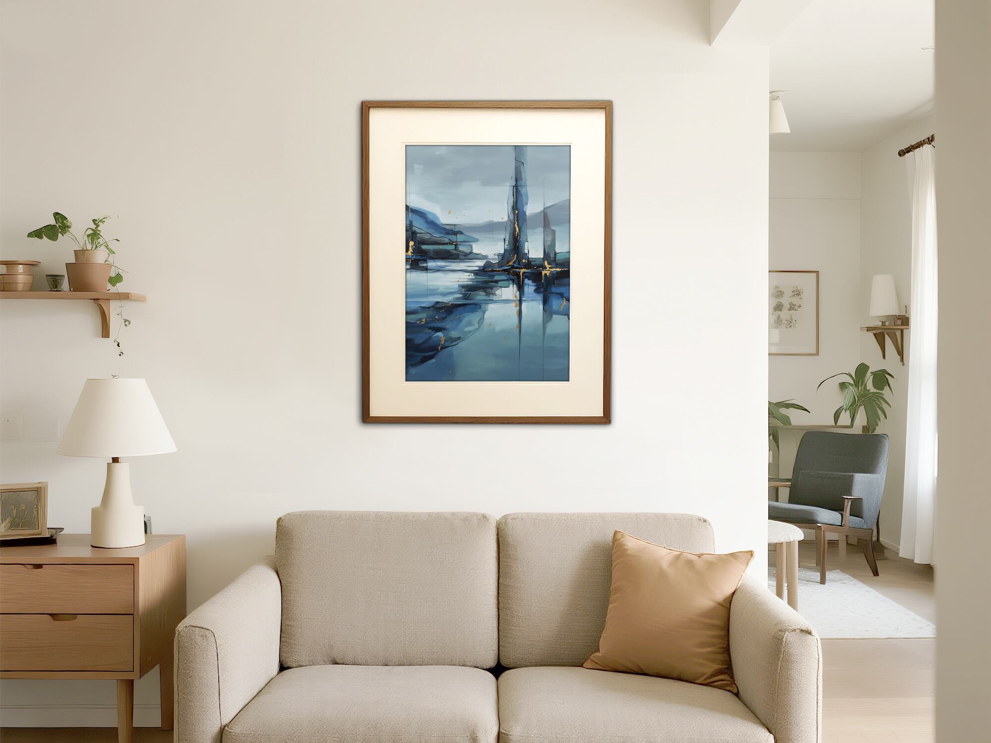 深い青の世界に漂う静寂と輝き。幻想的な風景をモダンな抽象表現で描いたアートです。青の濃淡が美しく、金のアクセントが作品全体に高級感と神秘性を与えています。構図は縦方向に伸び、自然の壮大さと孤高の静けさを感じさせます。水面の反射表現が巧みで、現実と夢の境界を曖昧にする詩的なムードを放ちます。空間に洗練された静けさをもたらします。瞑想や安らぎを求める空間にも最適な作品です。