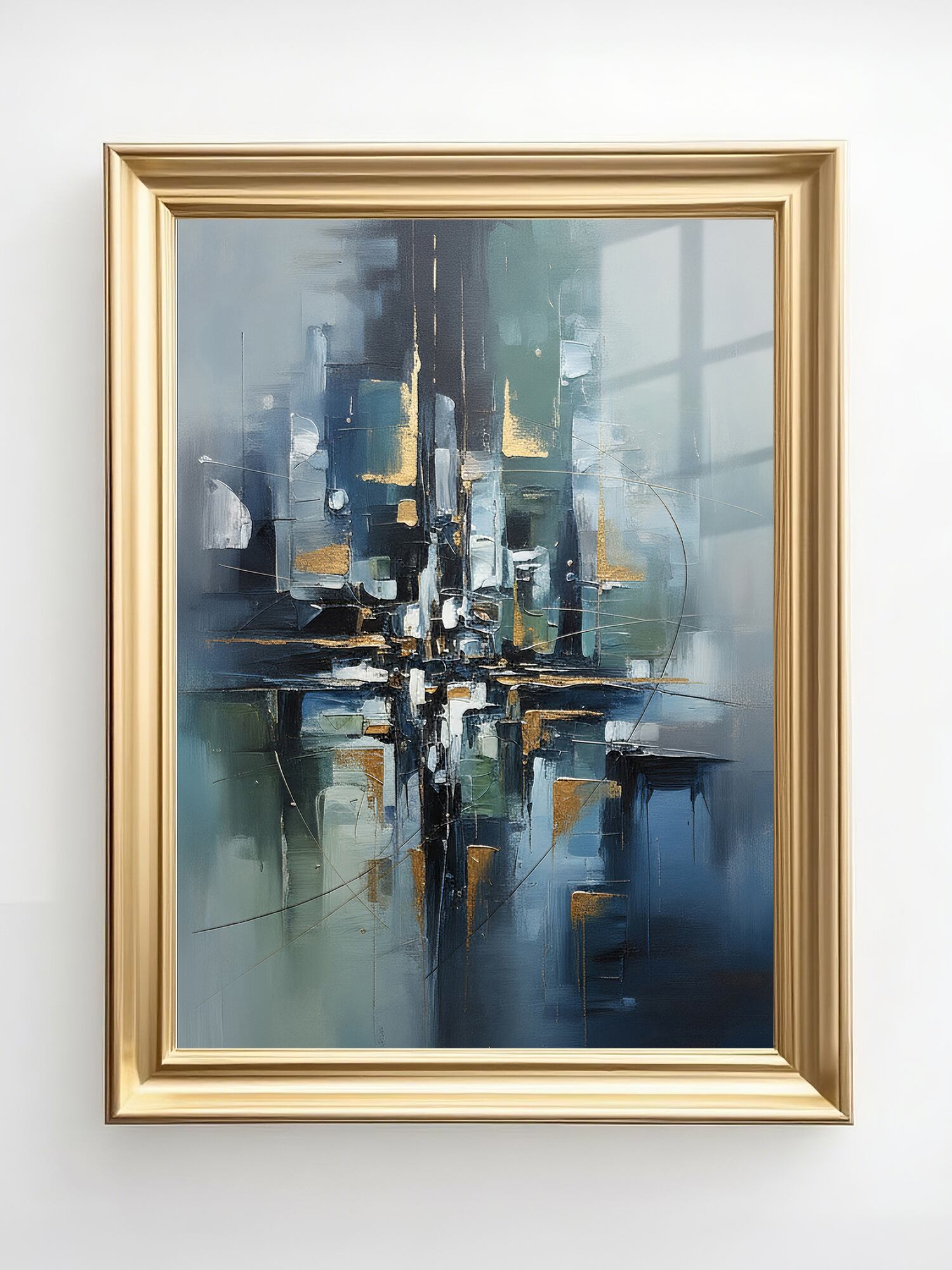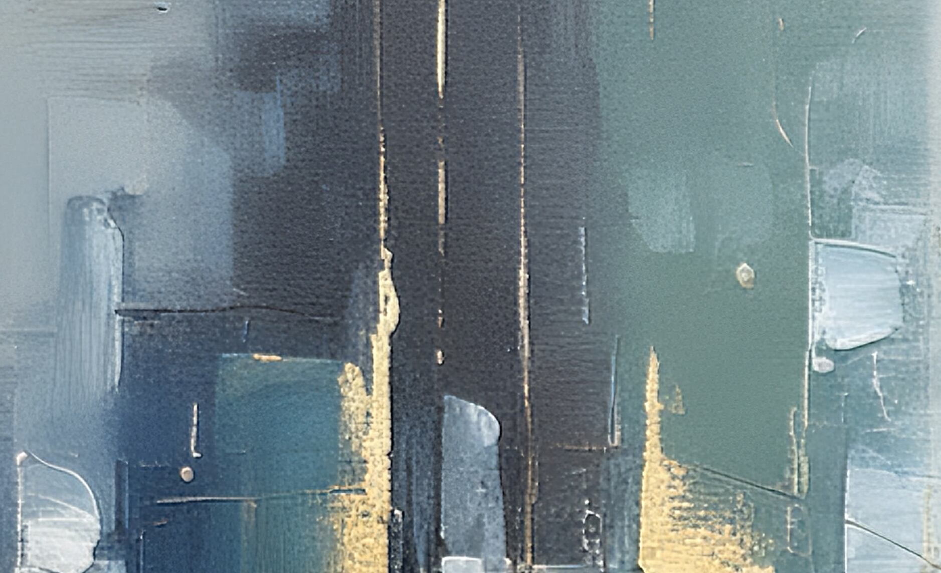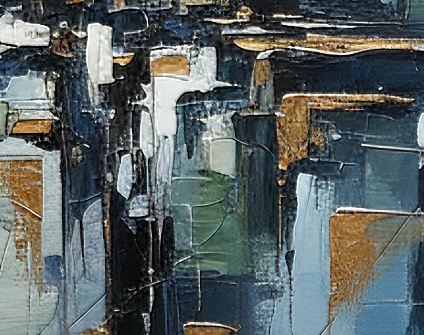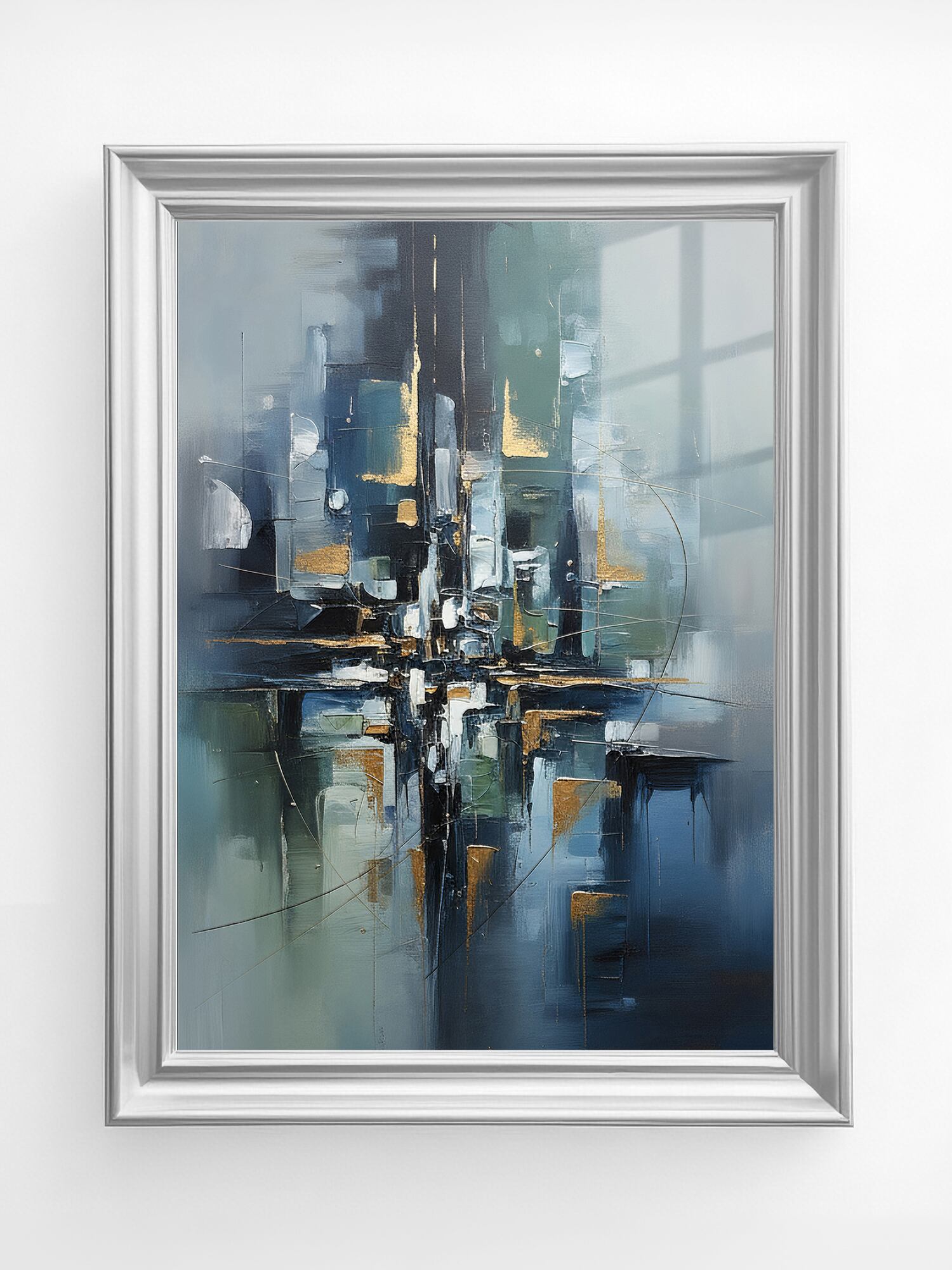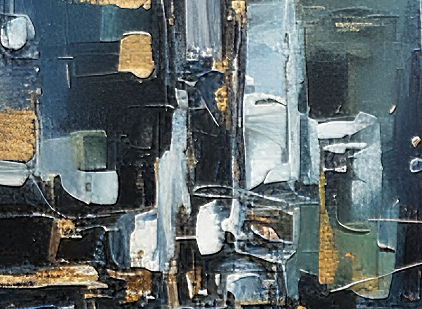 ややクール寄りのグレー〜ブルーを基調に、中央で交差する構造的なラインと高低差のある塗り重ねが印象的。明暗の処理が繊細で、光が差し込むようなソフトなハイライト(左上の窓のような形状を想起させる部分)が空間に広がりを与えています。構図は十字状のバランスを保ちつつ、ところどころに金属感のあるアクセントが配され、工房的・工業的な質感と静的な詩情が同居します。エッジの処理やブレンドは精緻で、画面全体に落ち着いた調和があるためモダンインテリアによく馴染みます。AI特有の整合性あるパターンと、手作業的な筆跡の粒感が上手く融和しています。
