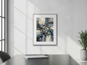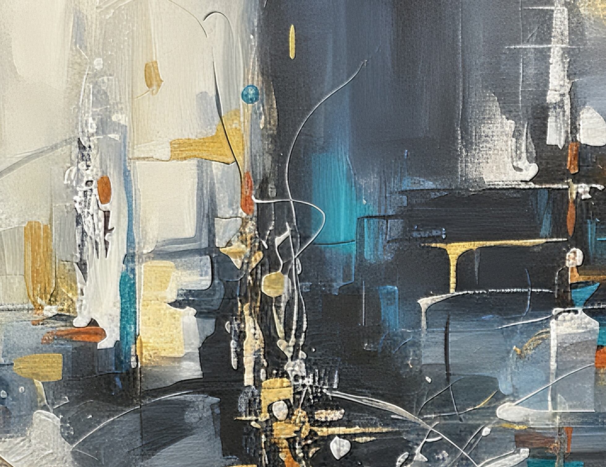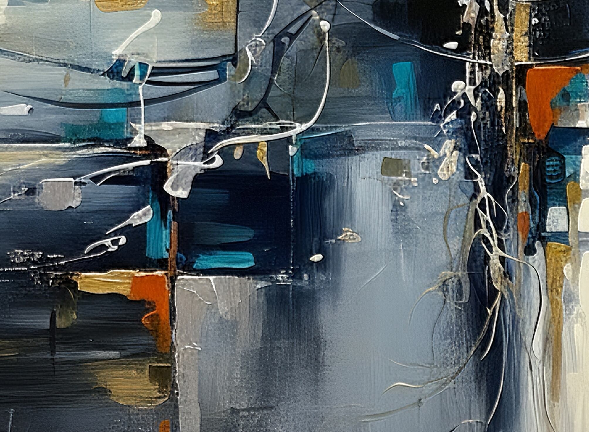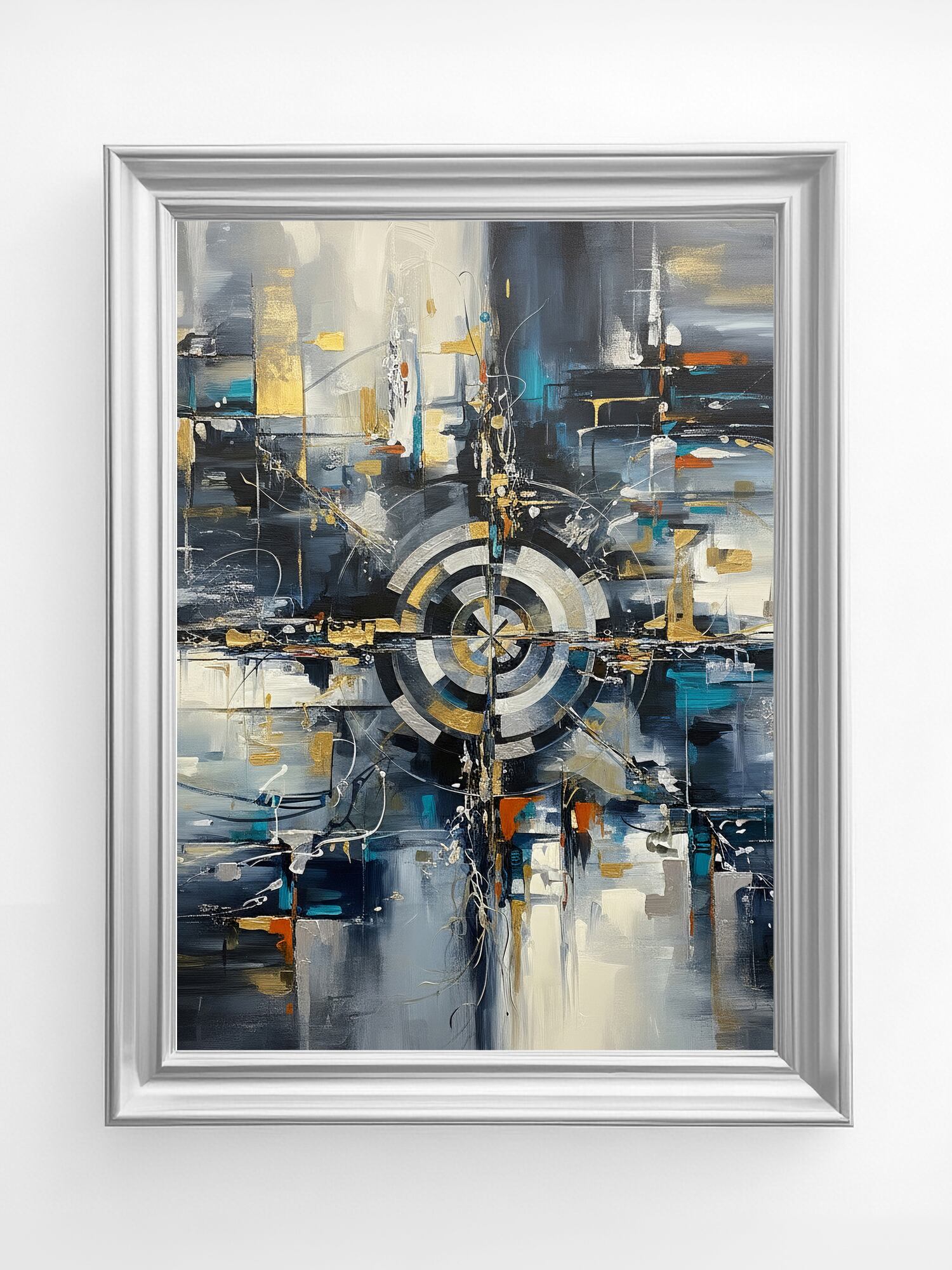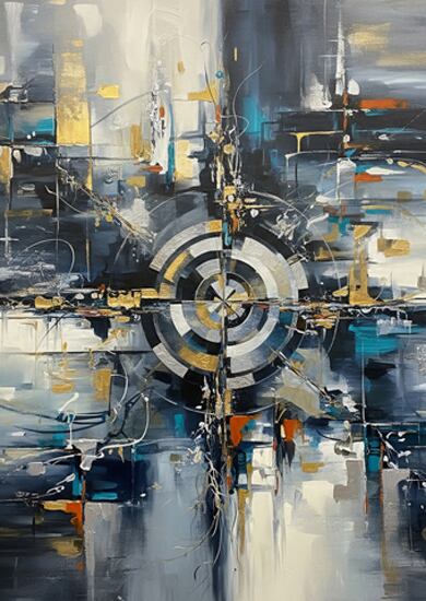 この作品は、画面中央の円形(ターゲット状)を軸に、放射状・水平・垂直の力学が複雑に絡み合うダイナミックな抽象作品です。色味はグレイ、青、黄土、少量のオレンジがアクセントとなり、対照的な色のぶつかり合いが力強さを生みます。筆致は荒々しく、スパッタやスクレイピングの痕跡が残されており、混成メディウム(混合技法)で制作されたような質感を感じさせます。中心の輪が視線を惹きつけ、周辺の線とブロックが運動を与えることで、都市的な雑音や機械的なリズムを視覚化しています。観るほどに細部の層が表情を変える、情報量の多い作品です。