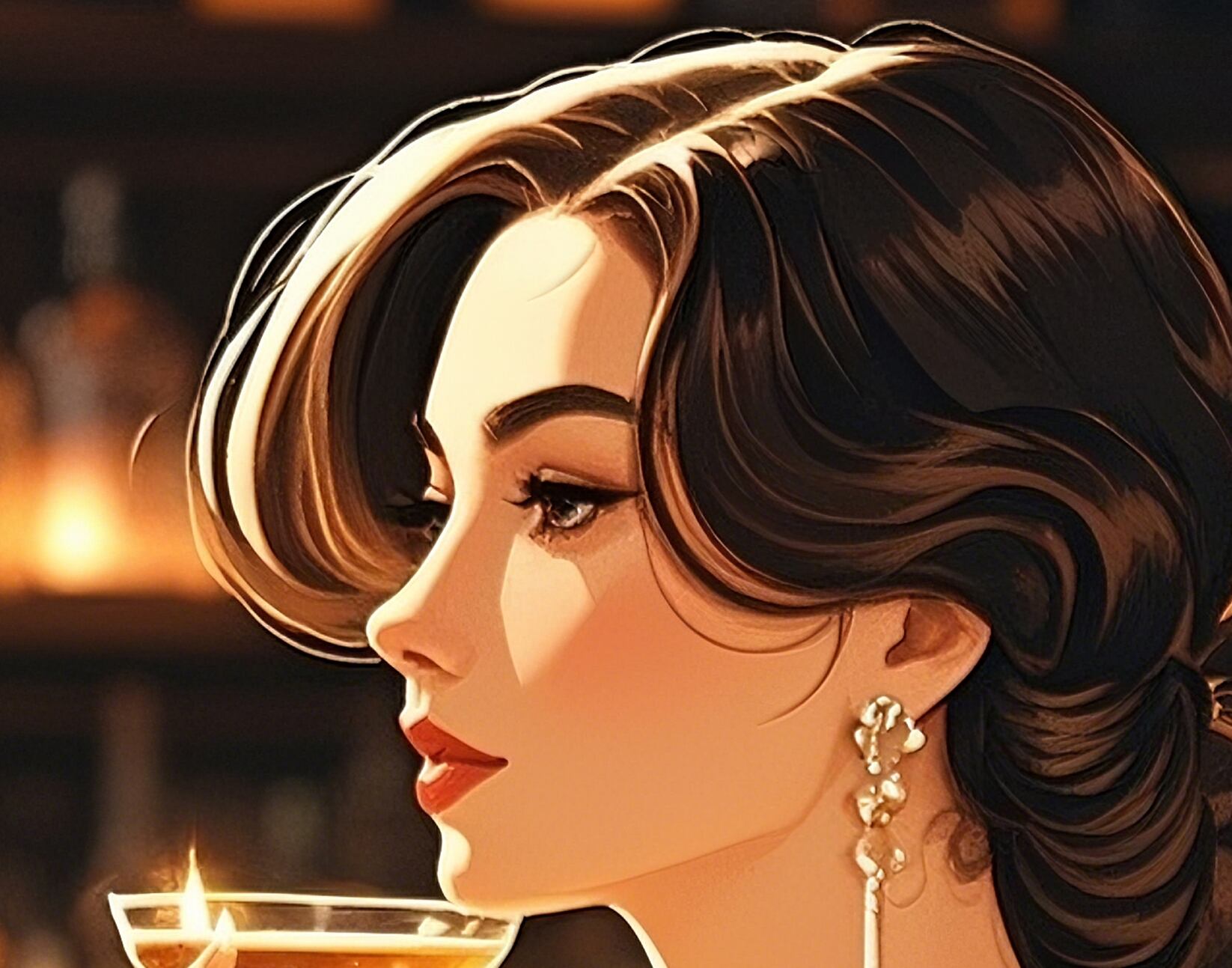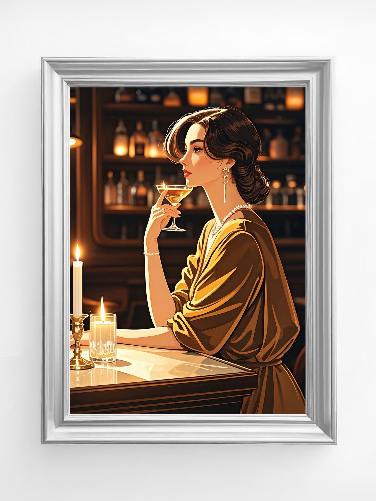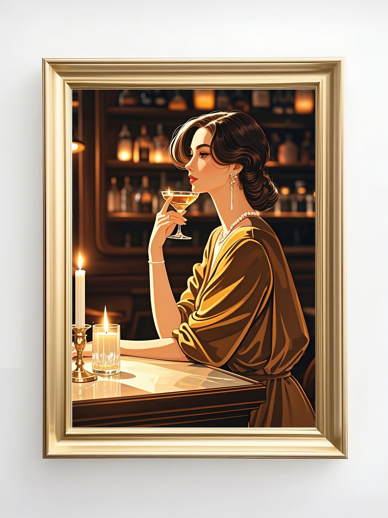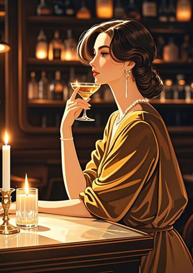 この作品は、クラシックなバーを舞台にした女性像で、温かみのある琥珀色の光と深い影のコントラストが印象的です。彼女の姿勢と視線は静かな自信と成熟した魅力を漂わせ、光沢のある布地やガラスの質感描写も非常に洗練されています。構図の中心にキャンドルの灯りを置くことで、時間の流れがゆったりと感じられ、まるで映画のワンシーンのような雰囲気を持つ作品です。