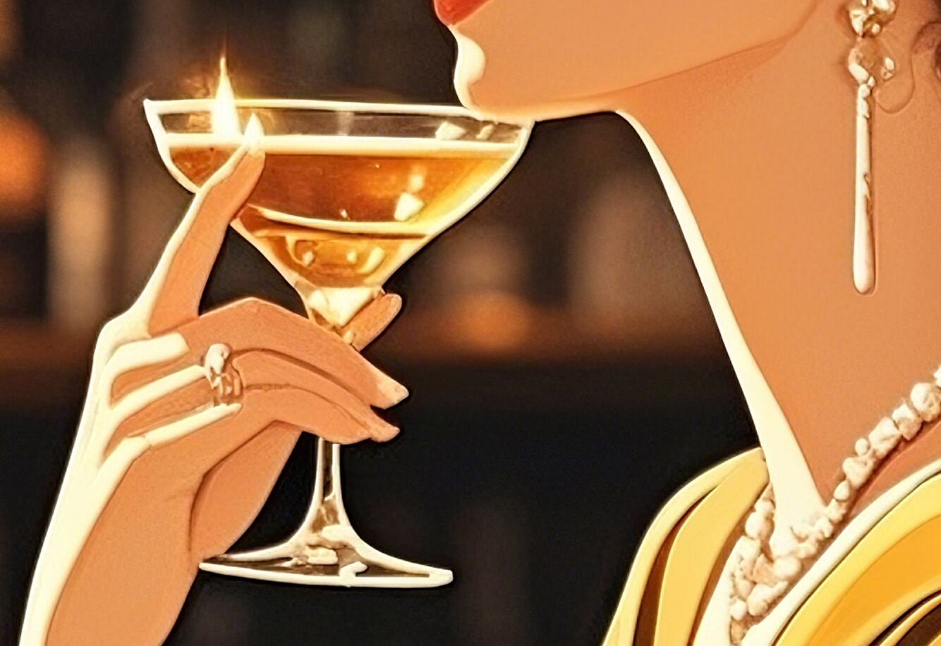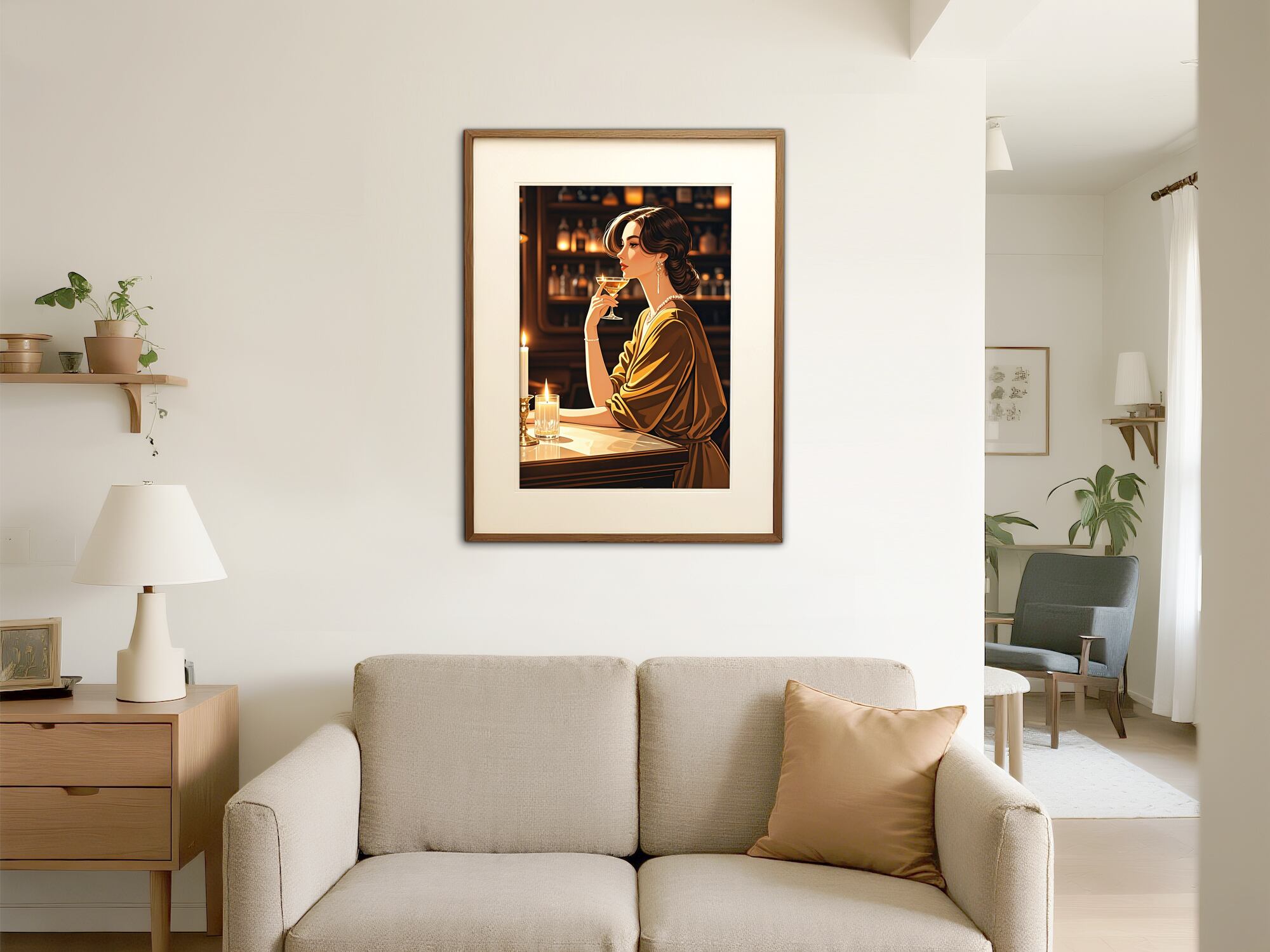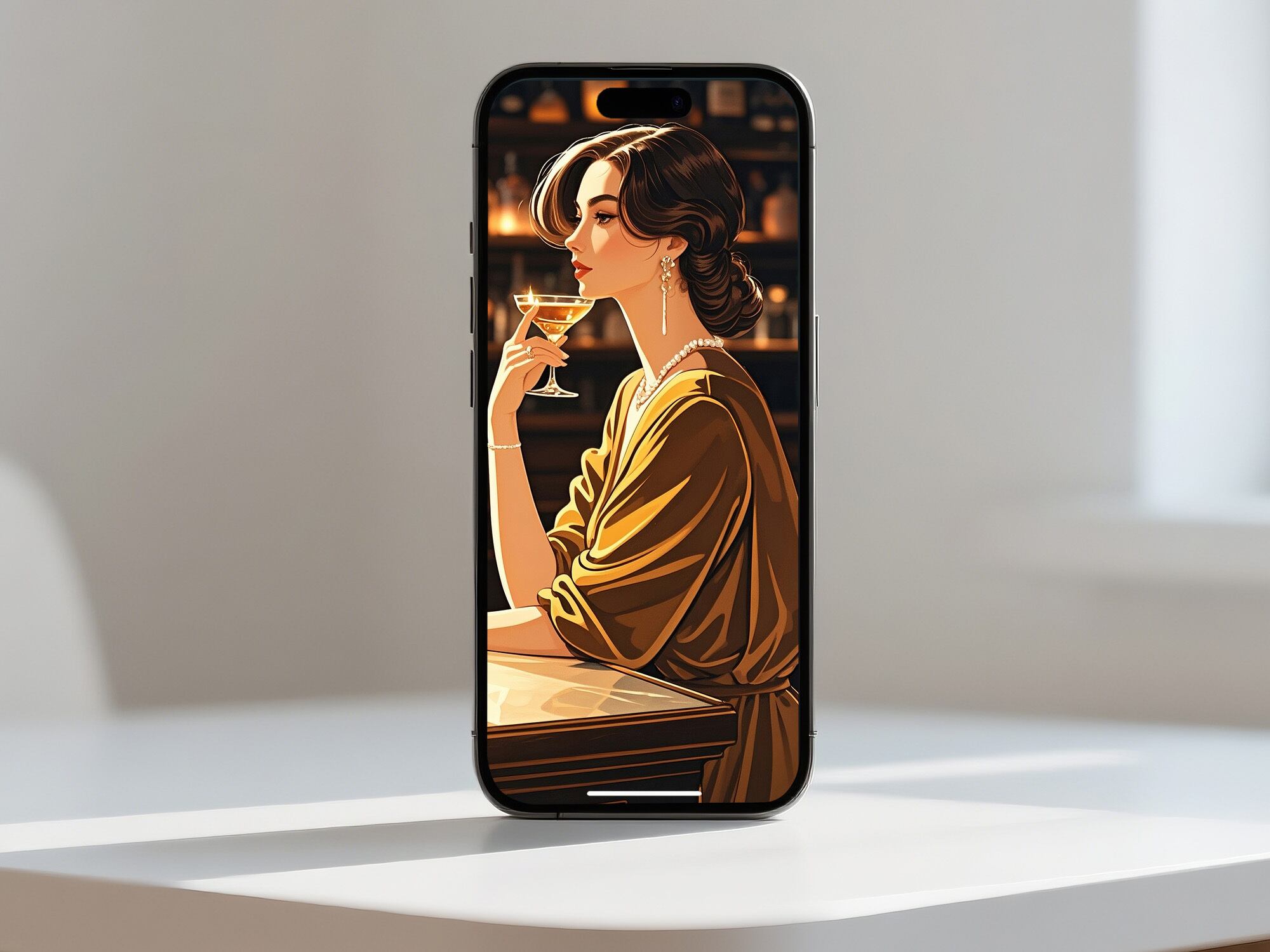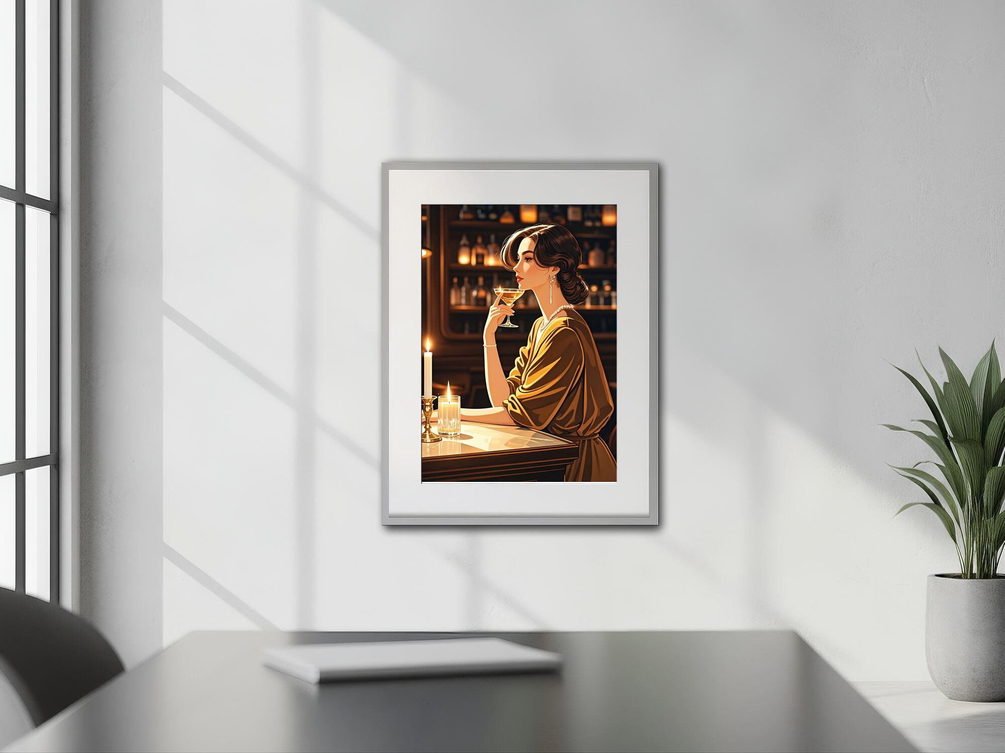 この作品は、クラシックなバーを舞台にした女性像で、温かみのある琥珀色の光と深い影のコントラストが印象的です。彼女の姿勢と視線は静かな自信と成熟した魅力を漂わせ、光沢のある布地やガラスの質感描写も非常に洗練されています。構図の中心にキャンドルの灯りを置くことで、時間の流れがゆったりと感じられ、まるで映画のワンシーンのような雰囲気を持つ作品です。