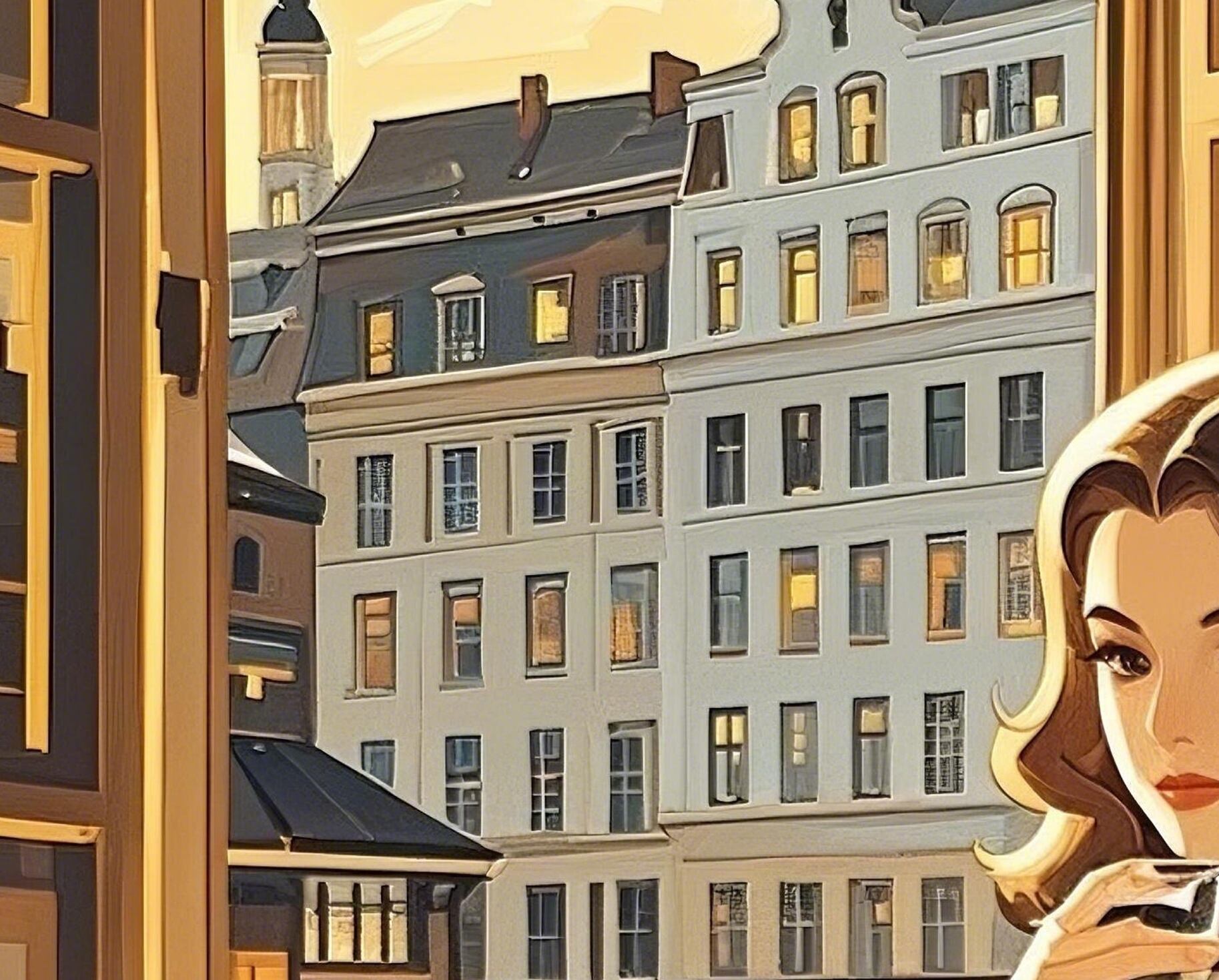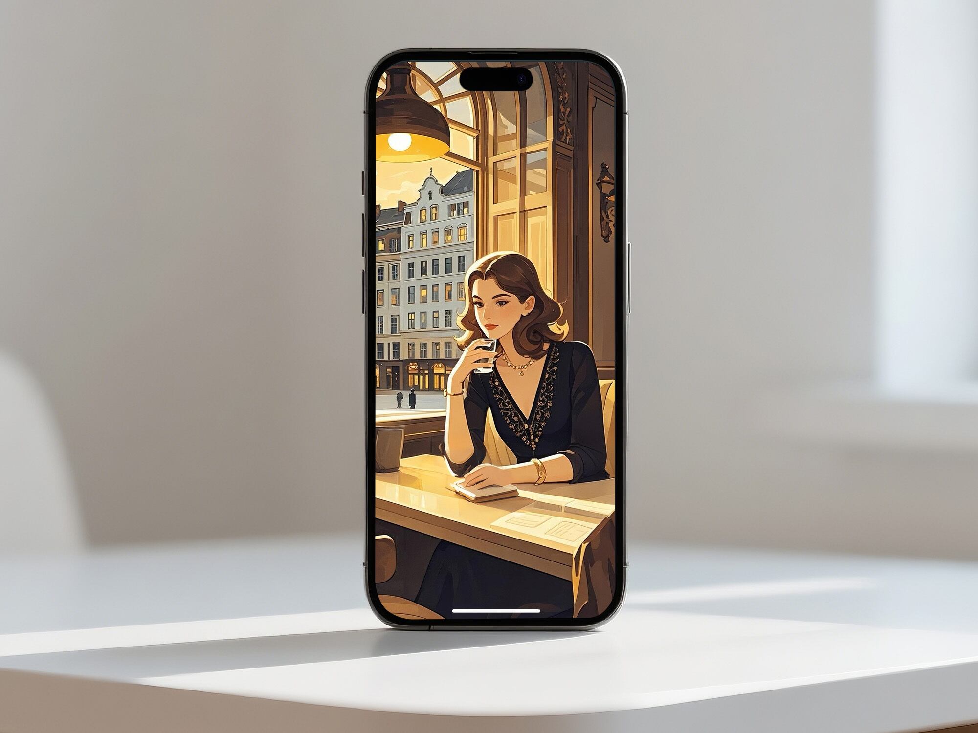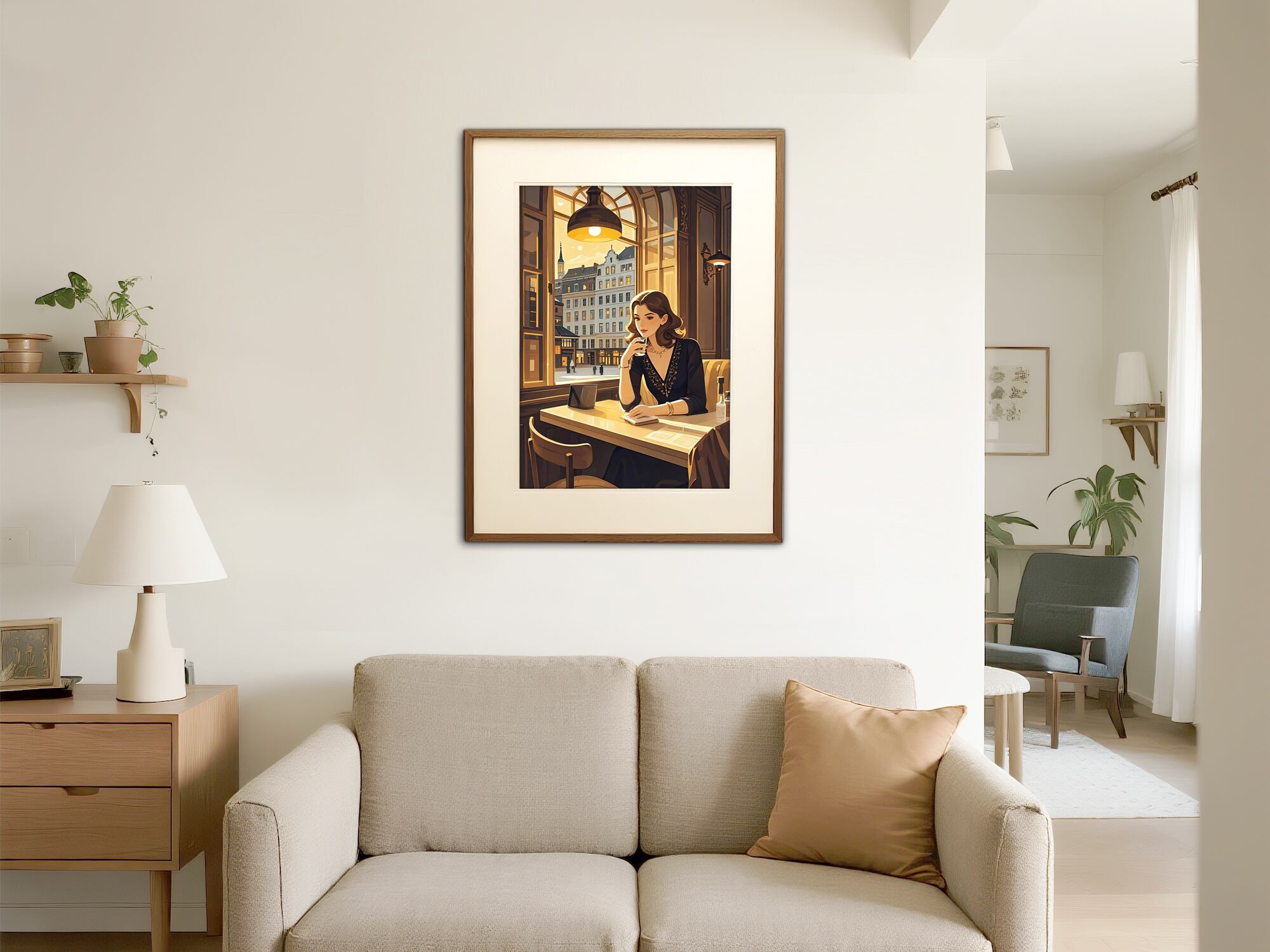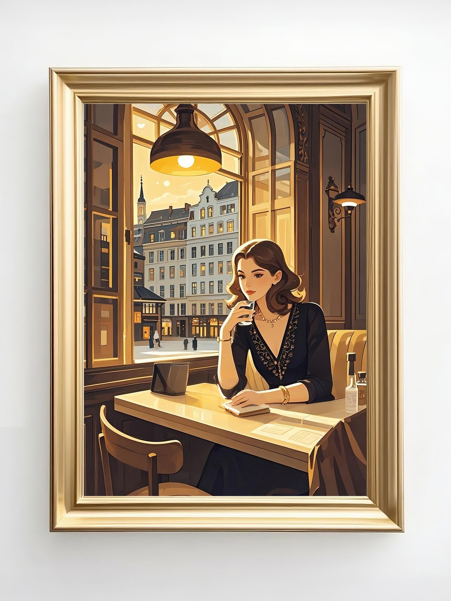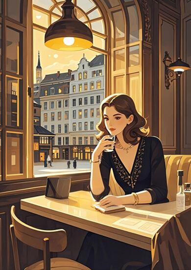 カフェに差し込む午後の光が、女性の横顔をやわらかく包み込む。高い窓と木製の内装が彼女を自然に囲み込み、視線は穏やかにその思索的な表情へと導かれる。テーブルの直線、ランプの円弧、ジュエリーの微かな光沢──それらすべてが静謐な均衡を保ち、時間の流れをゆるやかに止めているようだ。琥珀色とコーヒー色を基調とした温かな色彩は、どこか懐かしく上品で、窓外の街並みはまるで遠い記憶のように霞んで見える。この作品は単なる人物画ではなく、光と静寂、そして内なる思いを描いたひとつの詩のように感じられる。