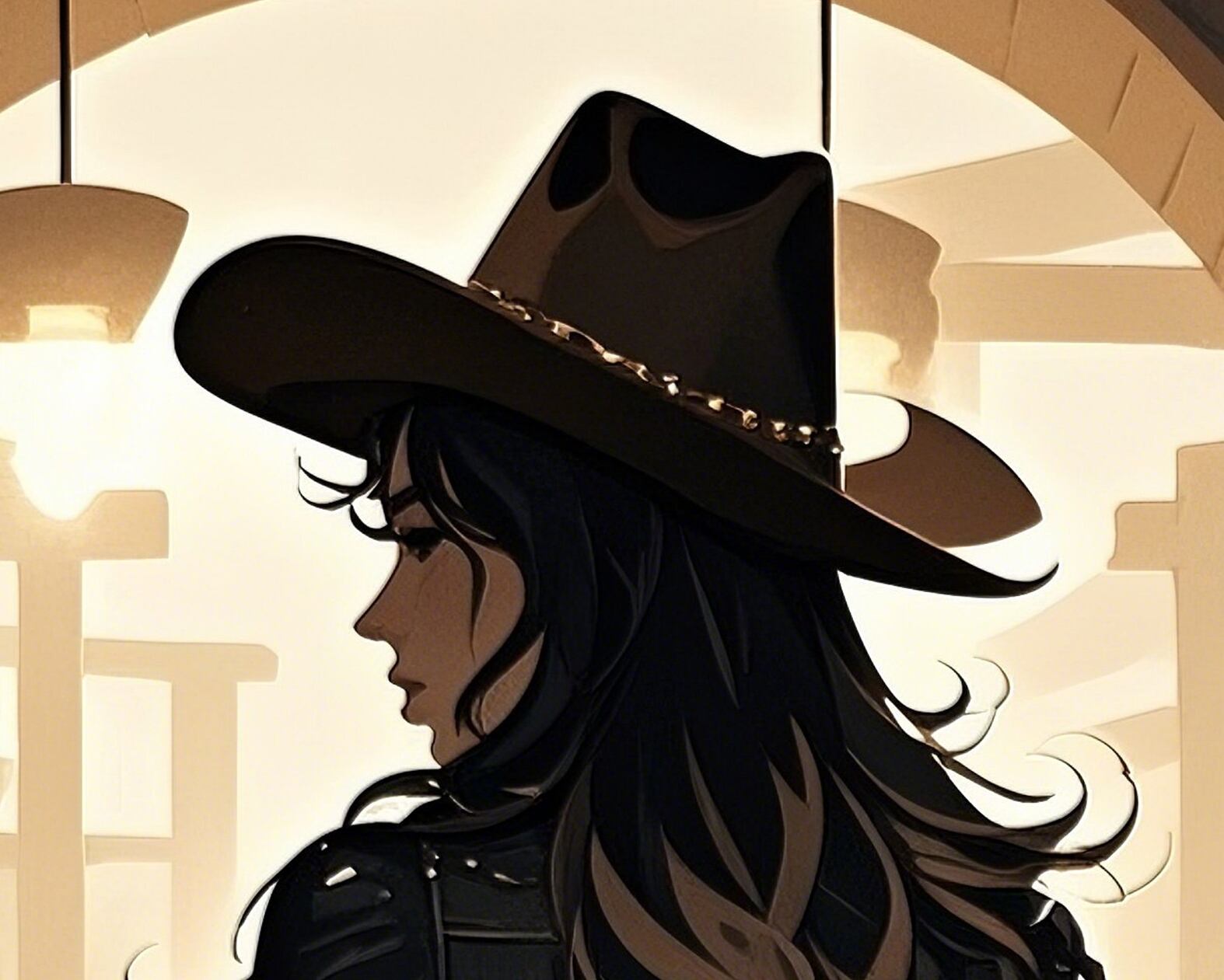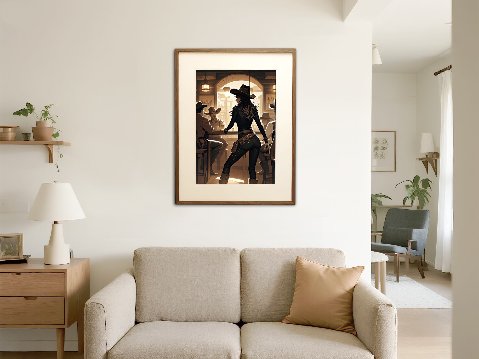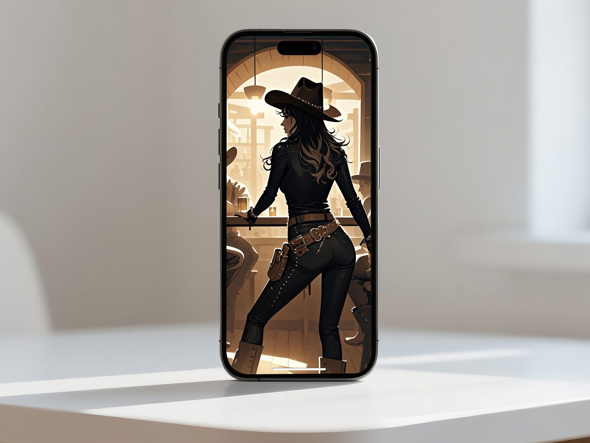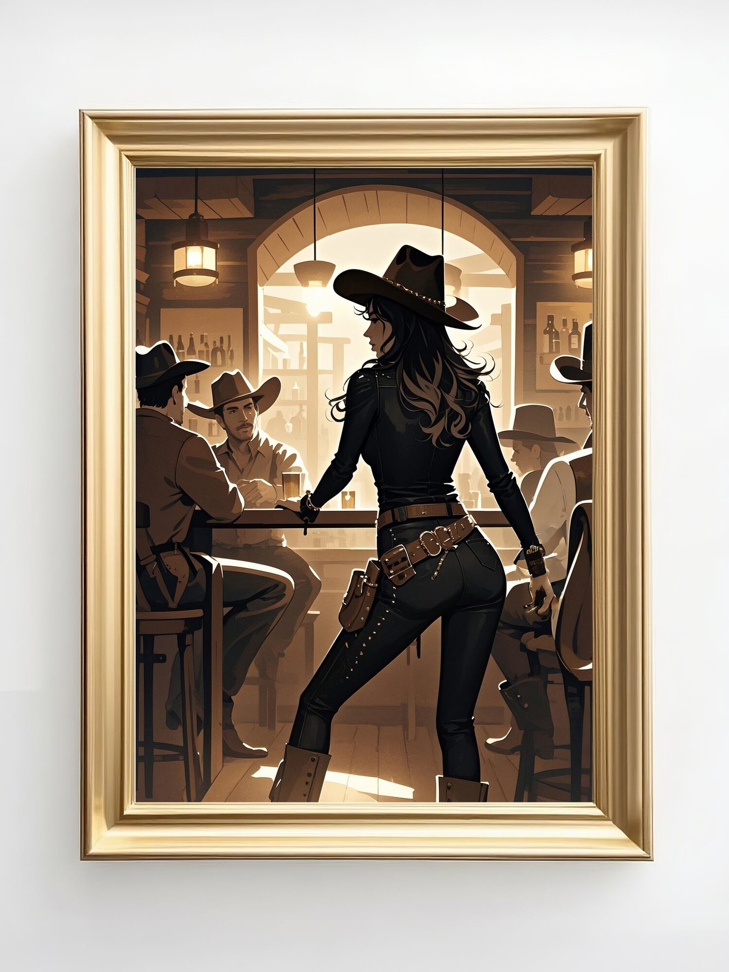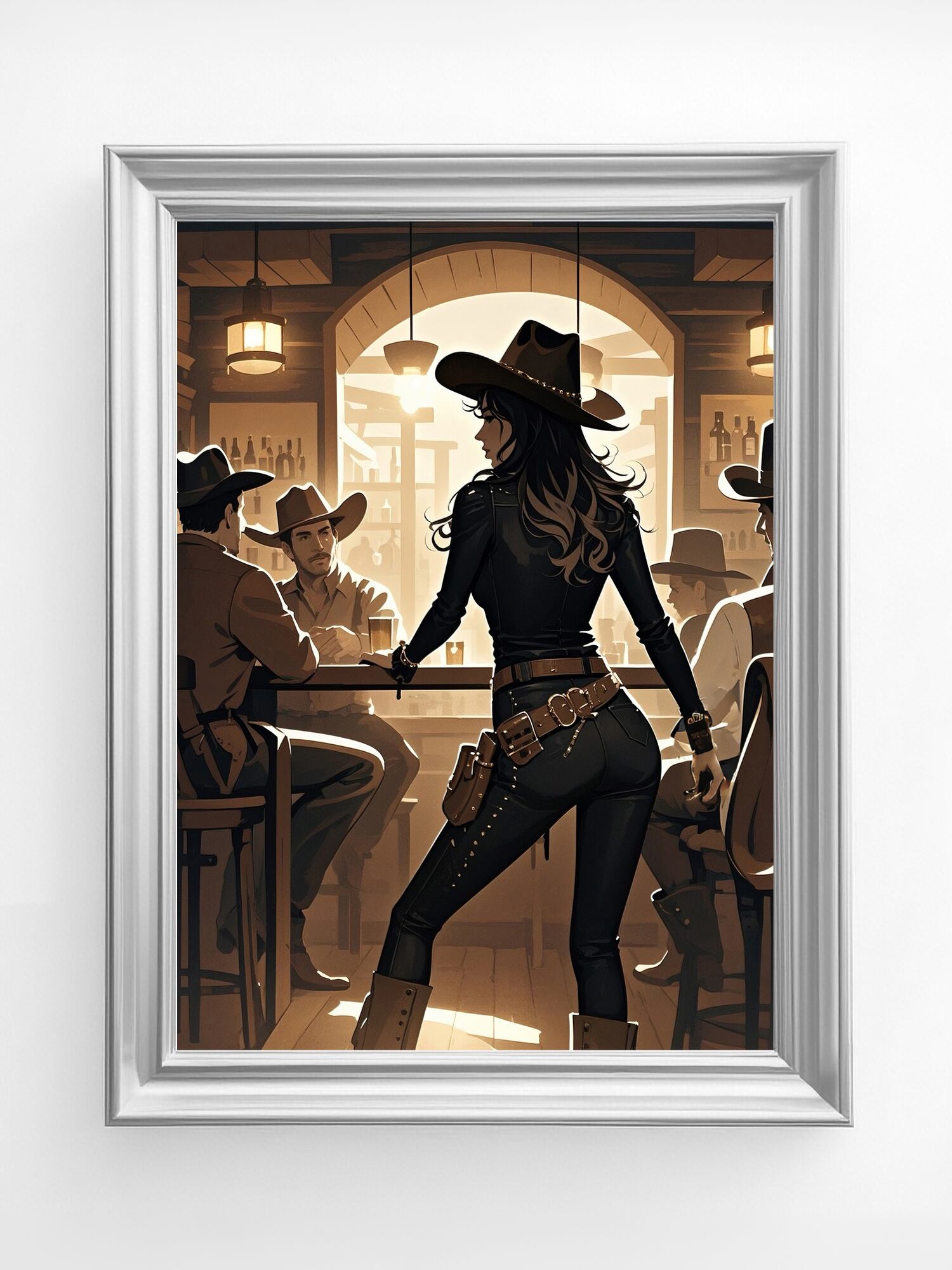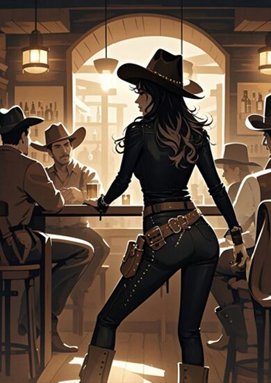力強く映画的なこの作品は、西部の酒場で繰り広げられる緊張感と力の構図を見事に捉えている。立ち尽くす一人の女性が、座る男たちを背に堂々と構える姿は圧倒的な存在感を放ち、暖かな光と木造の室内が彼女のシルエットを際立たせる。セピア調の限られた色使いが時代の空気を漂わせ、縁取る光が緊張と謎めいた雰囲気を添えている。帽子の角度や腰のライン、拳の位置まですべてが物語を語り、強さと独立を象徴している。行動の直前のような静止した瞬間に満ちる張り詰めた空気が、西部劇と現代的な物語性を融合させている。