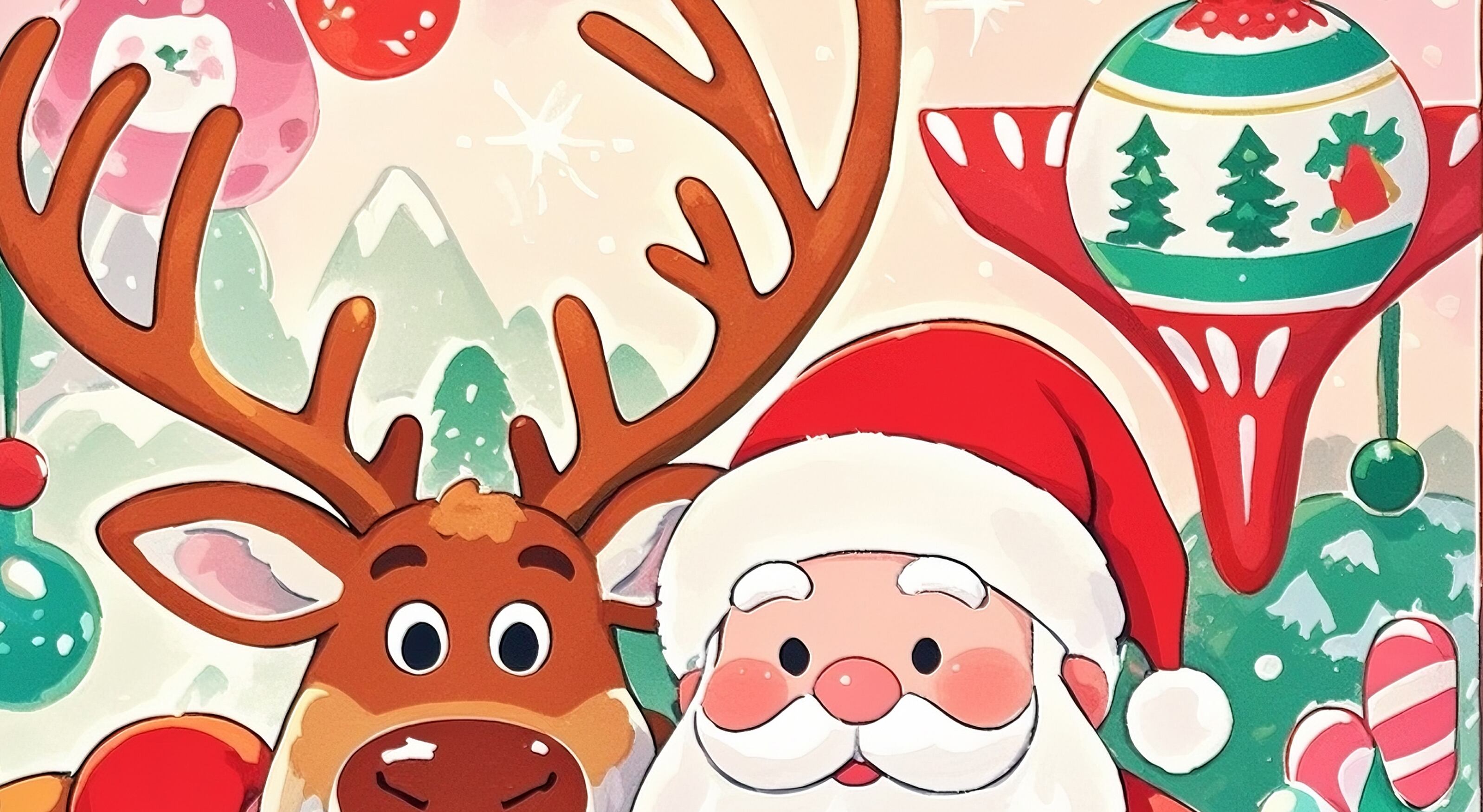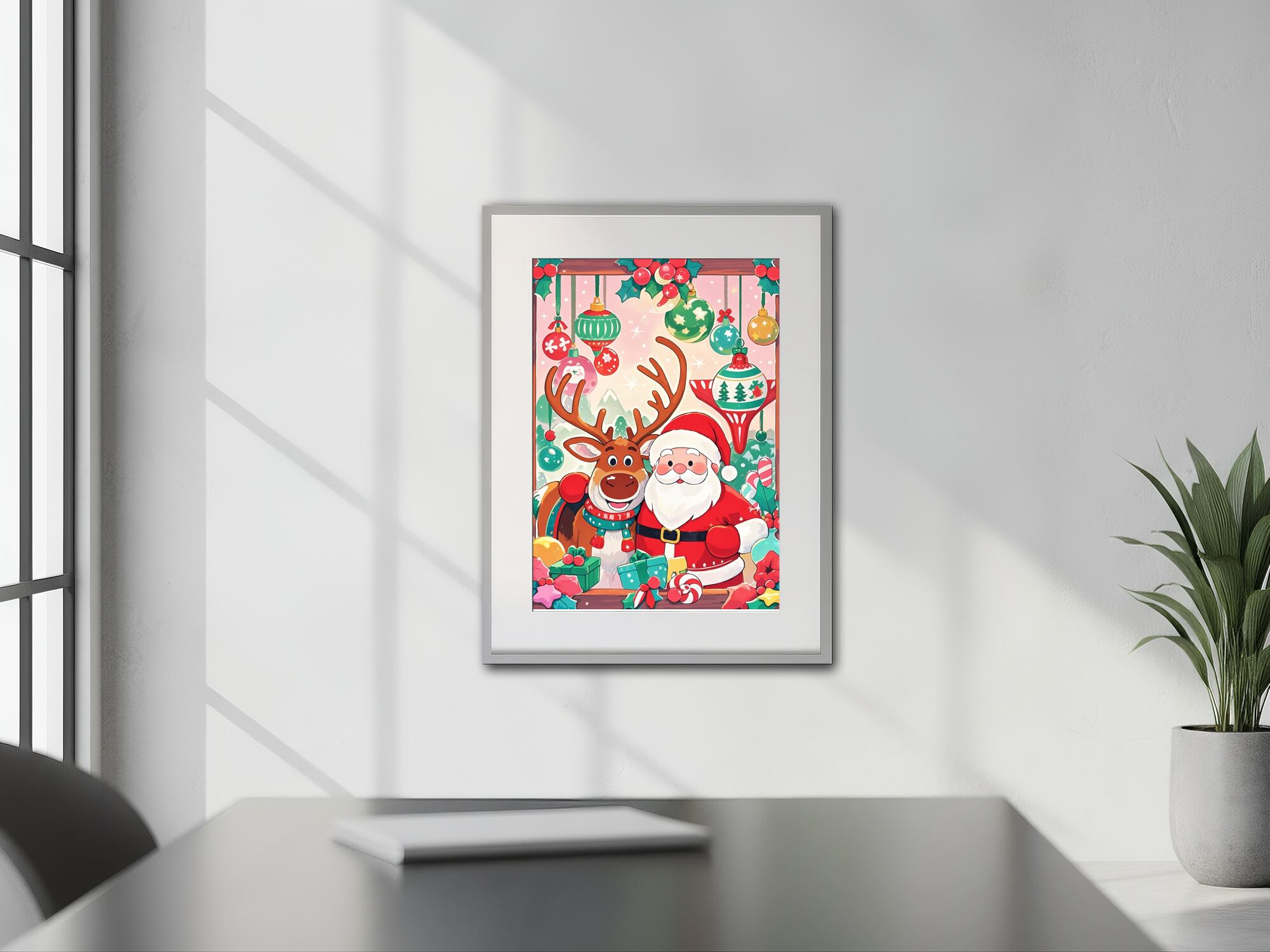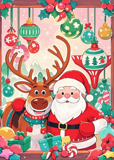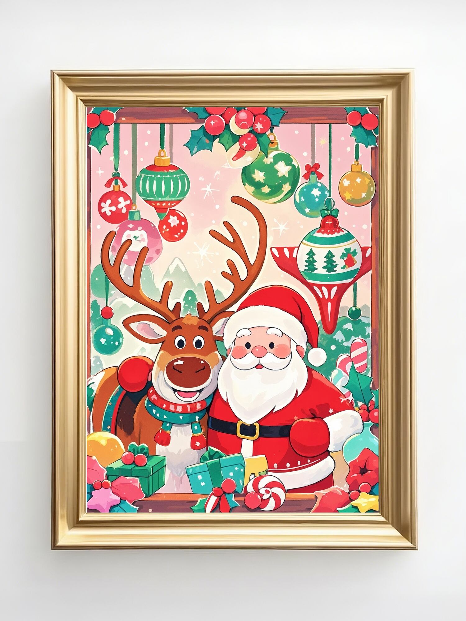 クリスマス工房を思わせる色鮮やかな背景で、サンタとトナカイが楽しげに微笑む華やかな一枚です。オーナメントやキャンディなど、細部まで描きこまれた装飾がクリスマスらしい高揚感を引き立てます。明るくポップな印象で、壁を一瞬で賑やかなホリデームードに変えてくれるアートです。