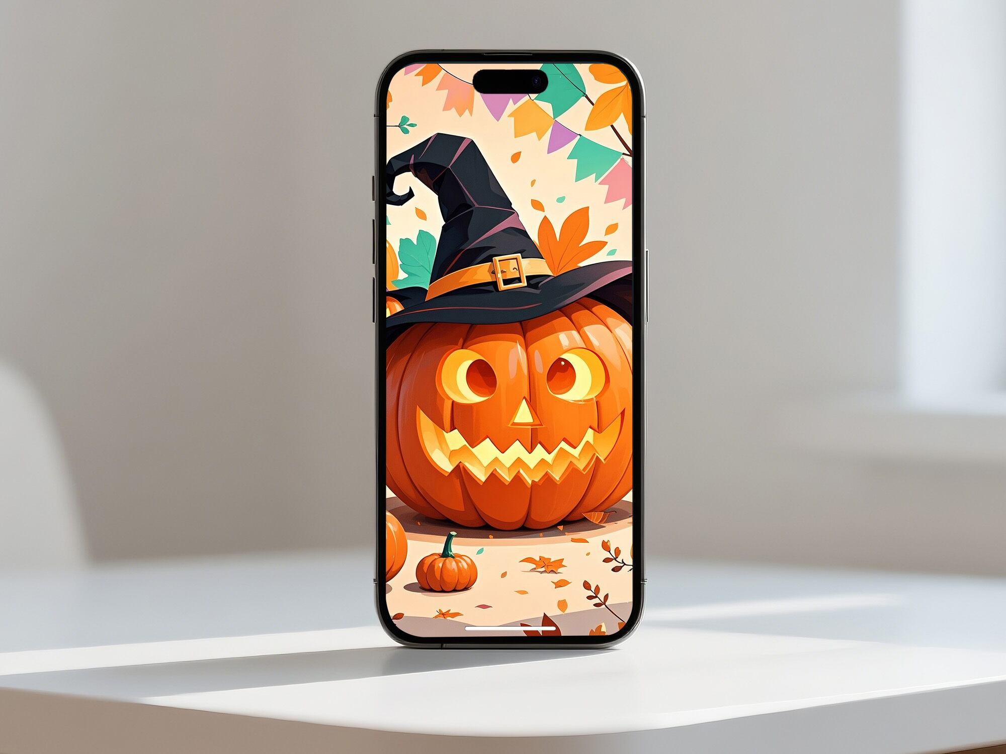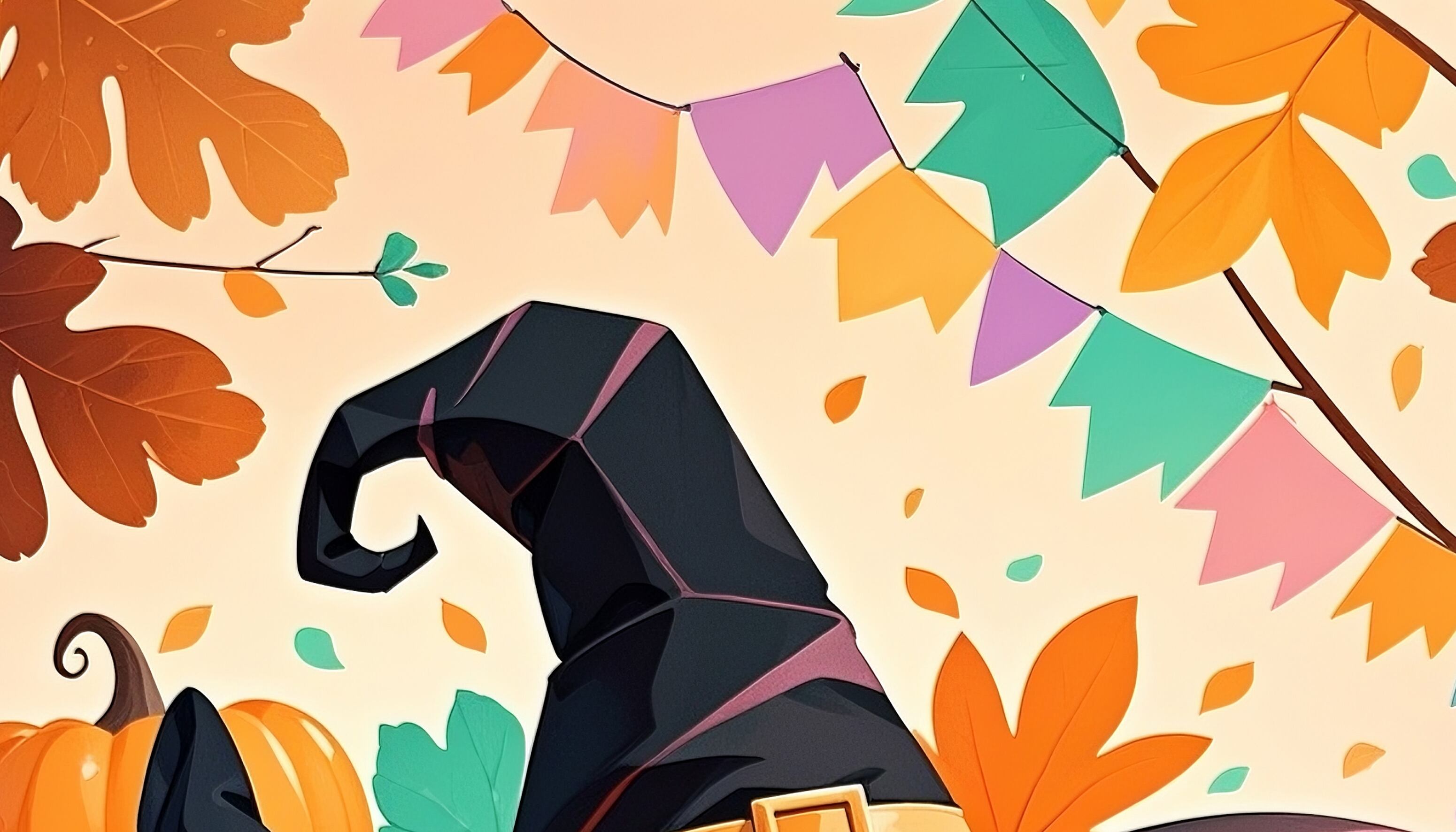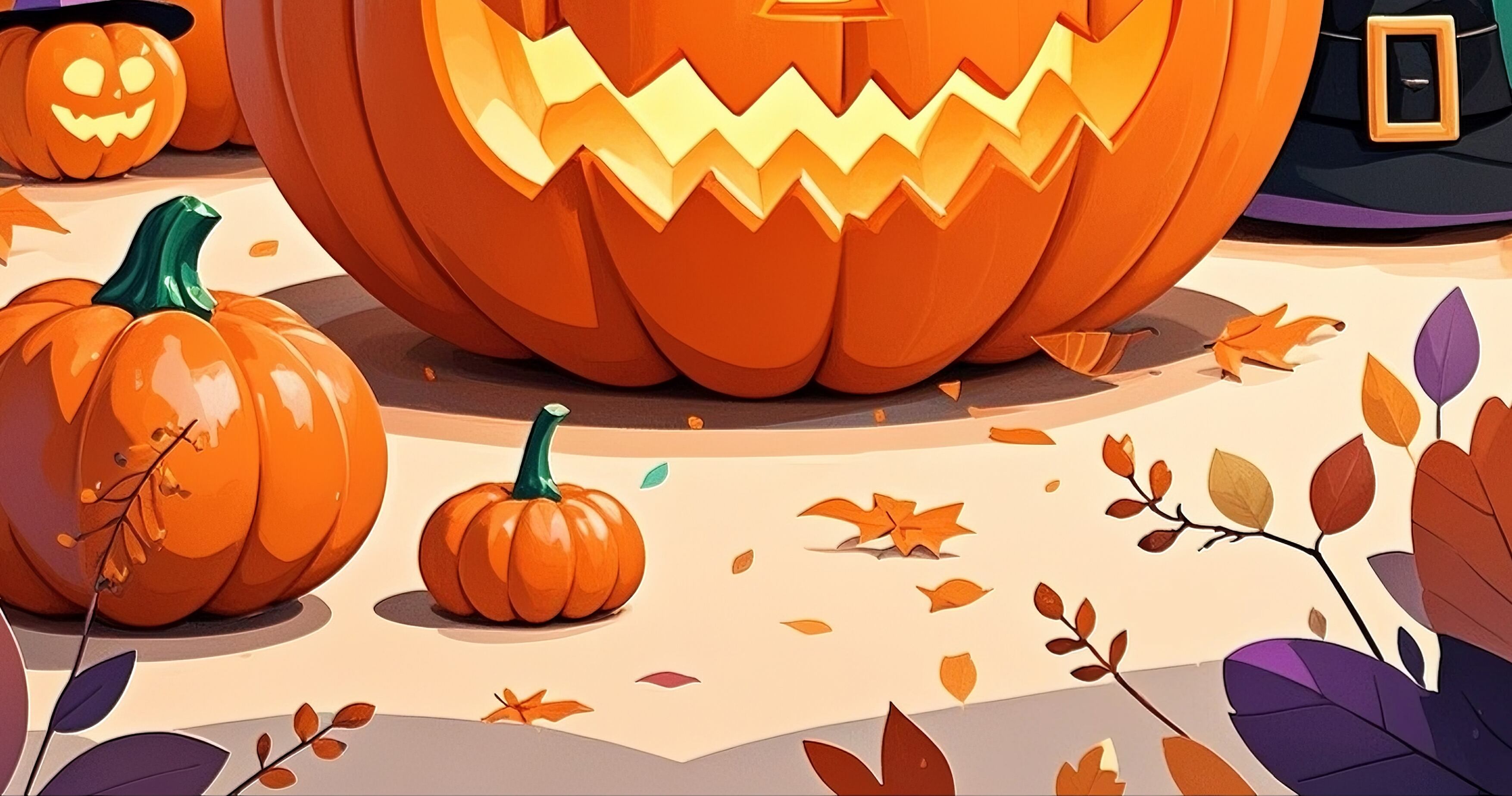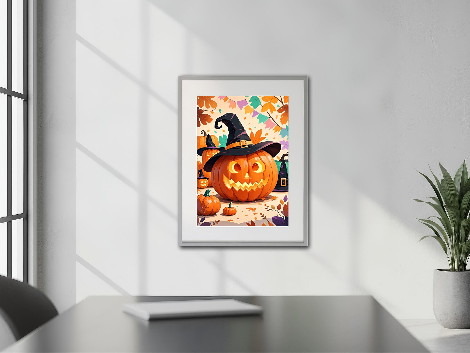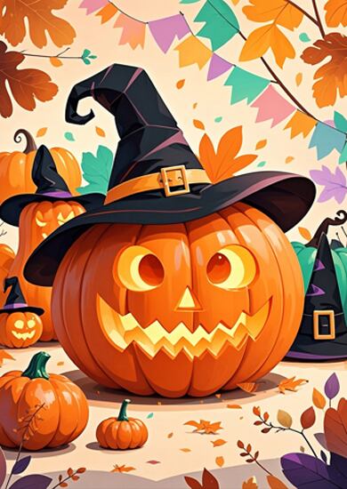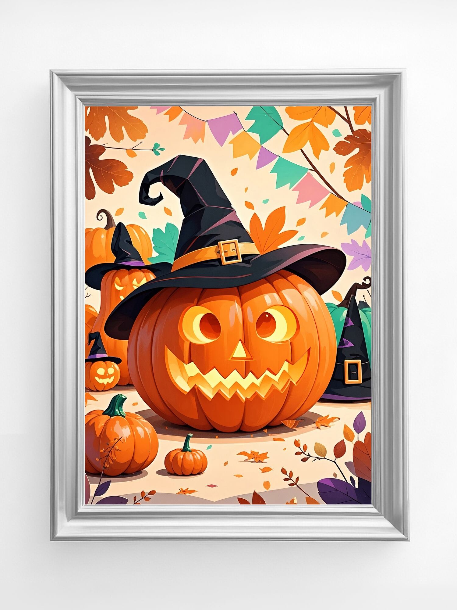 大きなジャックオーランタンが主役となり、色とりどりの落ち葉と魔女帽子が季節感を高める一枚です。鮮やかなオレンジの光が、ほっこりとした温もりとハロウィンらしい賑やかさを演出しています。背景の秋葉が柔らかく舞い、室内外どちらのインテリアにも馴染みやすいデザインです。可愛さと季節感を両立した、幅広い層に愛されるハロウィンアートとしておすすめです。
