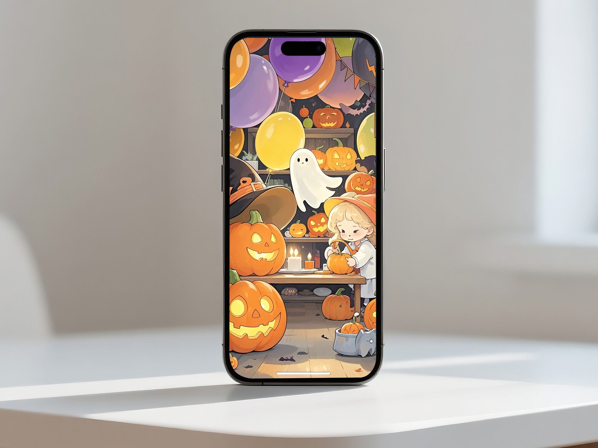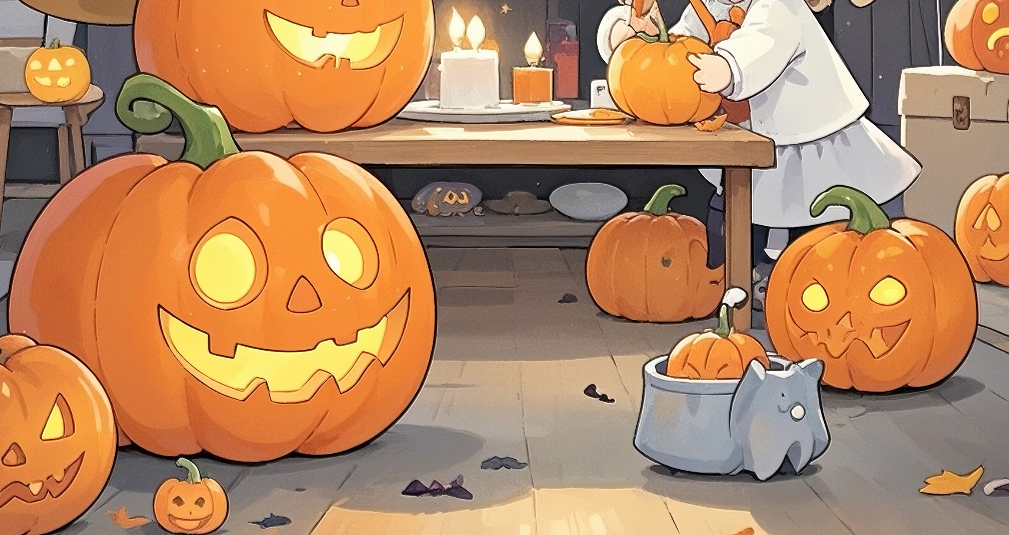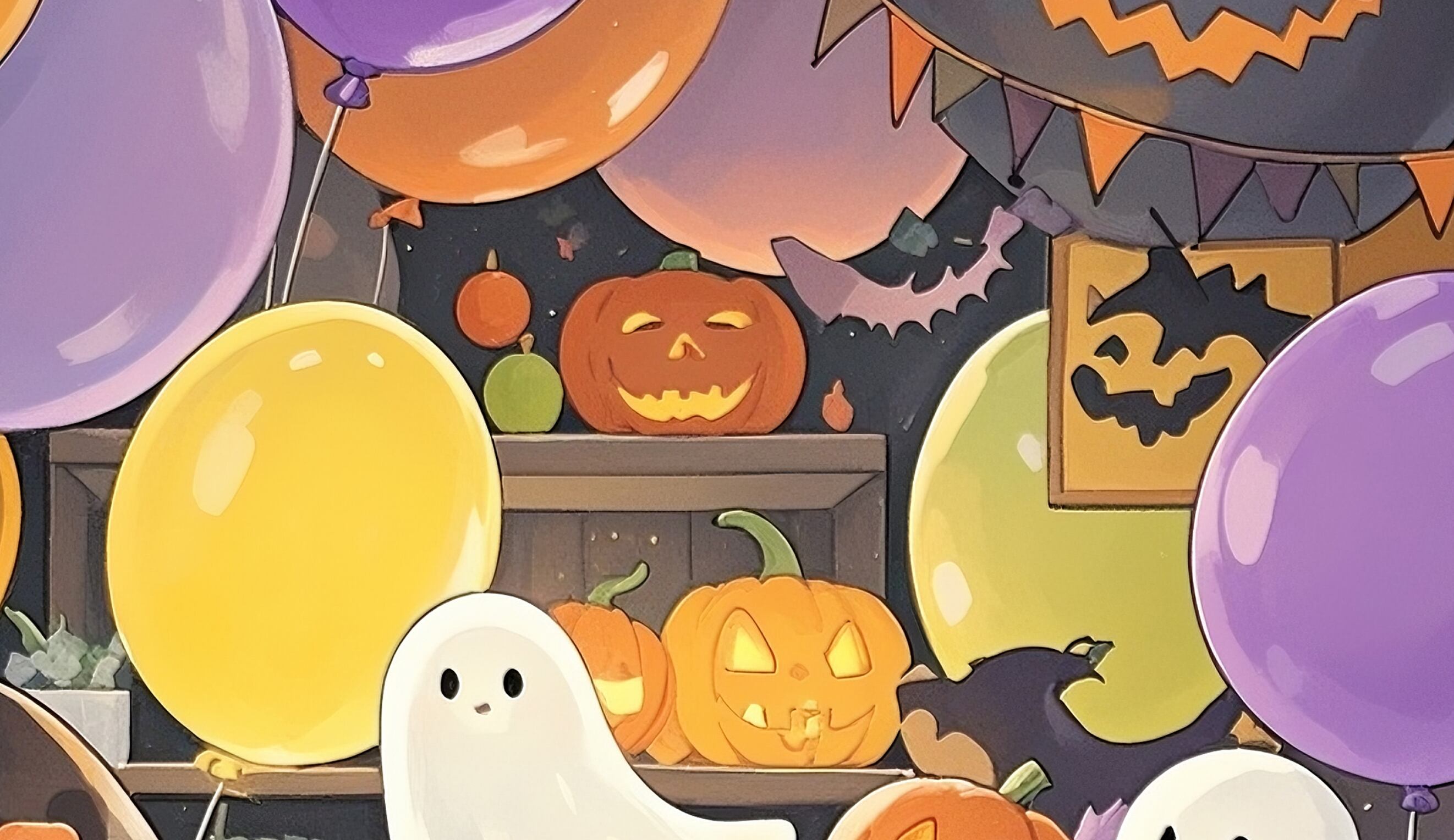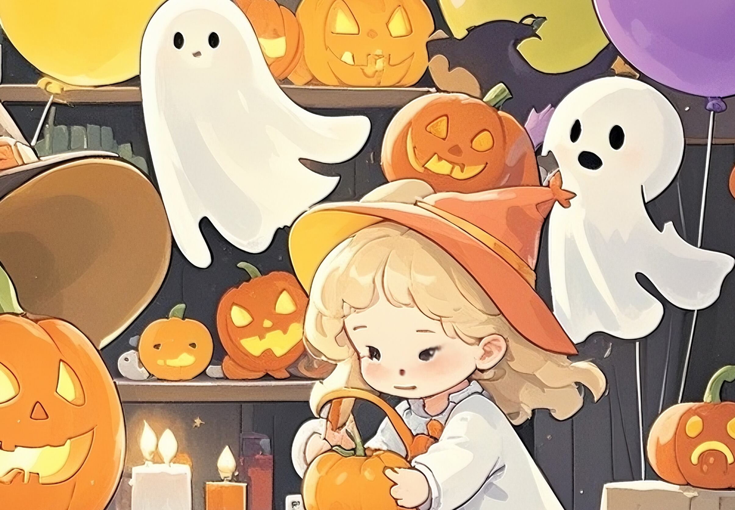 少女がジャックオーランタンに灯をともす、心温まる物語性のある作品です。周囲にはバルーンや可愛いゴースト、大小のかぼちゃが並び、賑やかさと優しさがバランスよく調和しています。ハロウィンの楽しさを柔らかい光で表現した、キッズ向け・ファミリー向けのインテリアに最適な温もりあるイラストです。