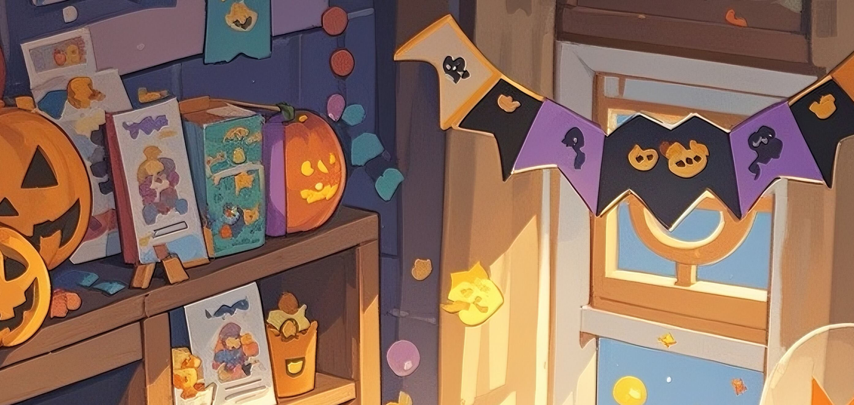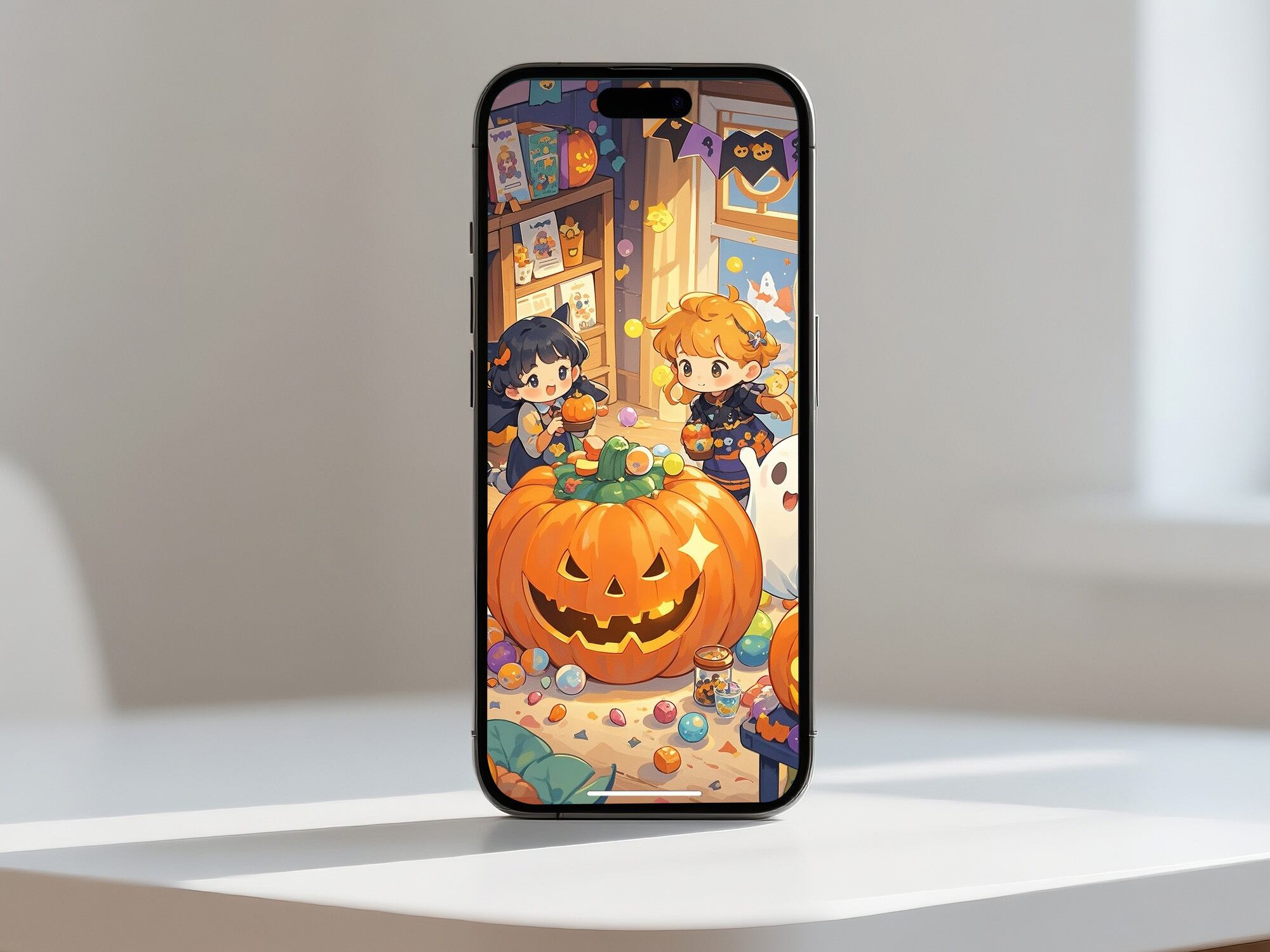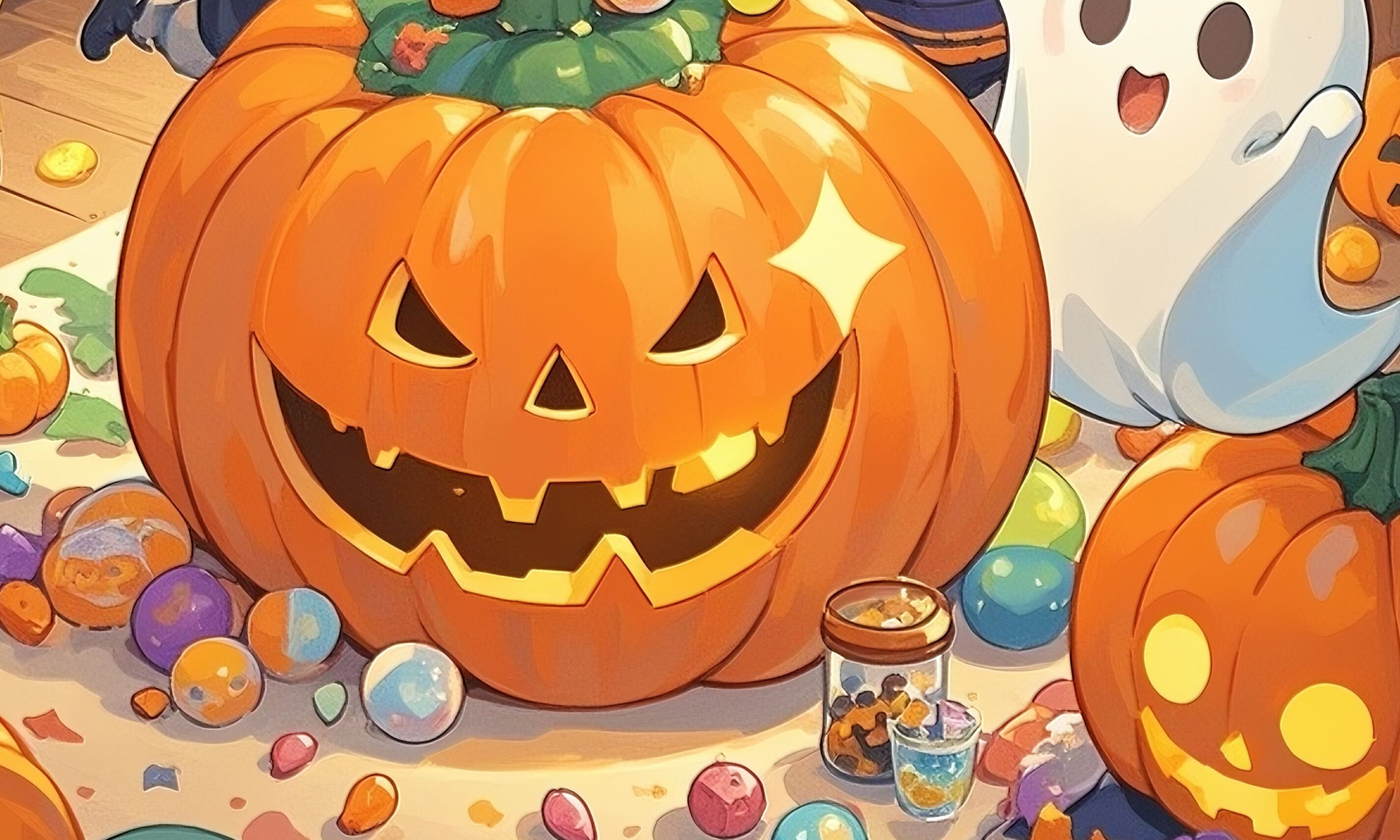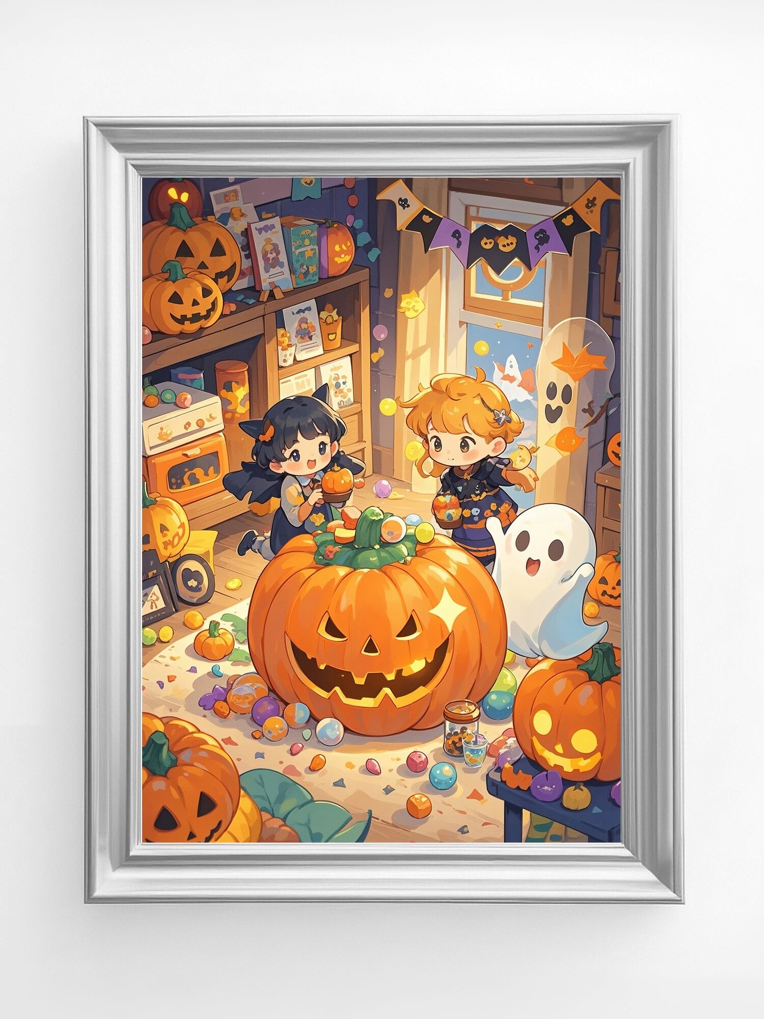 子どもたちがかぼちゃの巨大キャンディポットを囲む可愛らしい一枚です。色とりどりのお菓子や雑貨が配置され、ハロウィンのワクワク感がぎゅっと詰まっています。明るい色彩がインテリアの差し色としても映え、ショップの季節装飾としての使用にも適しています。遊び心たっぷりの魅力的な作品です。