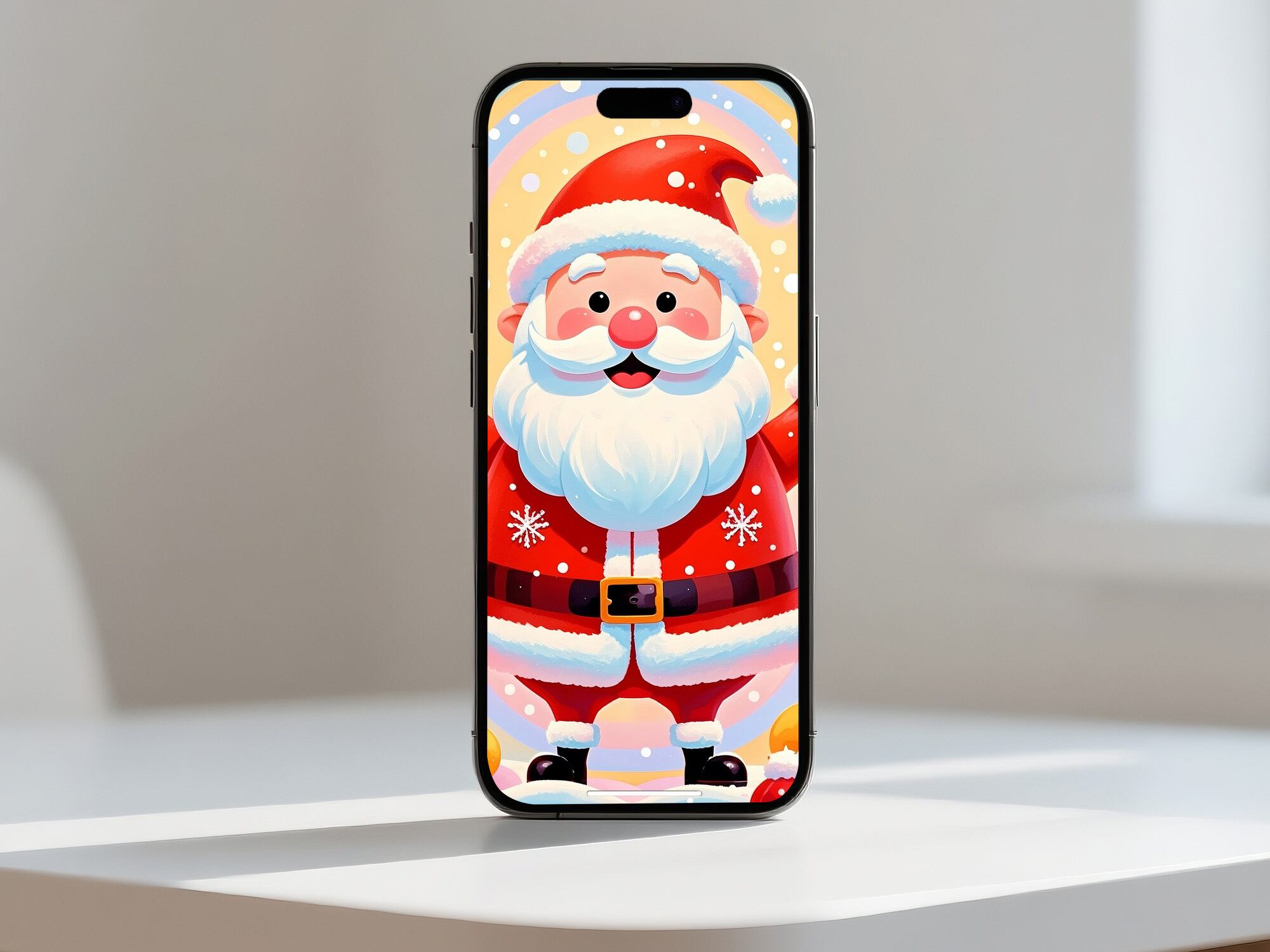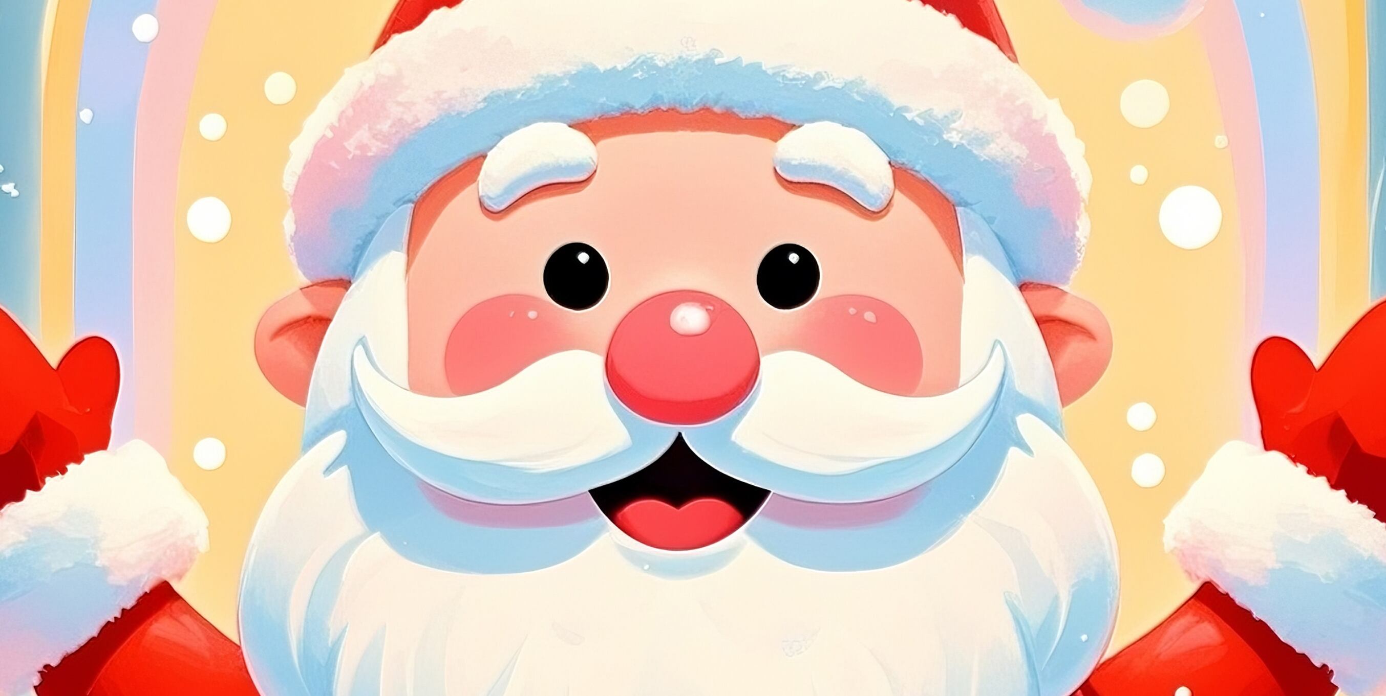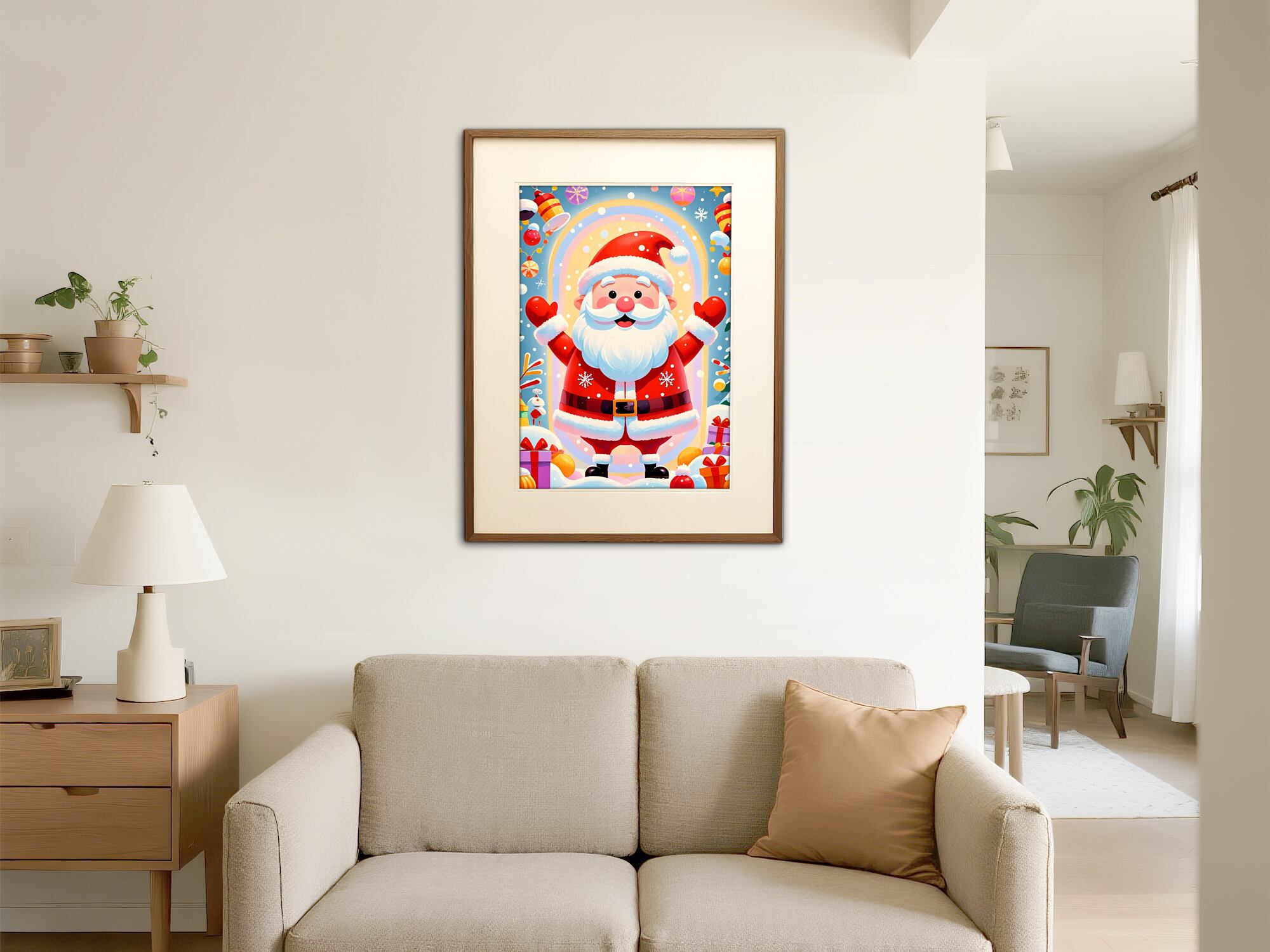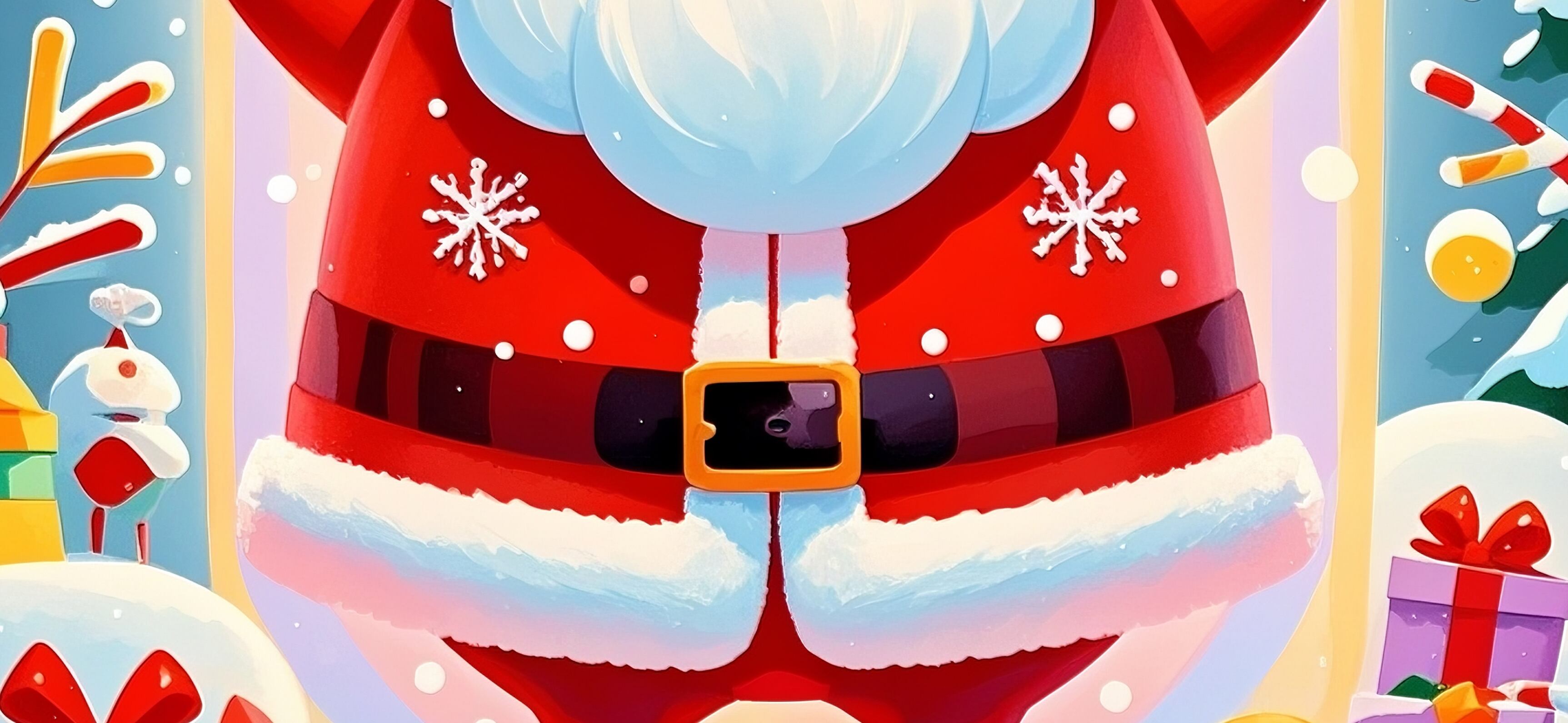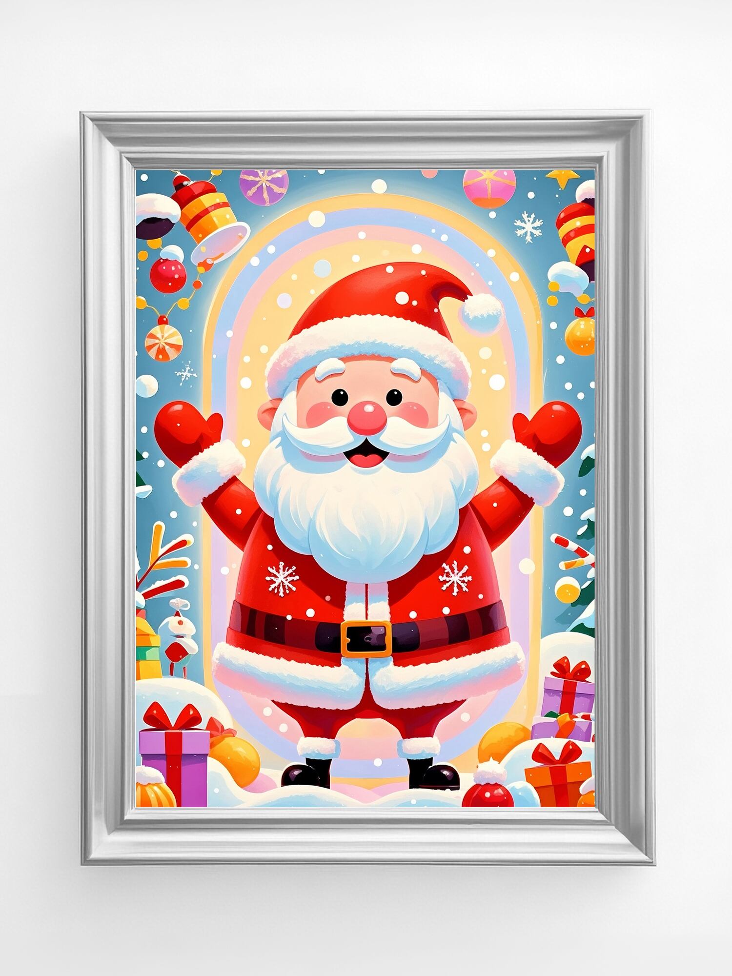 満面の笑みで両手を広げたサンタが、祝福のような光に包まれた明るいイラストです。カラフルでポップな世界観は、見るだけで楽しい気持ちにしてくれます。子ども部屋や、ポップな空間づくりに非常に向いており、クリスマスデコレーションとしても強い存在感を放ちます。