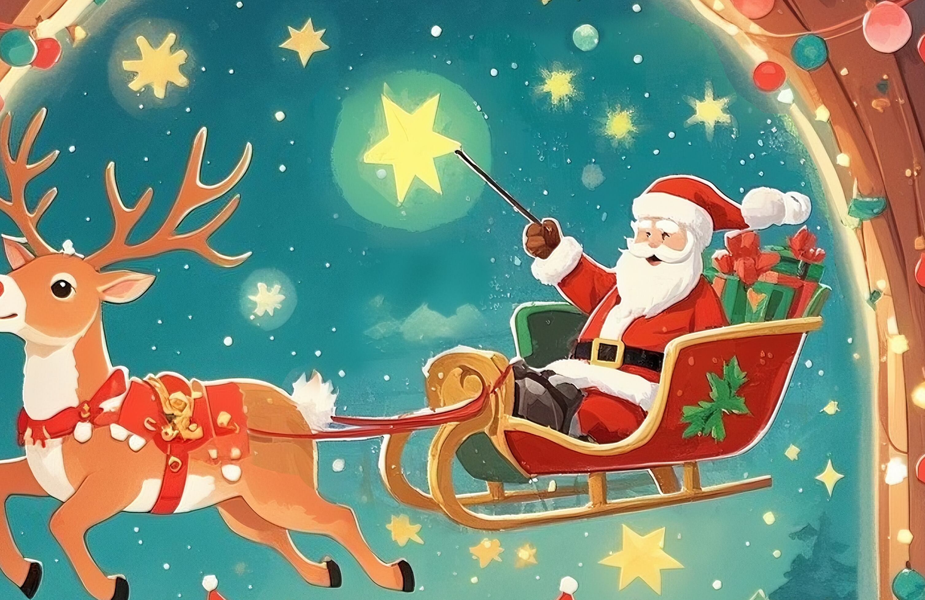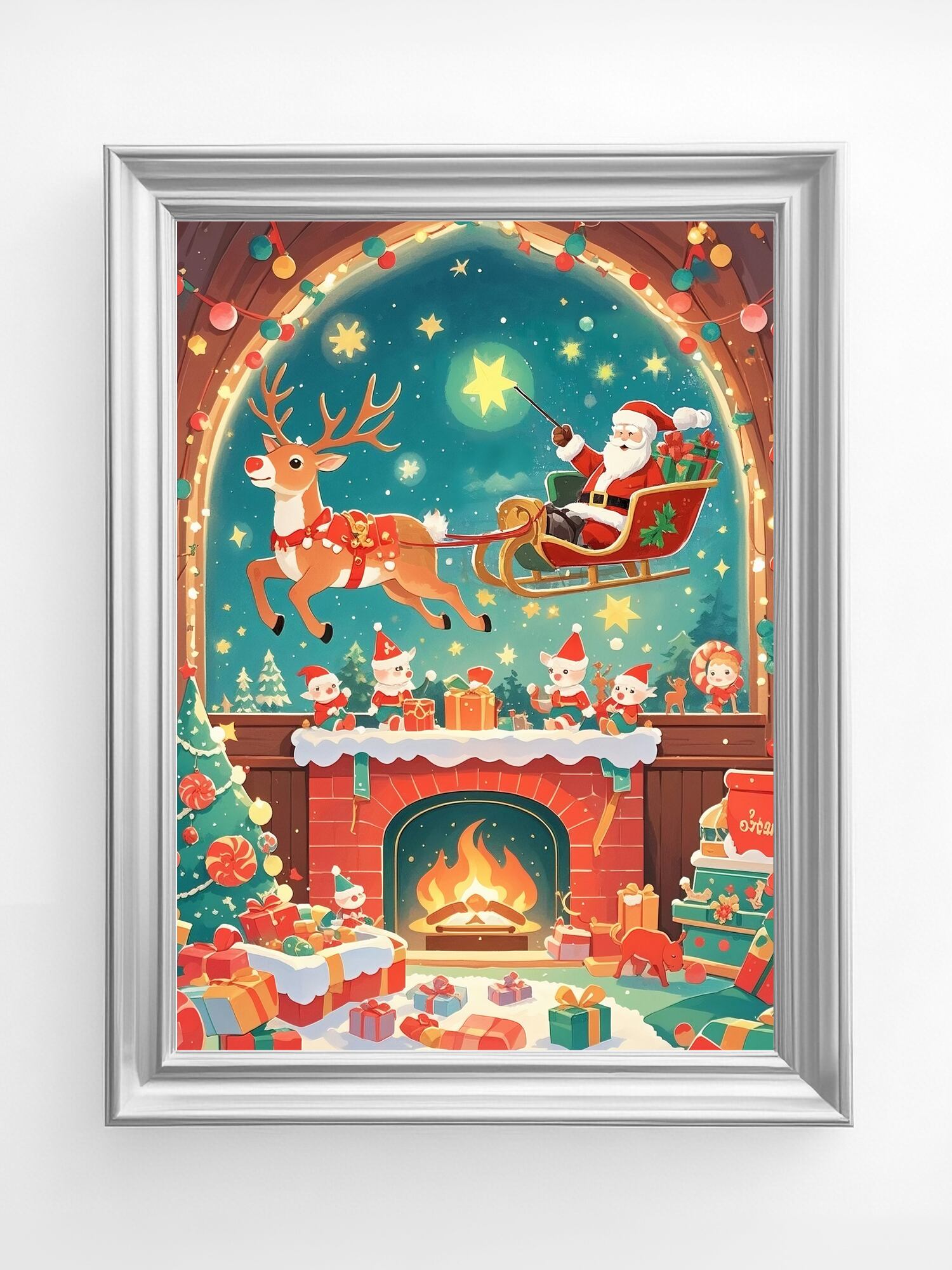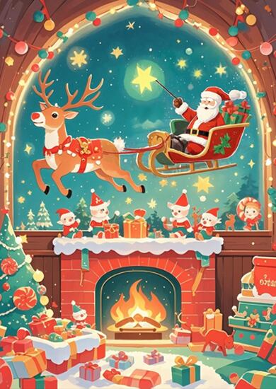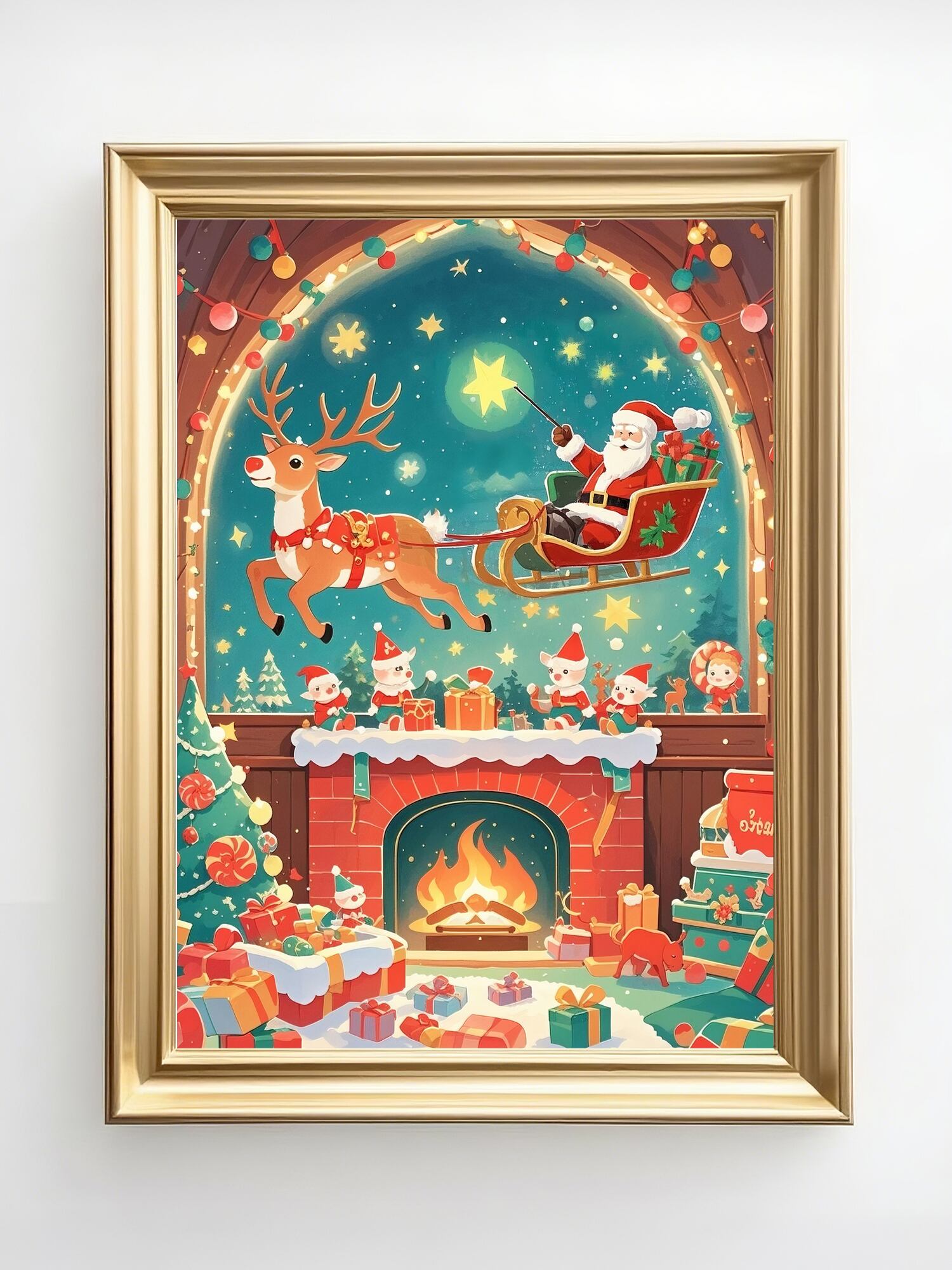 暖炉の灯りが揺れる部屋の窓の向こうで、サンタがトナカイのそりに乗り夜空を駆ける幻想的な一枚です。色彩も構図も美しく、クリスマスの魔法を感じられる作品です。物語性の高い世界観に惹き込まれ、クリスマス装飾として主役級の存在感を放ちます。プレゼントにも喜ばれる完成度です。