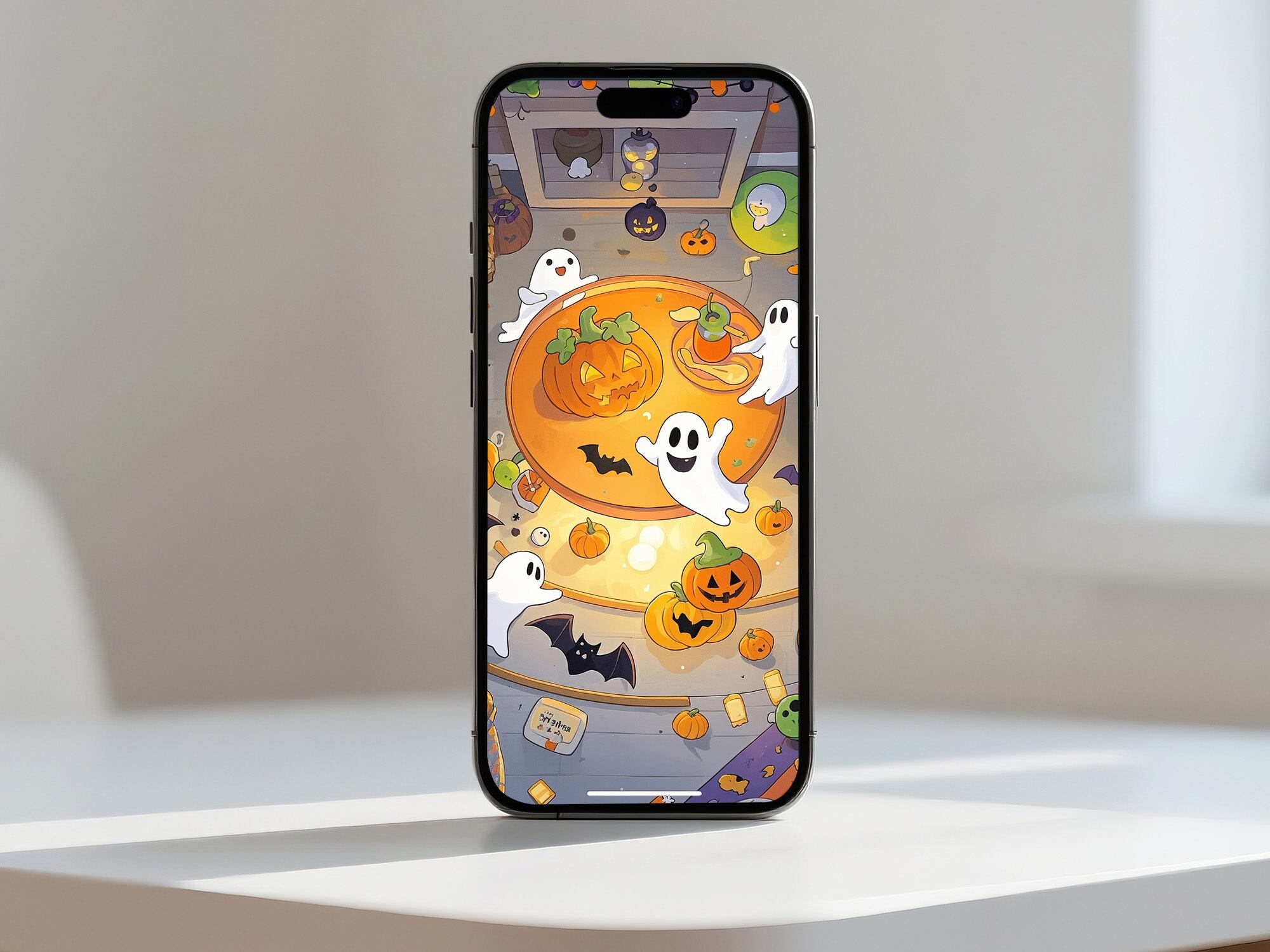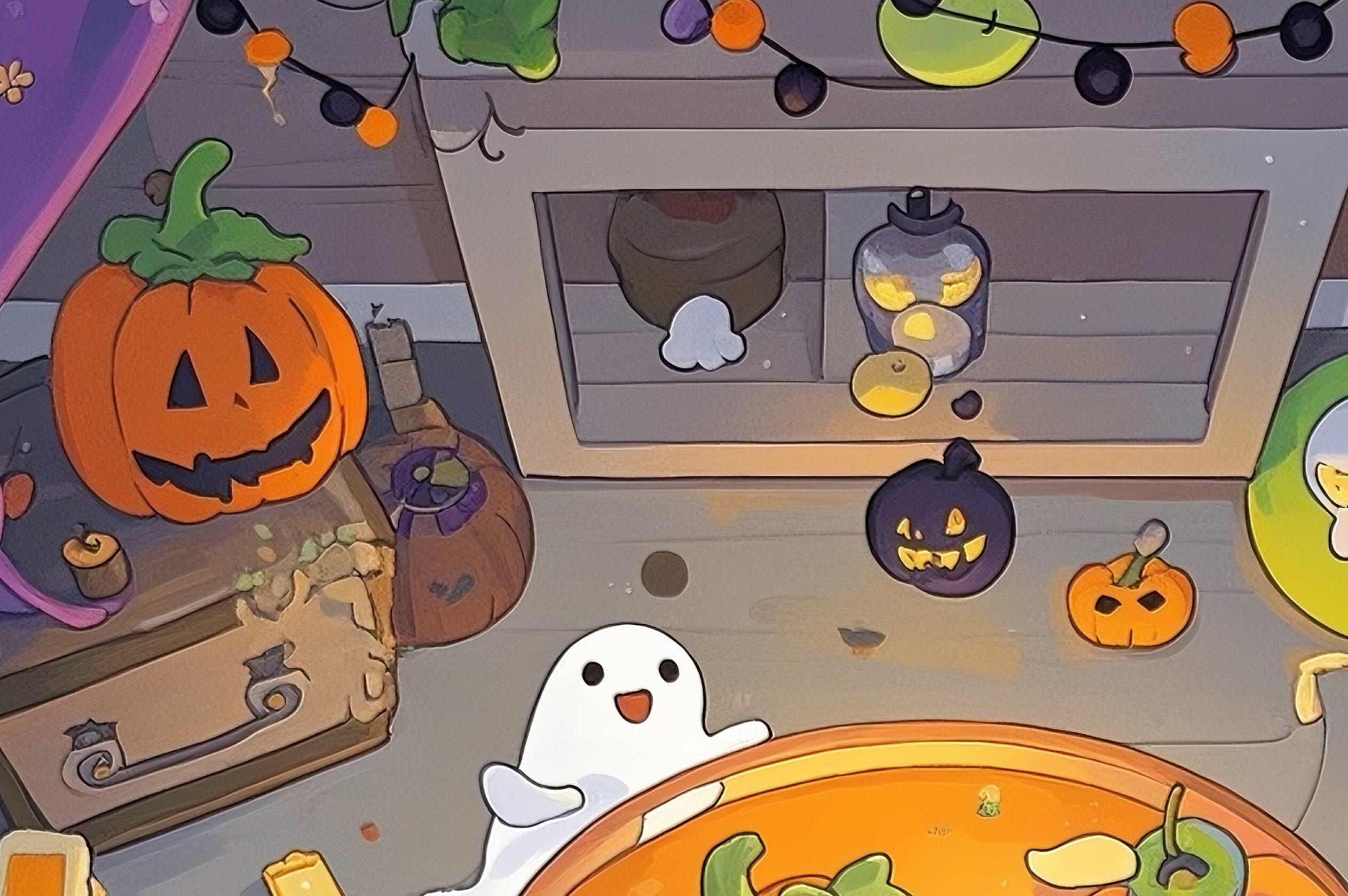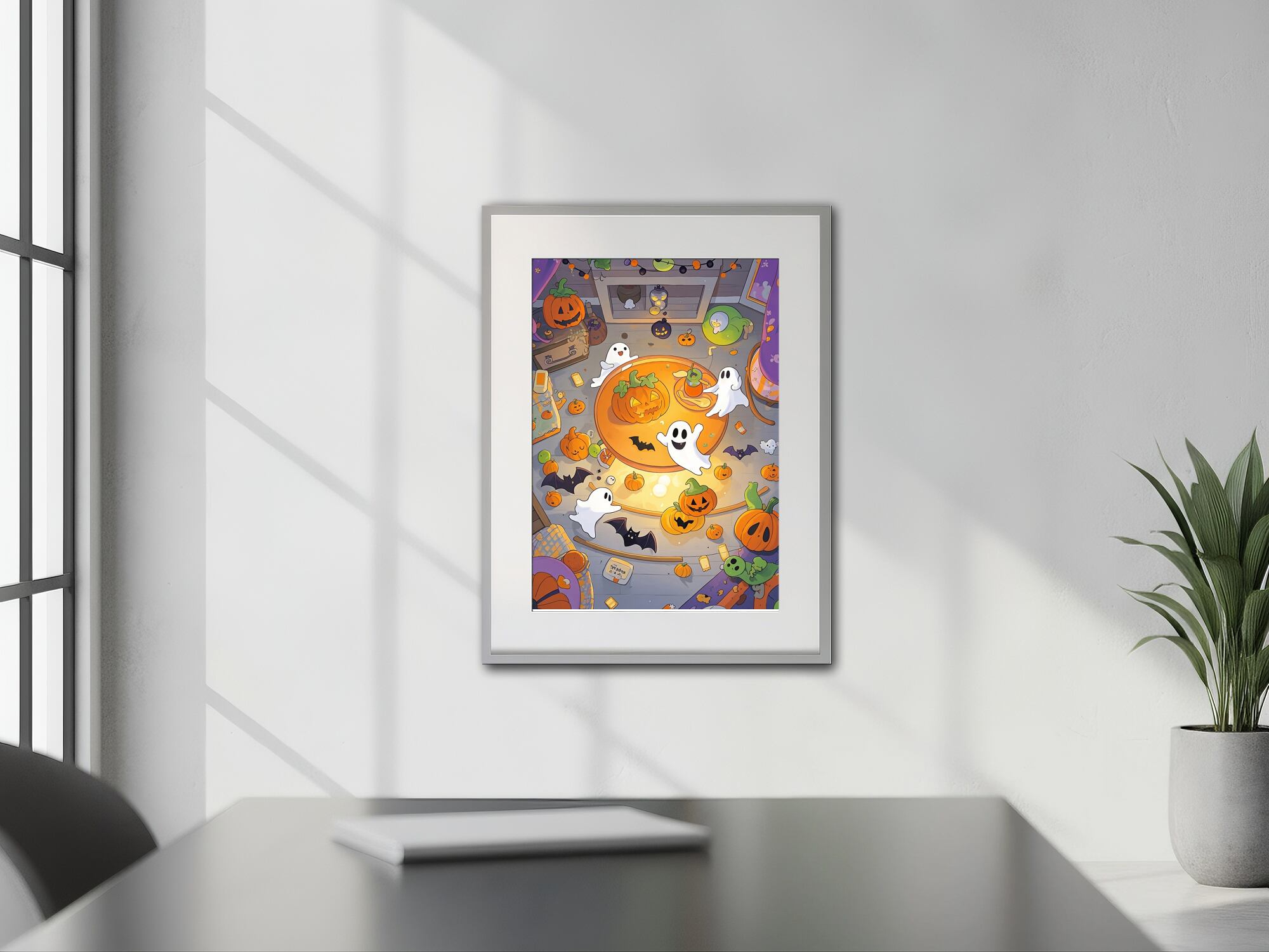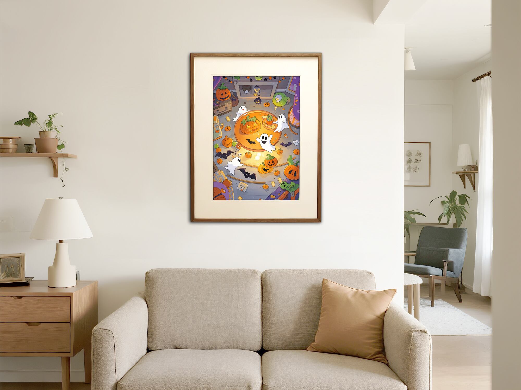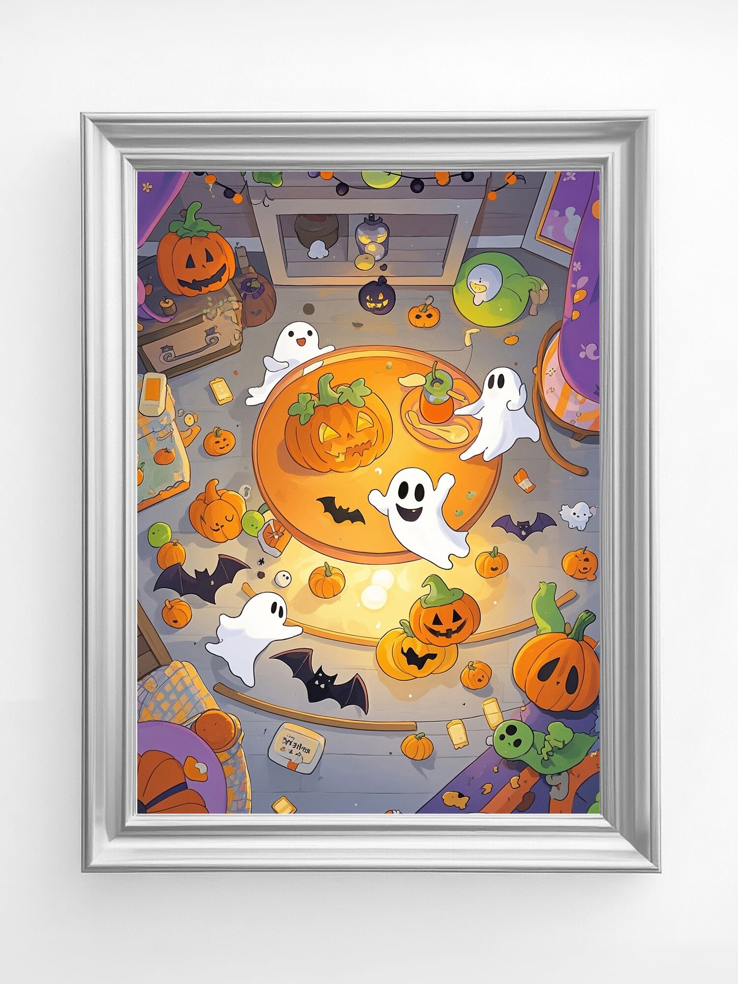 俯瞰構図で描かれたユニークな作品。部屋いっぱいに広がるゴーストとジャックオーランタンが、賑やかな“ハロウィン会議”を開いているような楽しい世界観です。細かいアイテムが散りばめられており、見れば見るほど新しい発見があります。ポップでファンタジックな空間演出を求める方に最適なイラストです。
