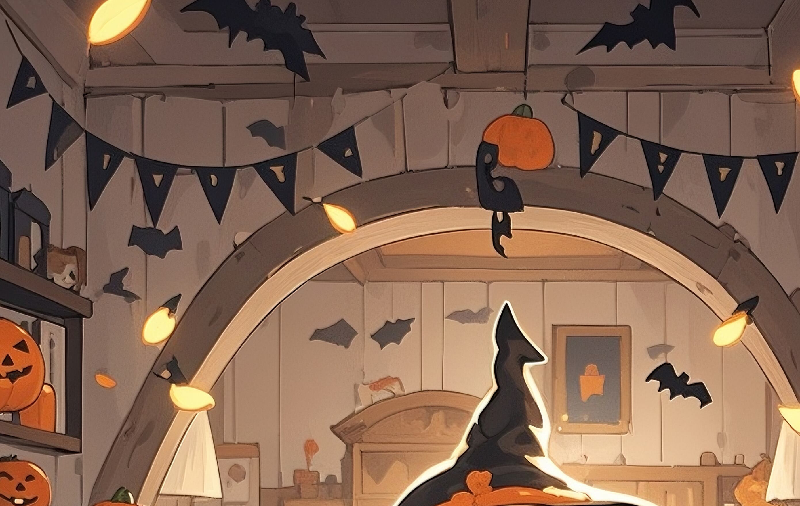 魔女の衣装をまとった子どもとゴーストたちが、温もりのある部屋で過ごすハロウィン風景。やさしい照明と木目の背景が、落ち着きのある雰囲気を演出しています。子ども部屋やカフェの季節アートとしても飾りやすい、まろやかな印象のイラストです。幻想的ながらも安心感のある世界が広がっています。