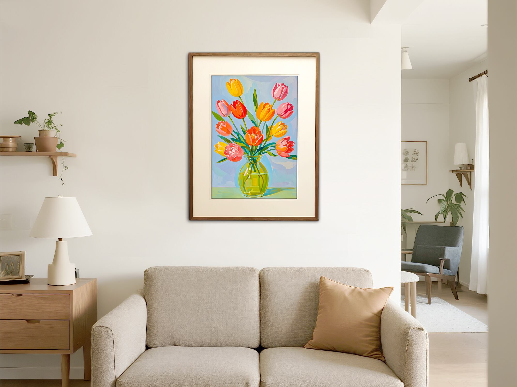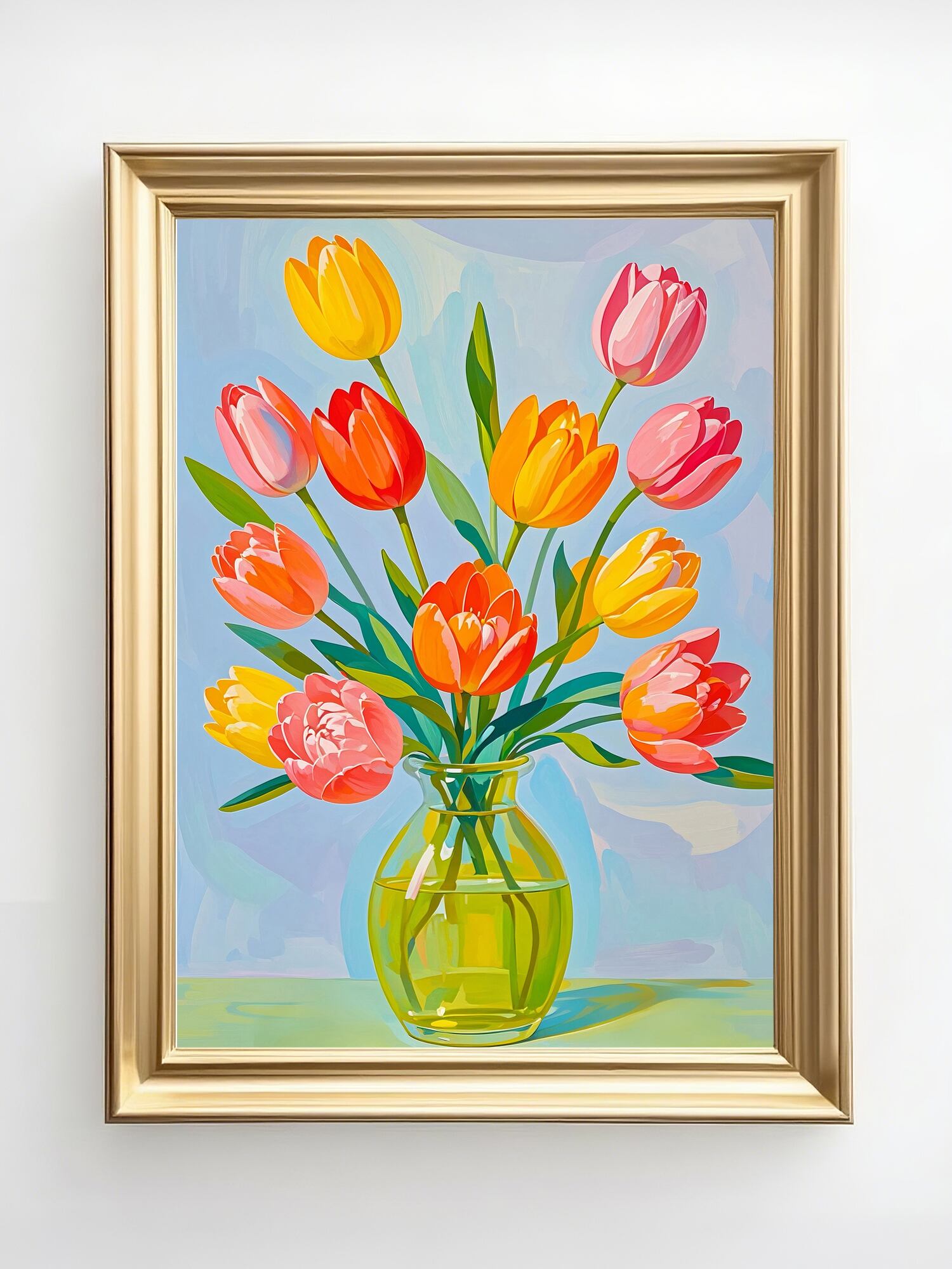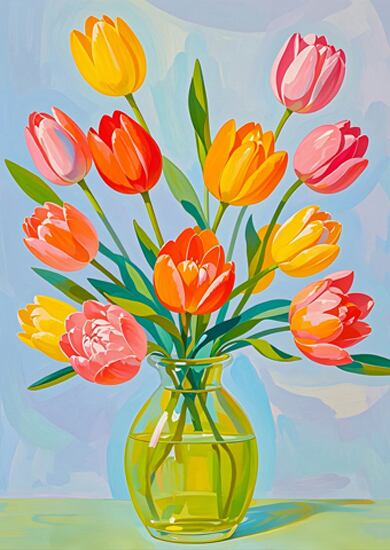 ガラス花瓶に飾られた色とりどりのチューリップが、春の明るいエネルギーをそのまま閉じ込めたような一枚です。柔らかい光を受けて花びらが鮮やかに輝き、部屋全体を明るく華やかにしてくれます。シンプルながらも存在感があり、玄関・リビング・ワークスペースにもぴったり。季節を問わず飾れる上品なフラワーアートとして、日常を優しく彩るインテリアに最適です。