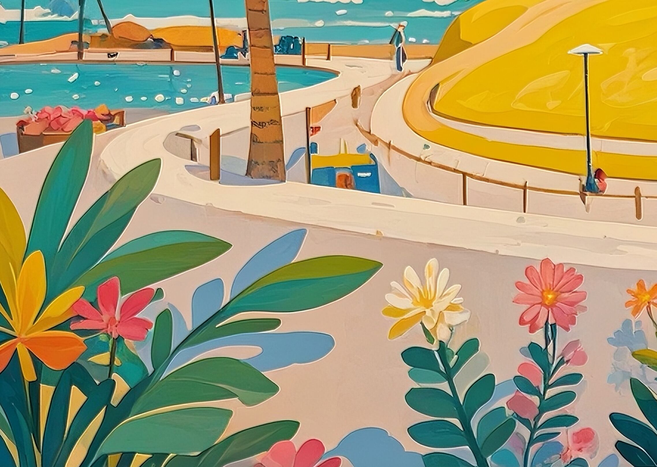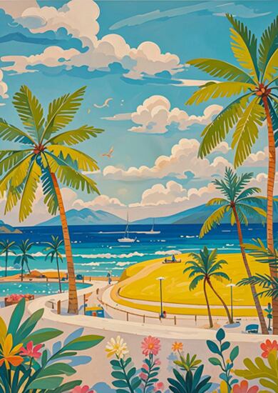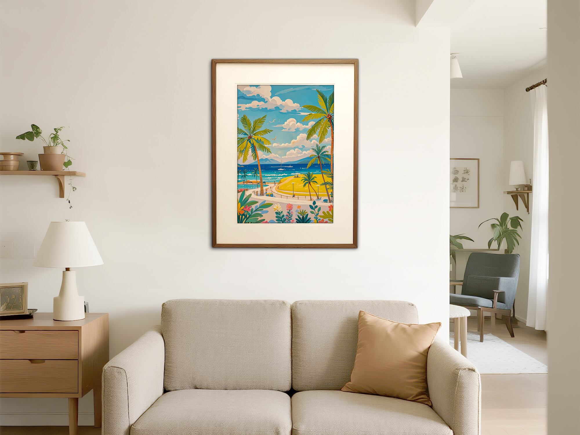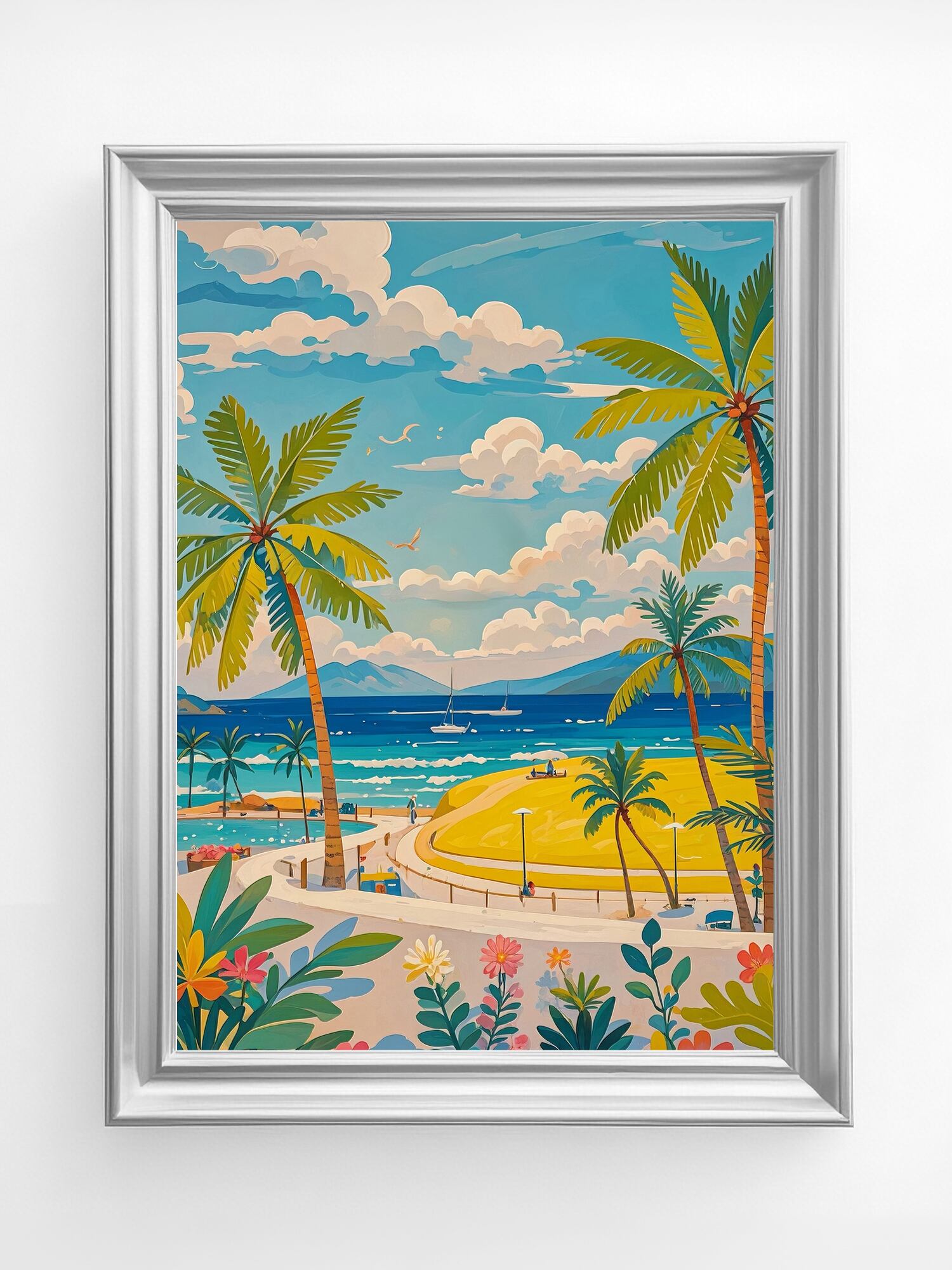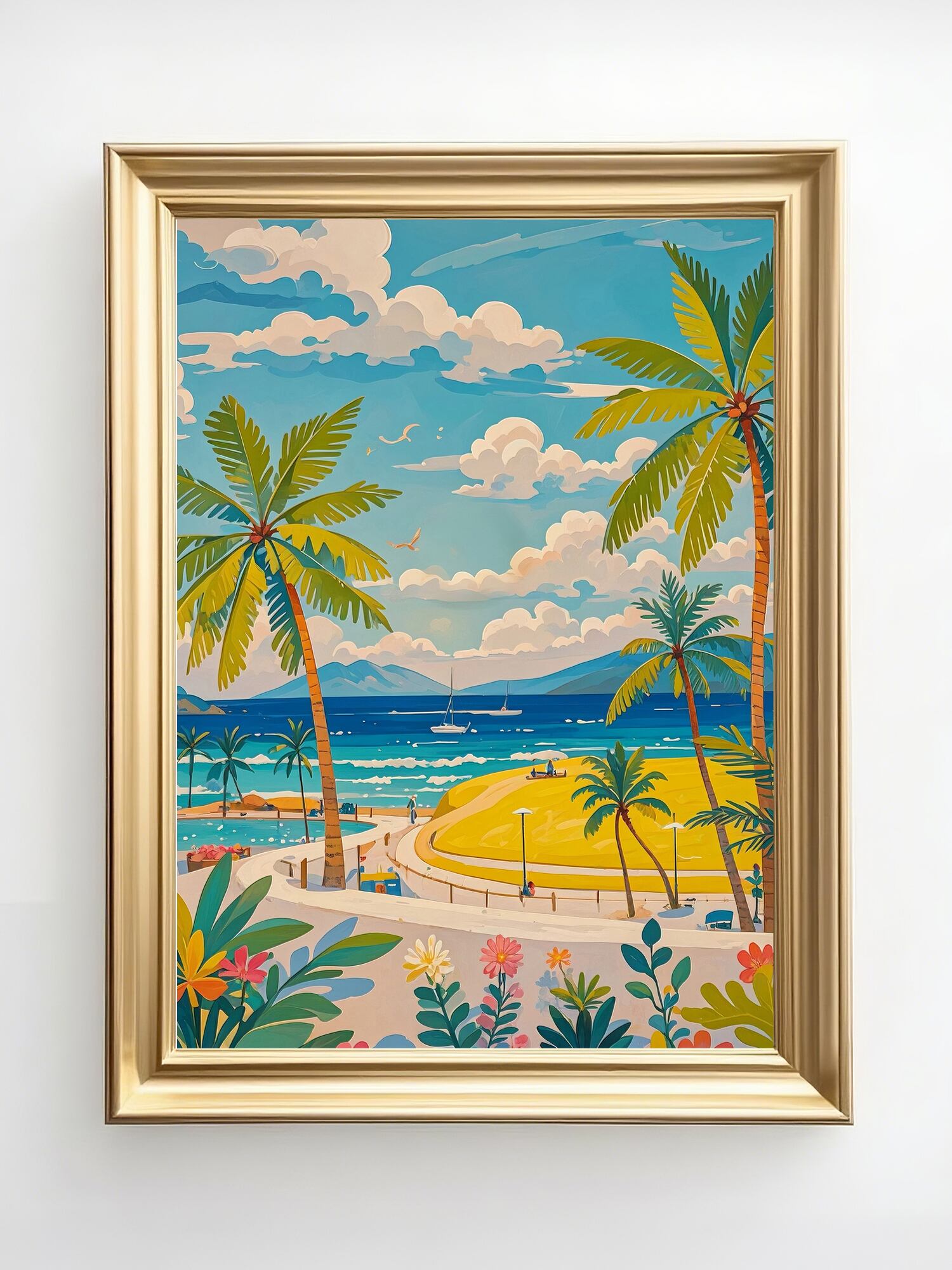 柔らかな海風が心地よく吹き抜ける南国の浜辺を描いた一枚です。青い空と白い雲、広がる海、そして鮮やかな緑のヤシの木が夏ならではの開放感を生み出しています。イエローの砂浜が明るさを添え、リゾート気分を味わわせてくれる爽やかな雰囲気のアートです。お部屋や玄関に飾るだけで、毎日に軽やかさとリラックス感が広がります。夏のインテリアを彩る一枚としておすすめです。