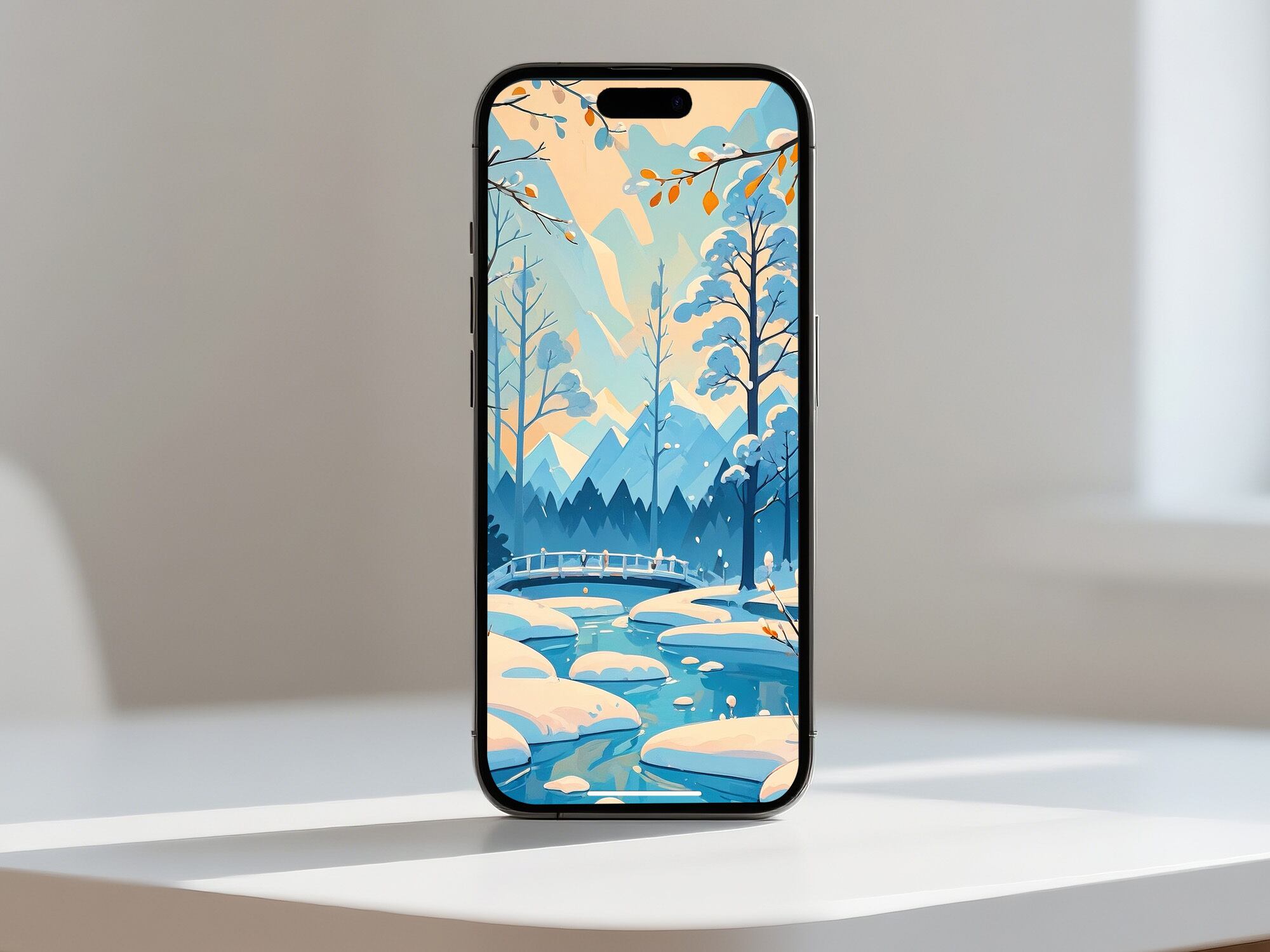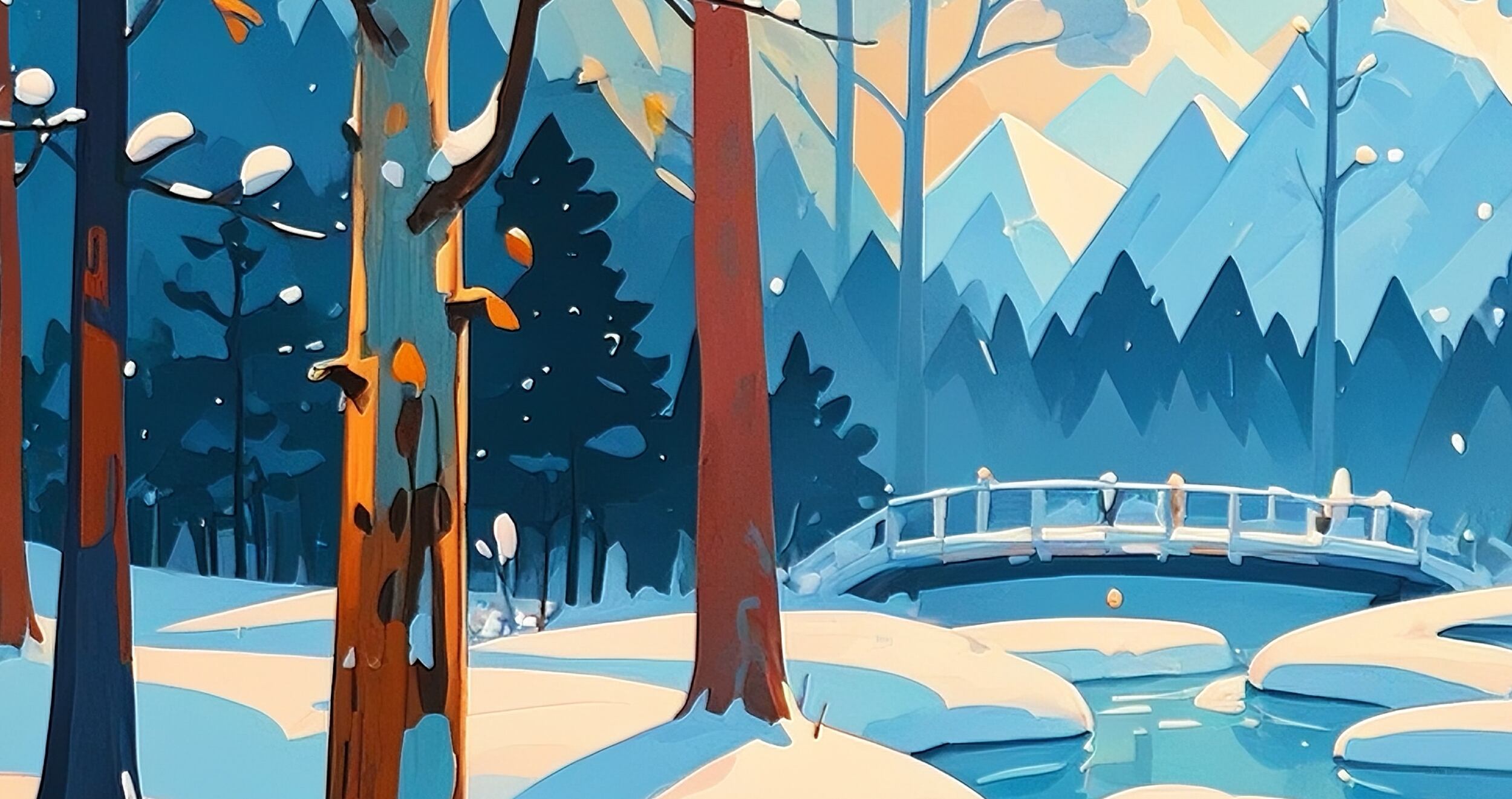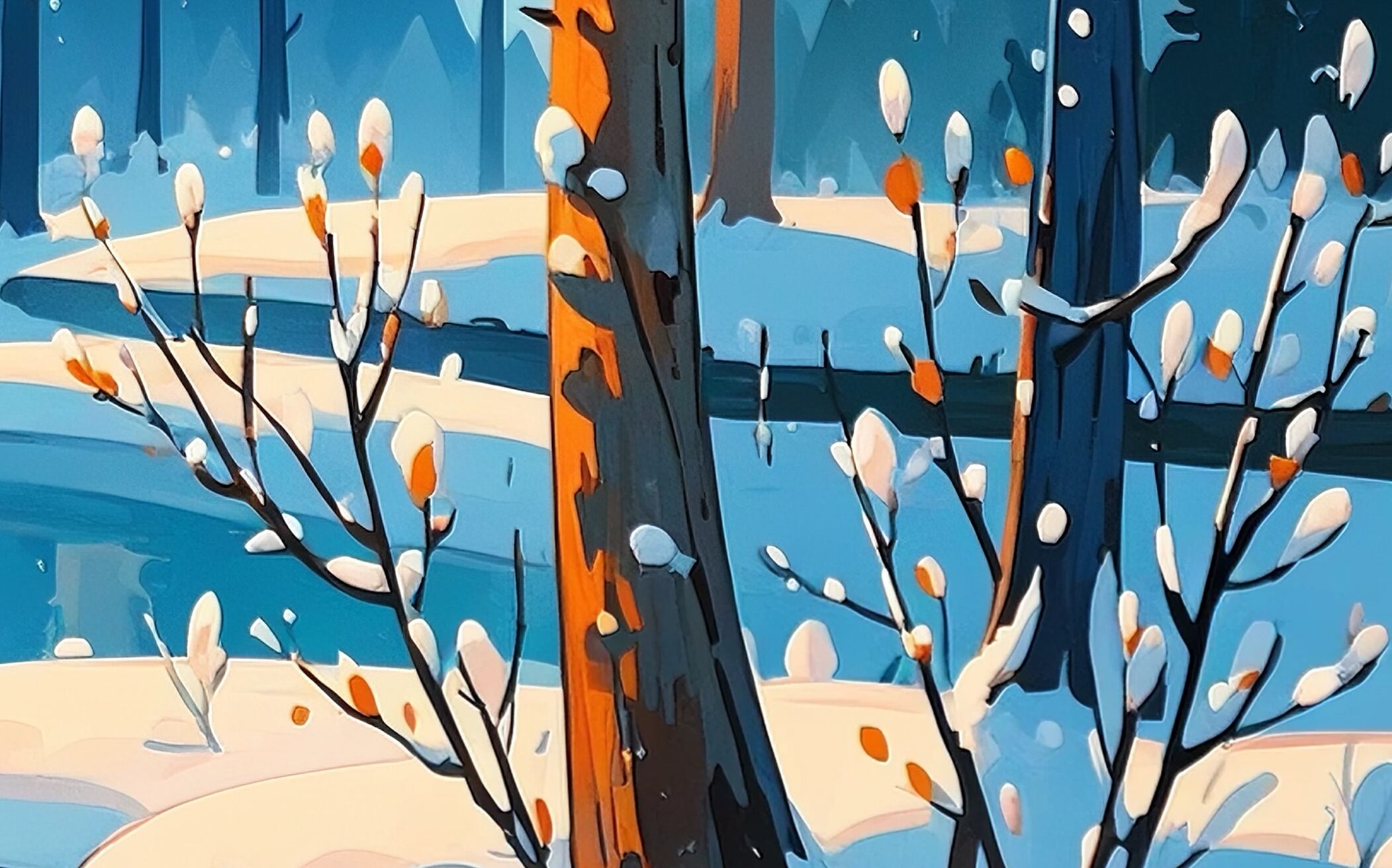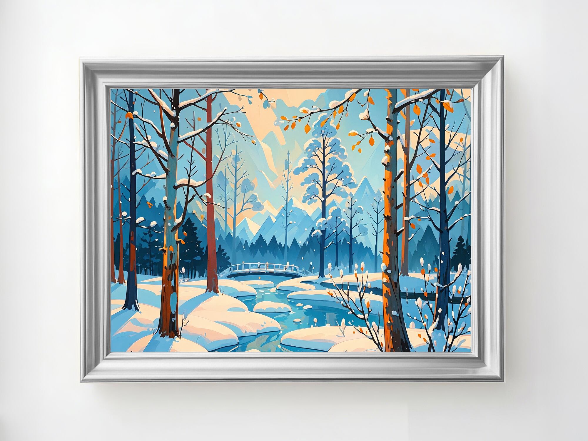 森の中の小川と、雪をまとった木々のコントラストが美しい一枚。柔らかな朝日が木々の間から差し込み、冬の冷たさの中に温かみを感じられます。自然と調和する色使いが柔らかい空気感を生み、季節の移ろいを豊かに表現した作品です。落ち着いた空間づくりにぴったりです。