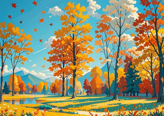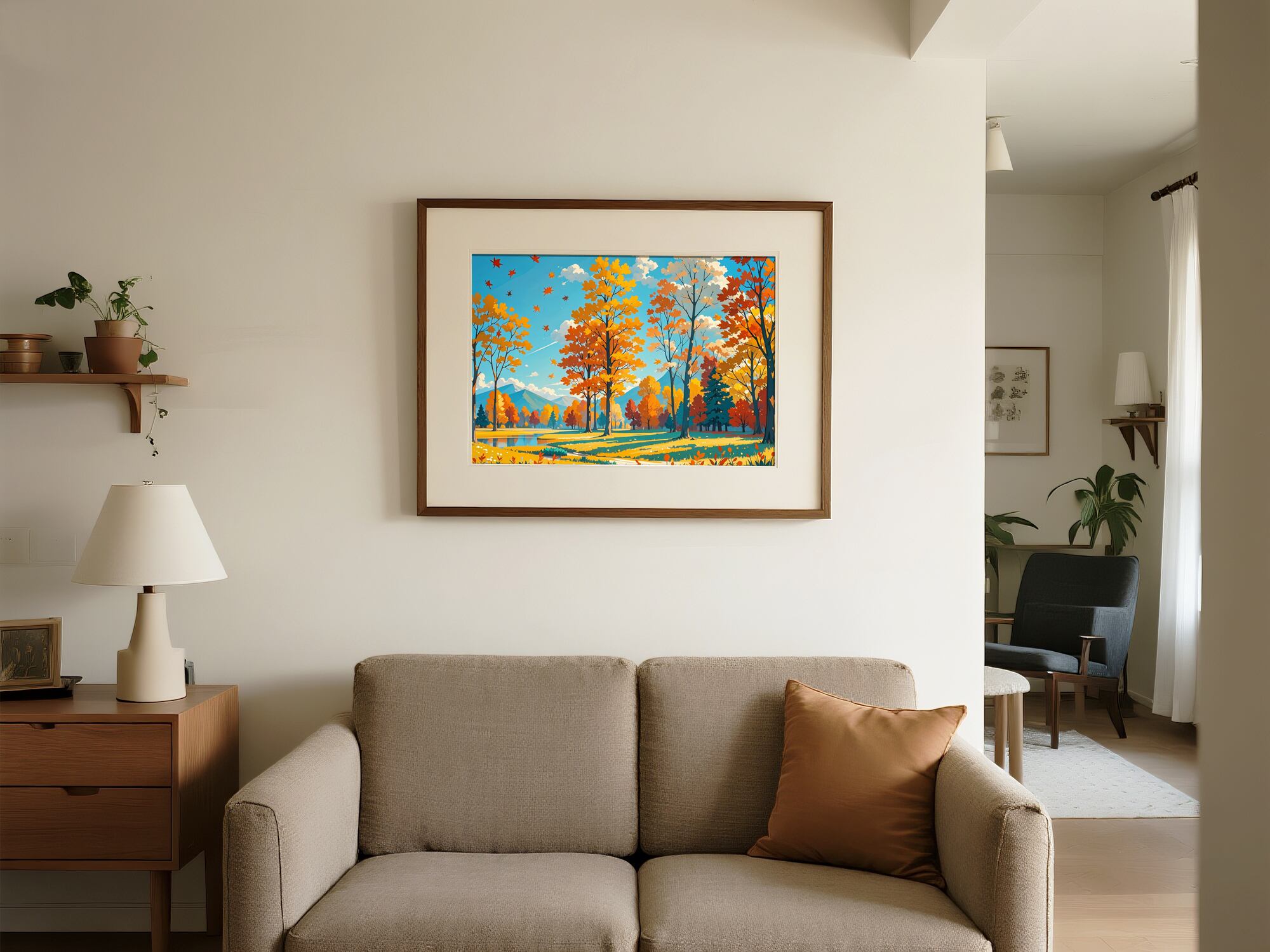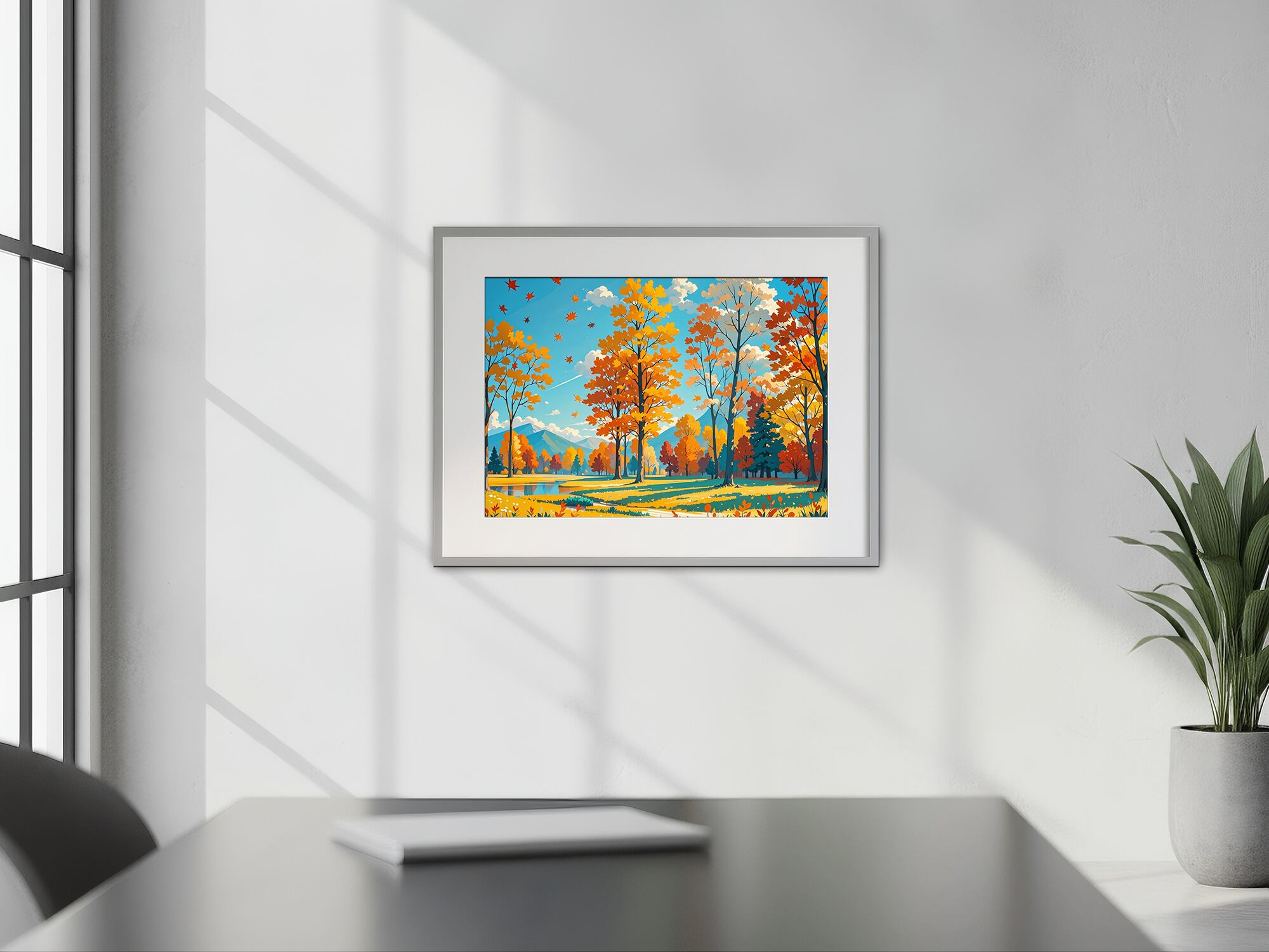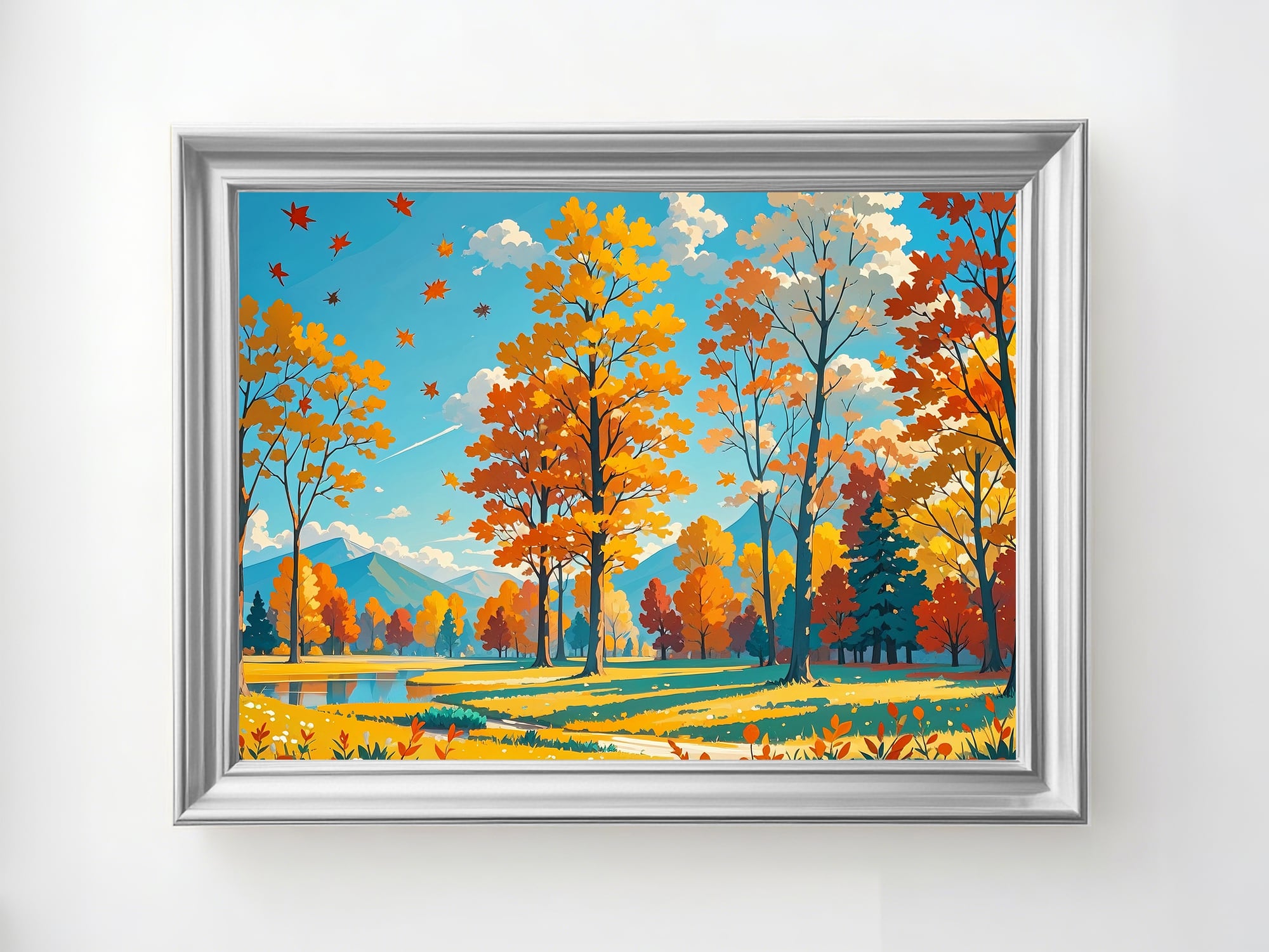 紅葉が進む林の中を、秋風が軽やかに吹き抜ける情景を描いた温かみあるアートです。黄色からオレンジへと移ろう木々の色彩が美しく、足元の落ち葉が季節感を一層引き立てます。落ち着いた色調の中に鮮やかなアクセントがあり、秋ならではの穏やかな時間を感じさせてくれます。季節飾りとしてはもちろん、年間を通して温もりを与えてくれる一枚です。