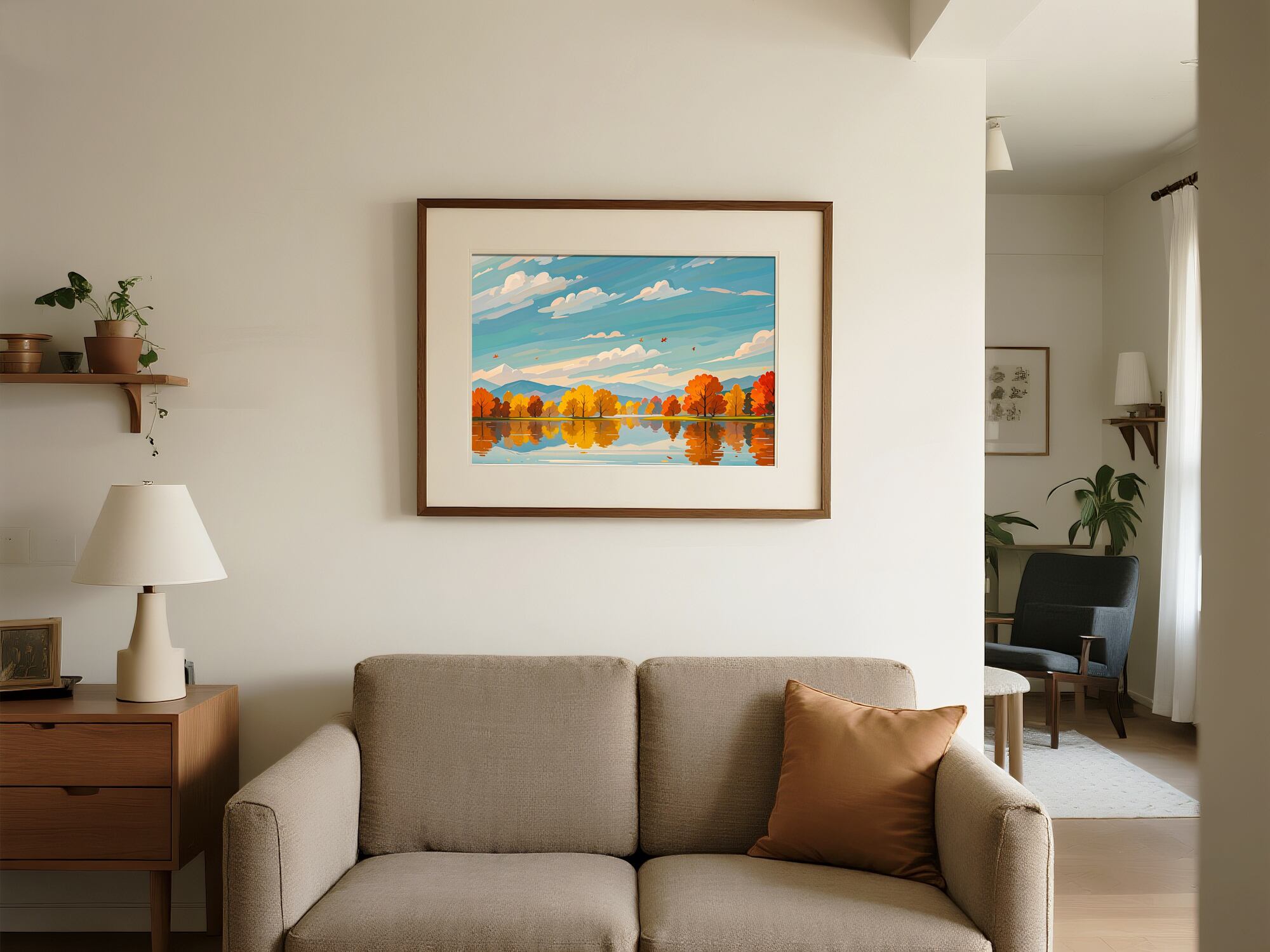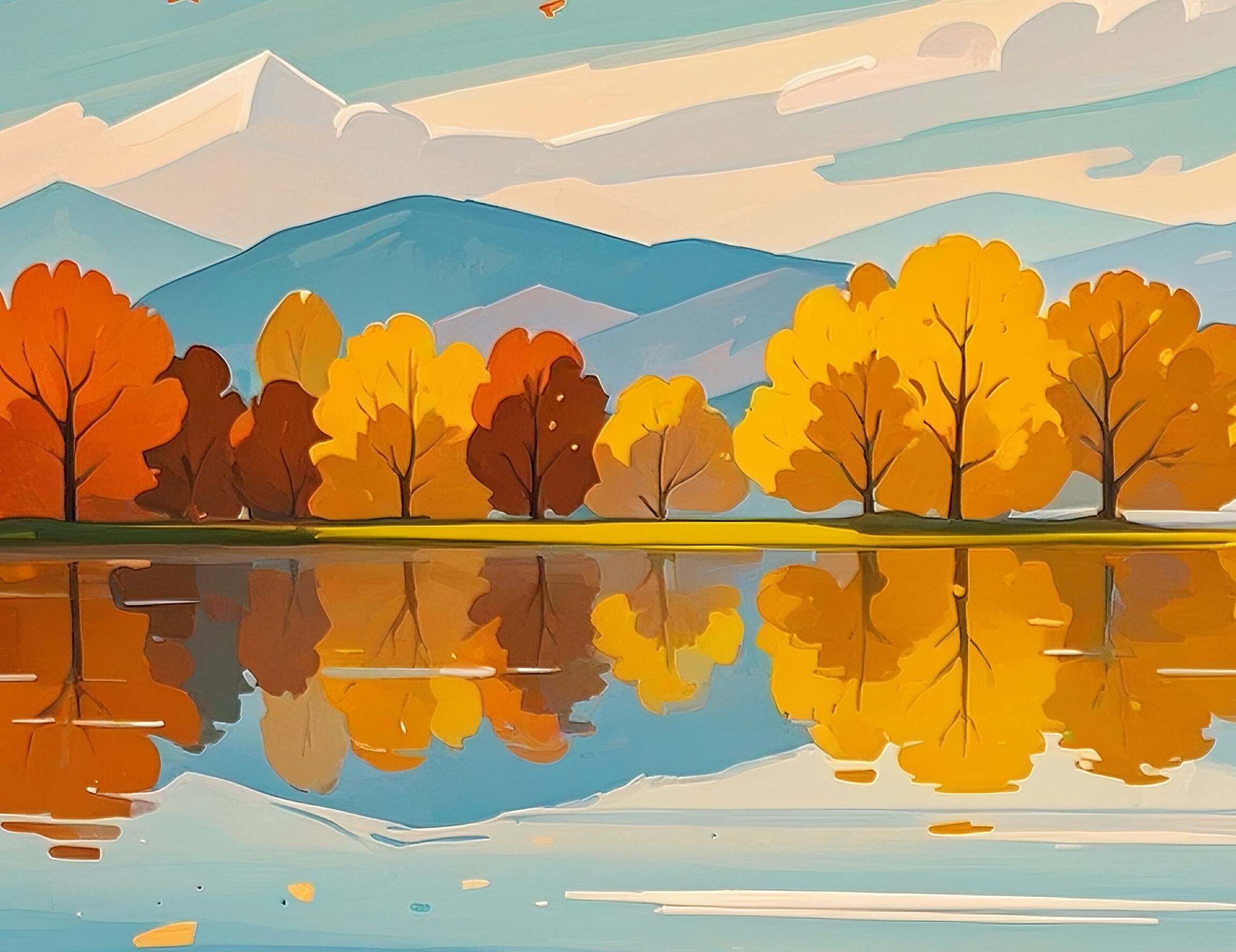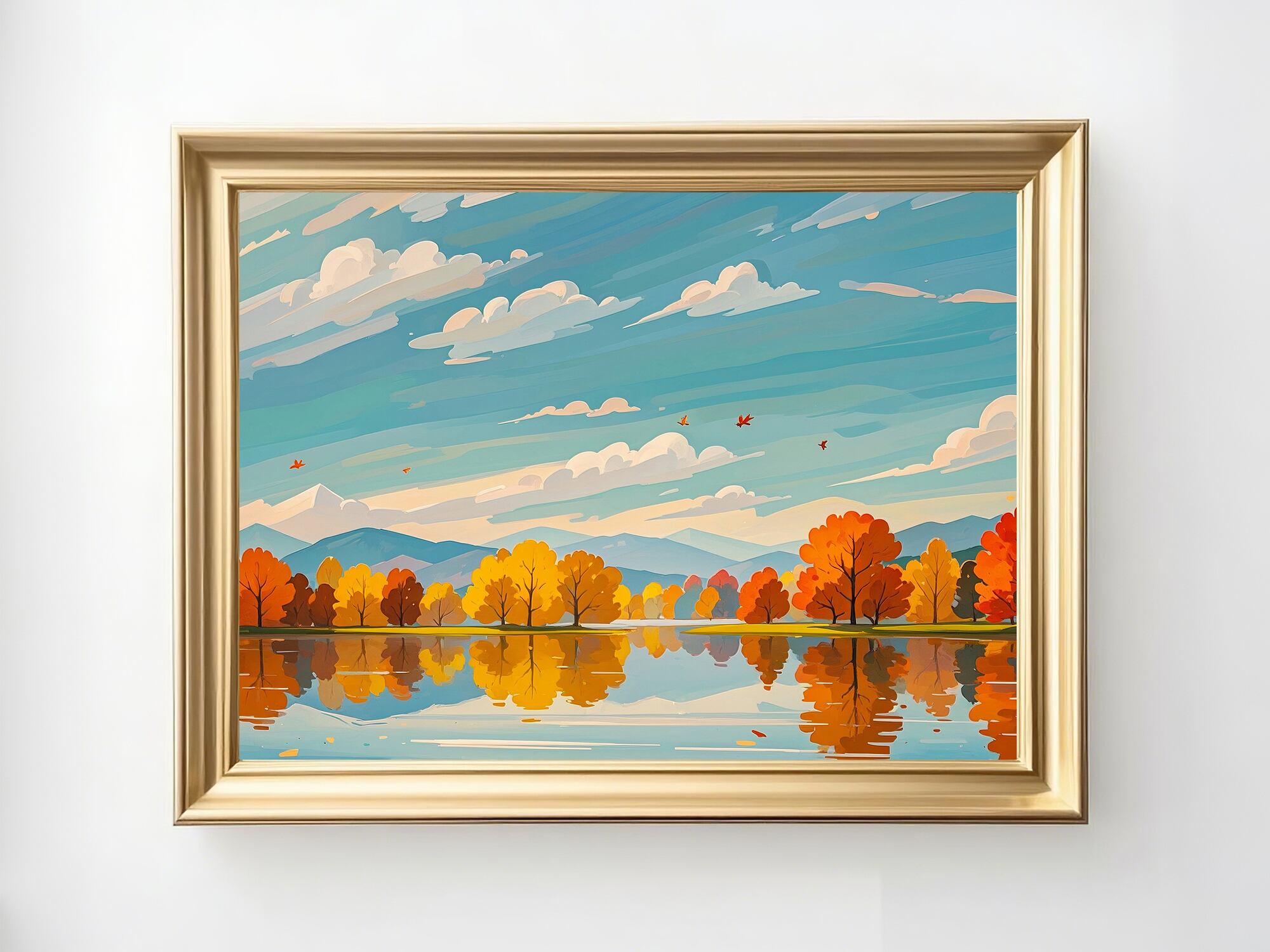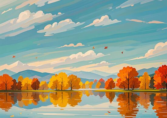 鏡のように澄んだ湖面に、秋の木々が美しく映り込む静寂の風景を描いた一枚です。淡いブルーの空とオレンジの紅葉が調和し、落ち着きのある優しい雰囲気を醸し出しています。眺めるほどに静けさが広がり、心を整えてくれるような癒しのアートです。インテリアに品のある季節感を添えたい方におすすめの作品です。