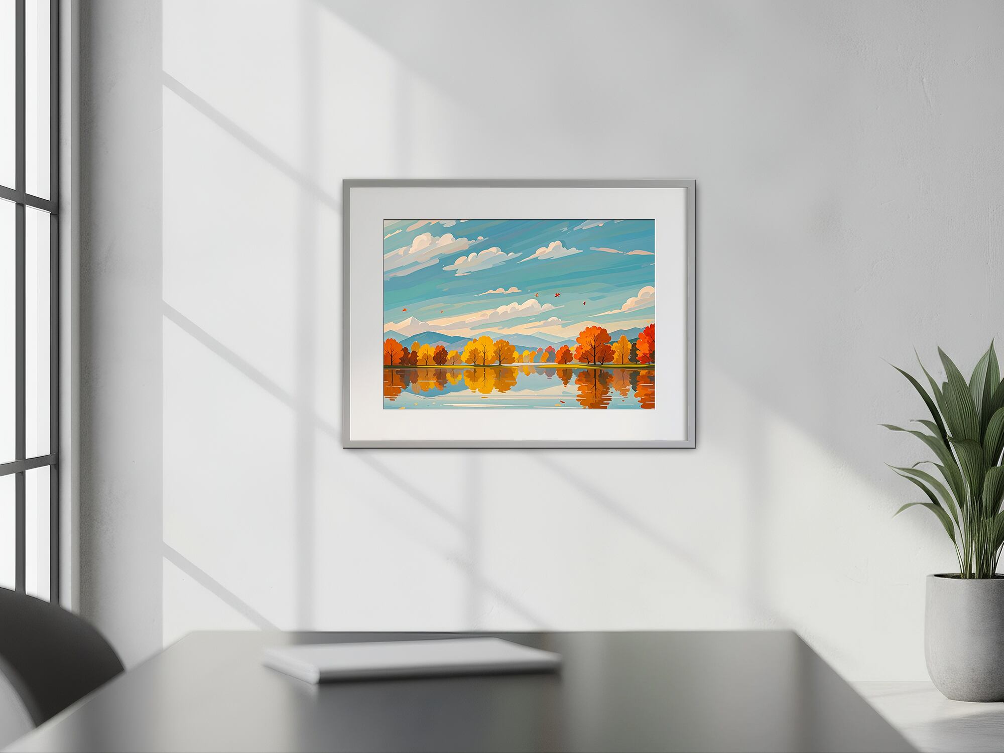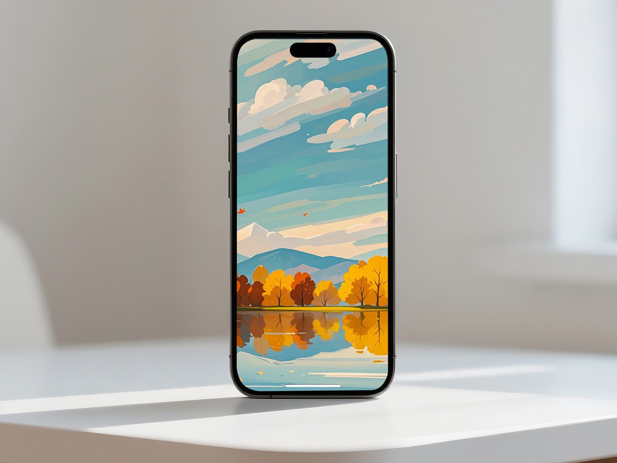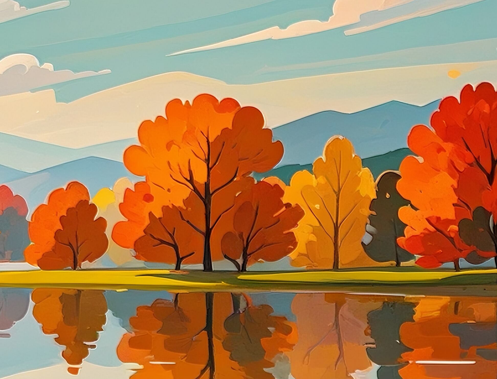 鏡のように澄んだ湖面に、秋の木々が美しく映り込む静寂の風景を描いた一枚です。淡いブルーの空とオレンジの紅葉が調和し、落ち着きのある優しい雰囲気を醸し出しています。眺めるほどに静けさが広がり、心を整えてくれるような癒しのアートです。インテリアに品のある季節感を添えたい方におすすめの作品です。