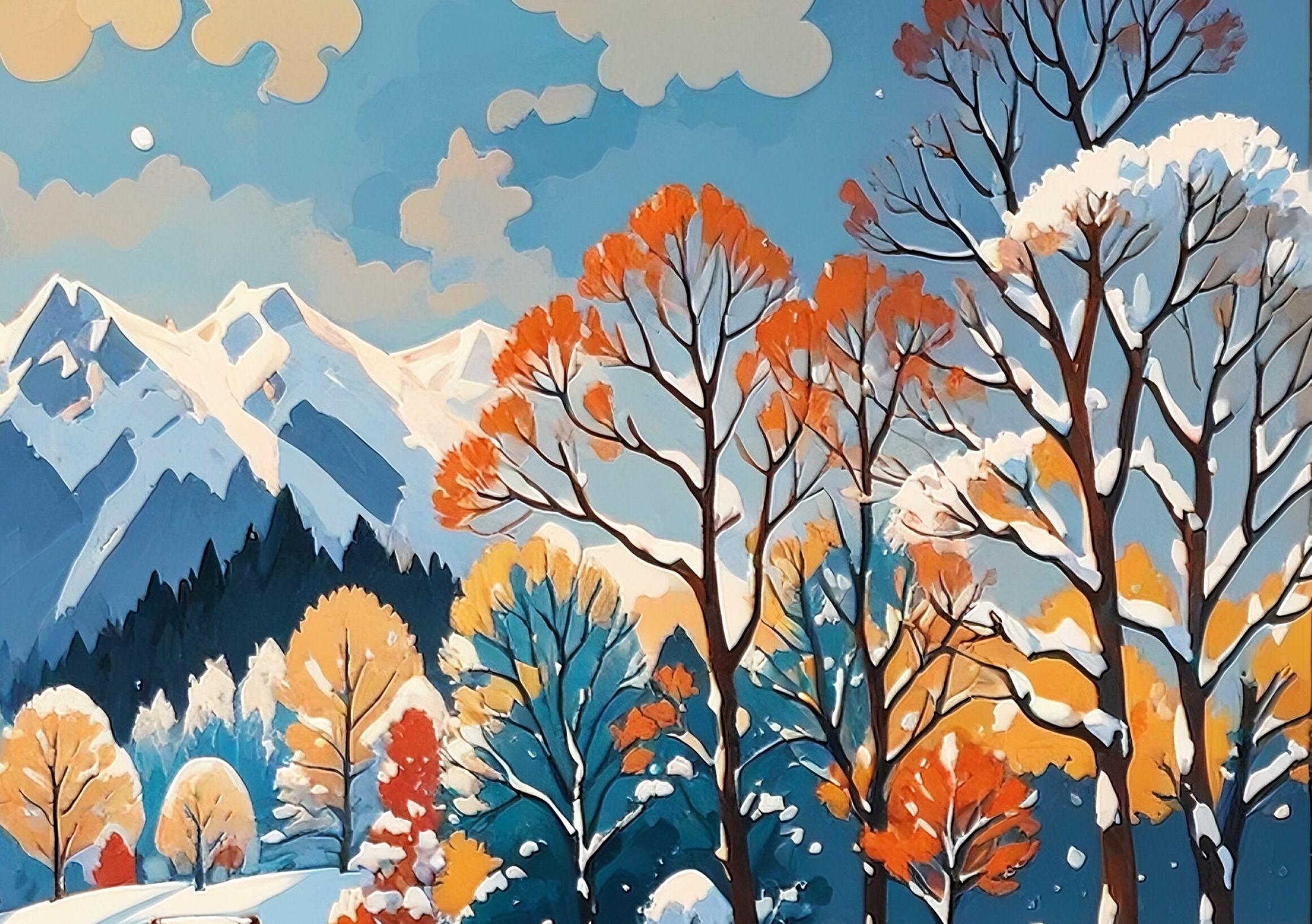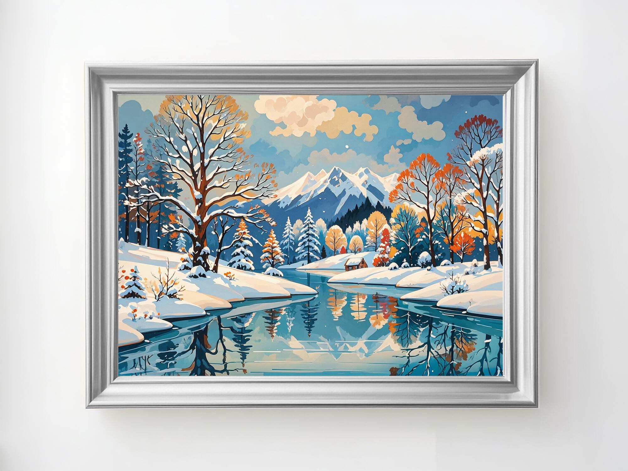 透明度の高い水面に、雪山と冬木立が鏡のように映り込む作品です。冬の澄んだ空気、夕暮れの雲の色彩、そして奥行きのある自然の調和が魅力。明るい配色のため、冬景色でありながら重くならず、インテリアを品よく彩ります。季節感を取り入れたい空間に最適です。