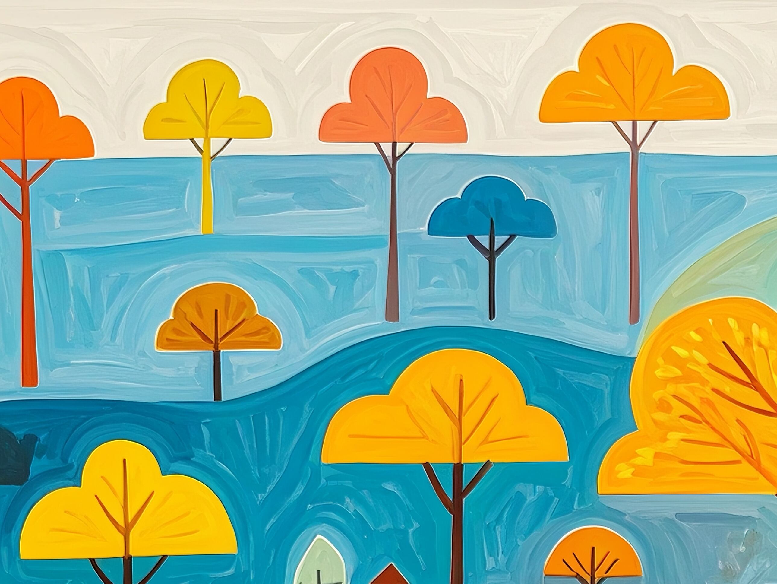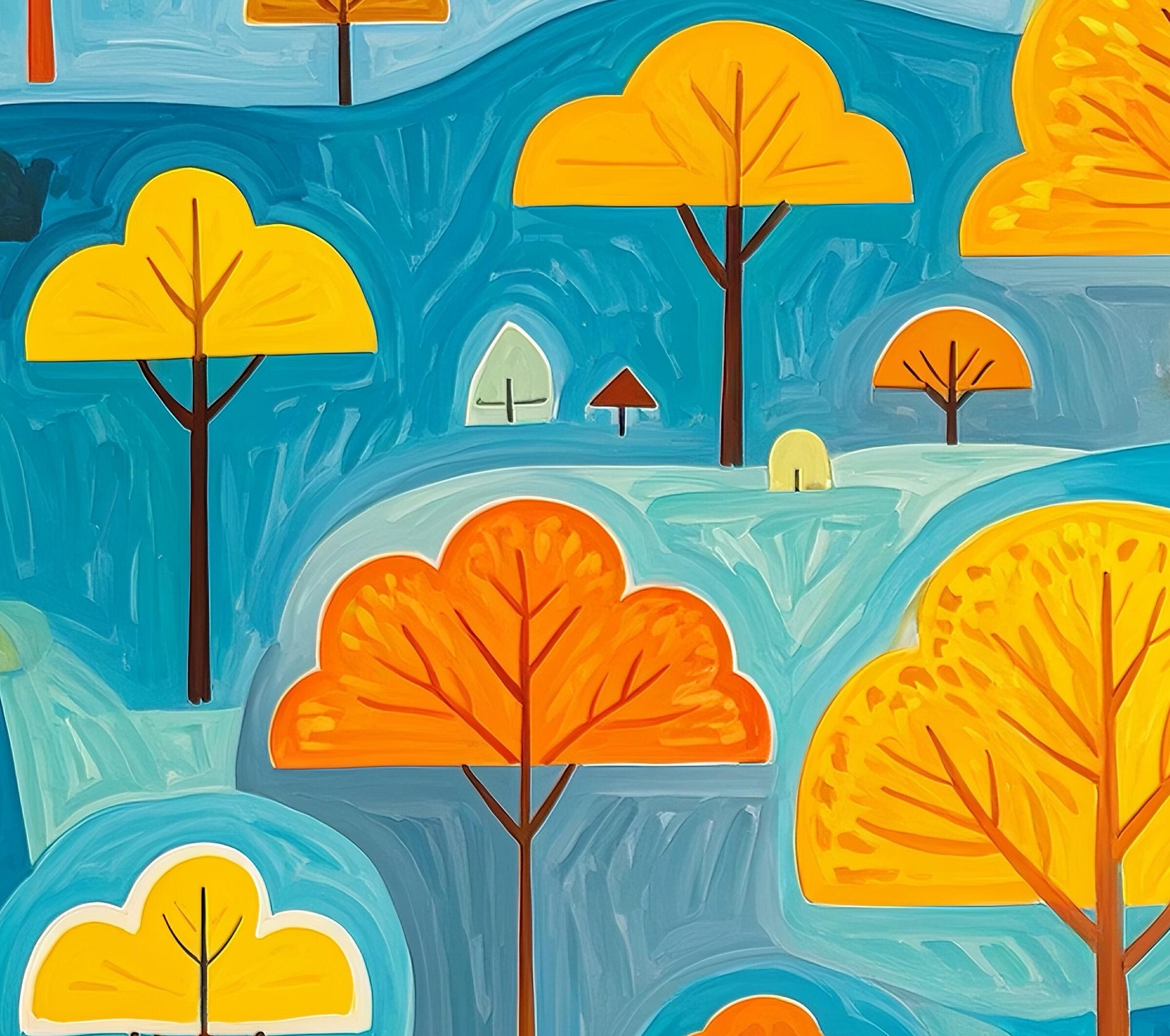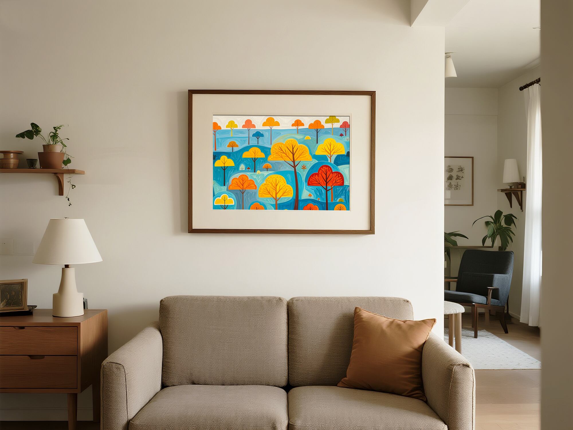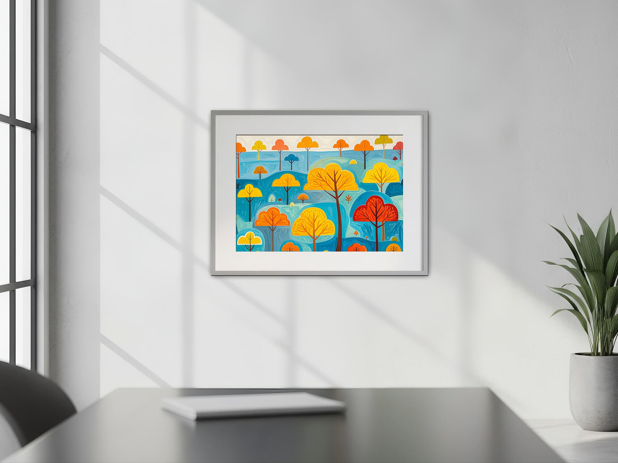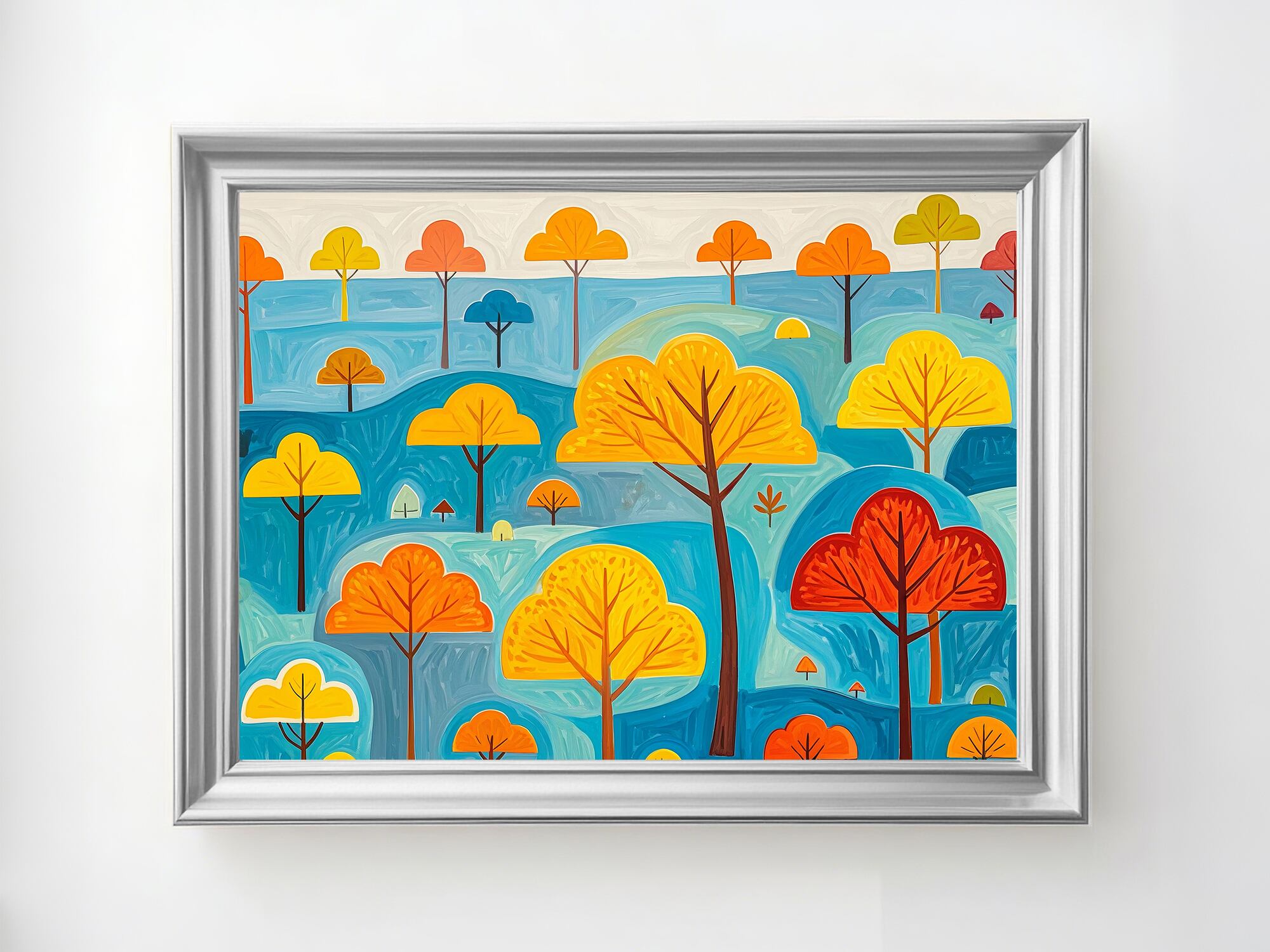 色とりどりの秋の木々が、まるでパレットの上に広がる絵の具のように鮮やかに並ぶ幻想的なアート作品です。リズミカルに配置された丸みのある樹形がポップな印象を与え、明るく楽しい空間を演出します。抽象的でありながら秋の温もりをしっかりと感じられるデザインは、リビングや子ども部屋、カフェ空間など幅広いインテリアにマッチ。季節感を表現しつつも一年を通して飾れる使いやすい秋アートです。