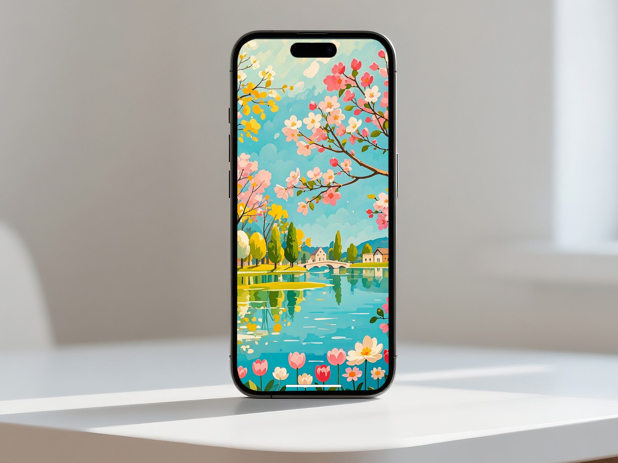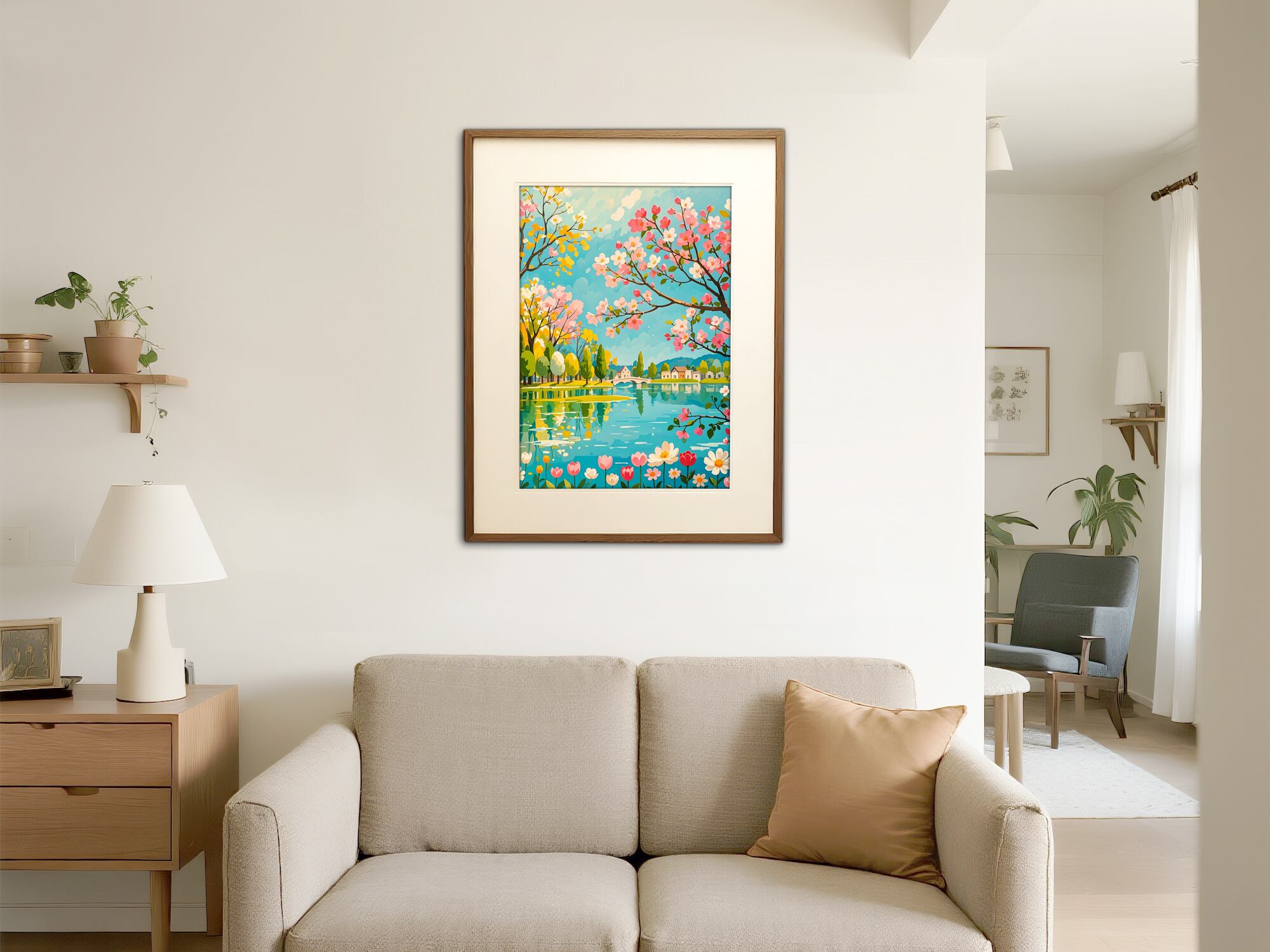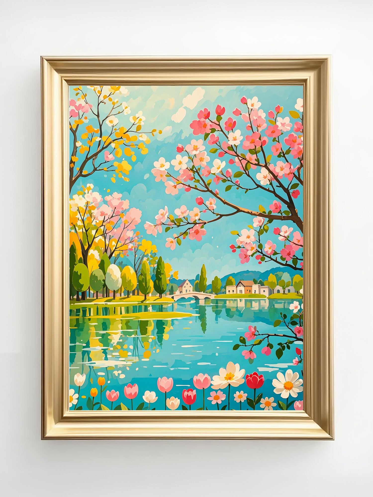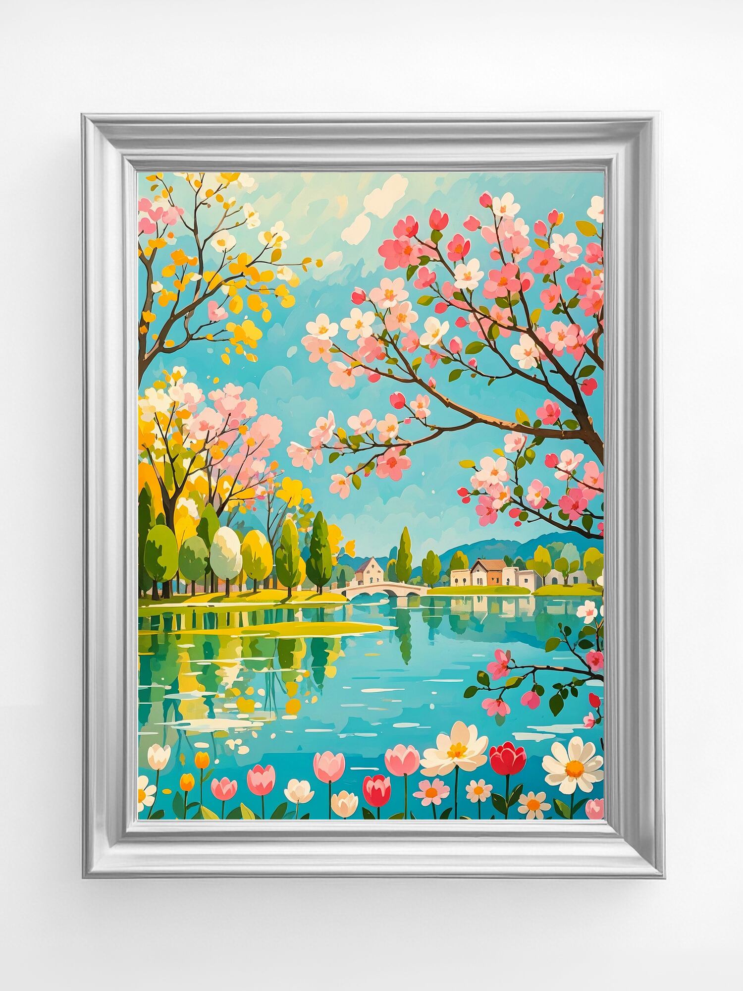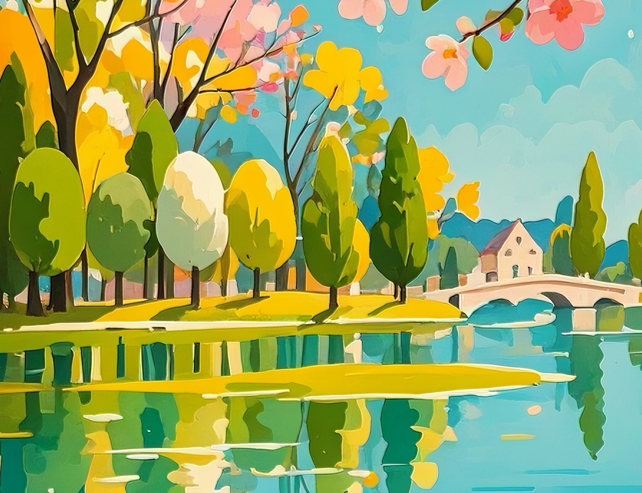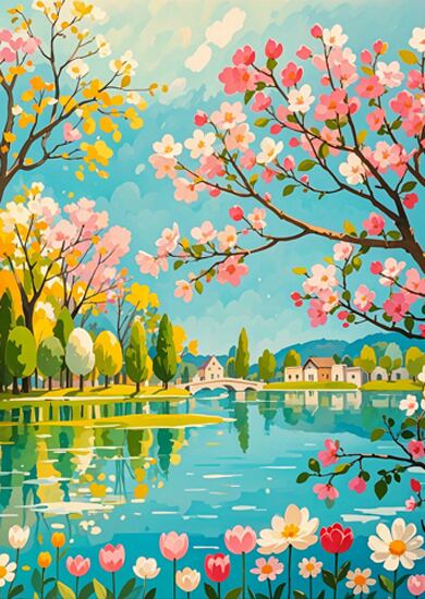 桜並木と湖畔の景色が満開の春を鮮やかに描き出す作品。ピンクやイエロー、ブルーの色彩が絶妙に調和し、眺めるだけで心が華やぐ仕上がりです。奥行きある構図で風景が広がり、壁に飾ることでお部屋が一気に明るく季節感あふれる空間に。春の気分を最大限楽しみたい方にぴったりの華やかなアートです。