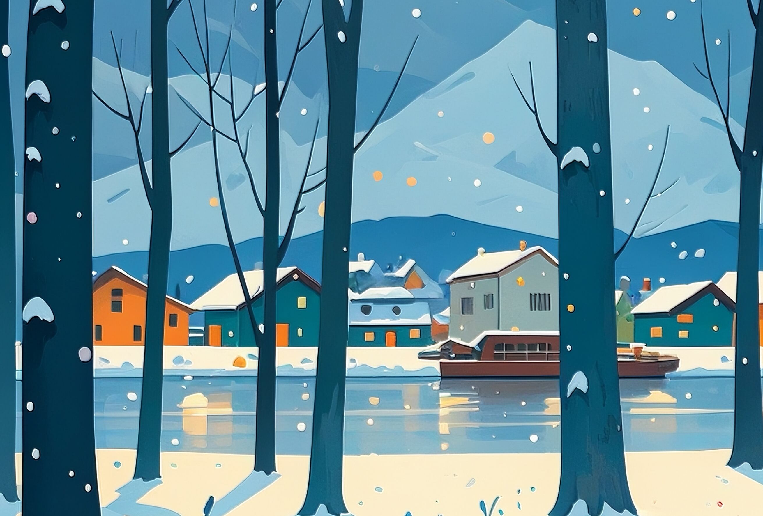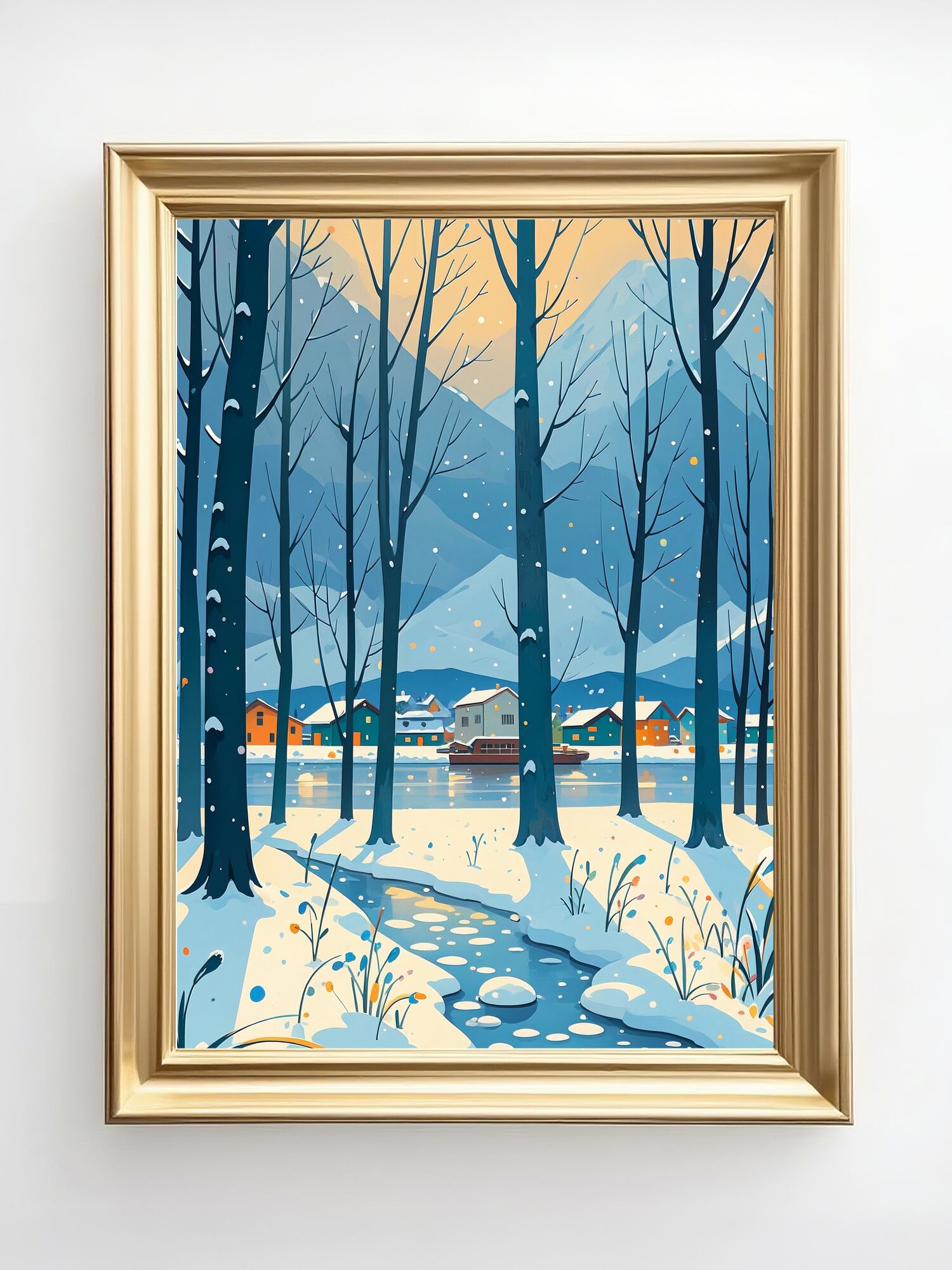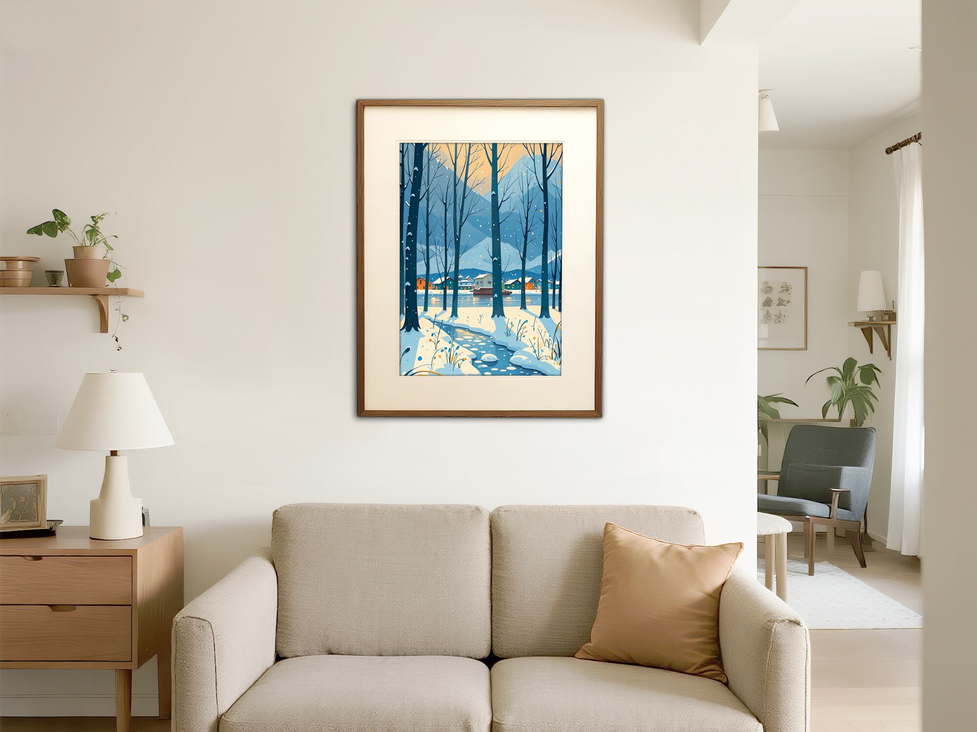 雪に包まれた森を歩く小道と、奥に見える家の灯りが温かく光る冬の夕景を描いた作品です。冷たいブルーの雪景色の中に差し込む黄色い光が印象的で、静寂と人の気配が織りなす心地よいコントラストが魅力。ドラマ性が強く、飾るだけで冬の情緒を空間に運びます。落ち着いた大人の冬インテリアにおすすめの、情緒豊かなアートです。