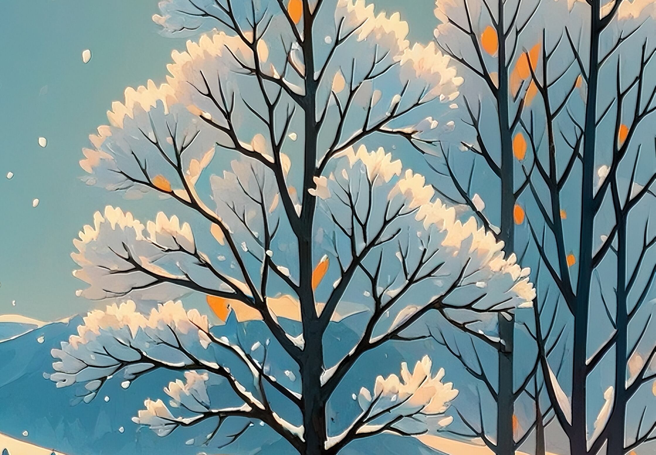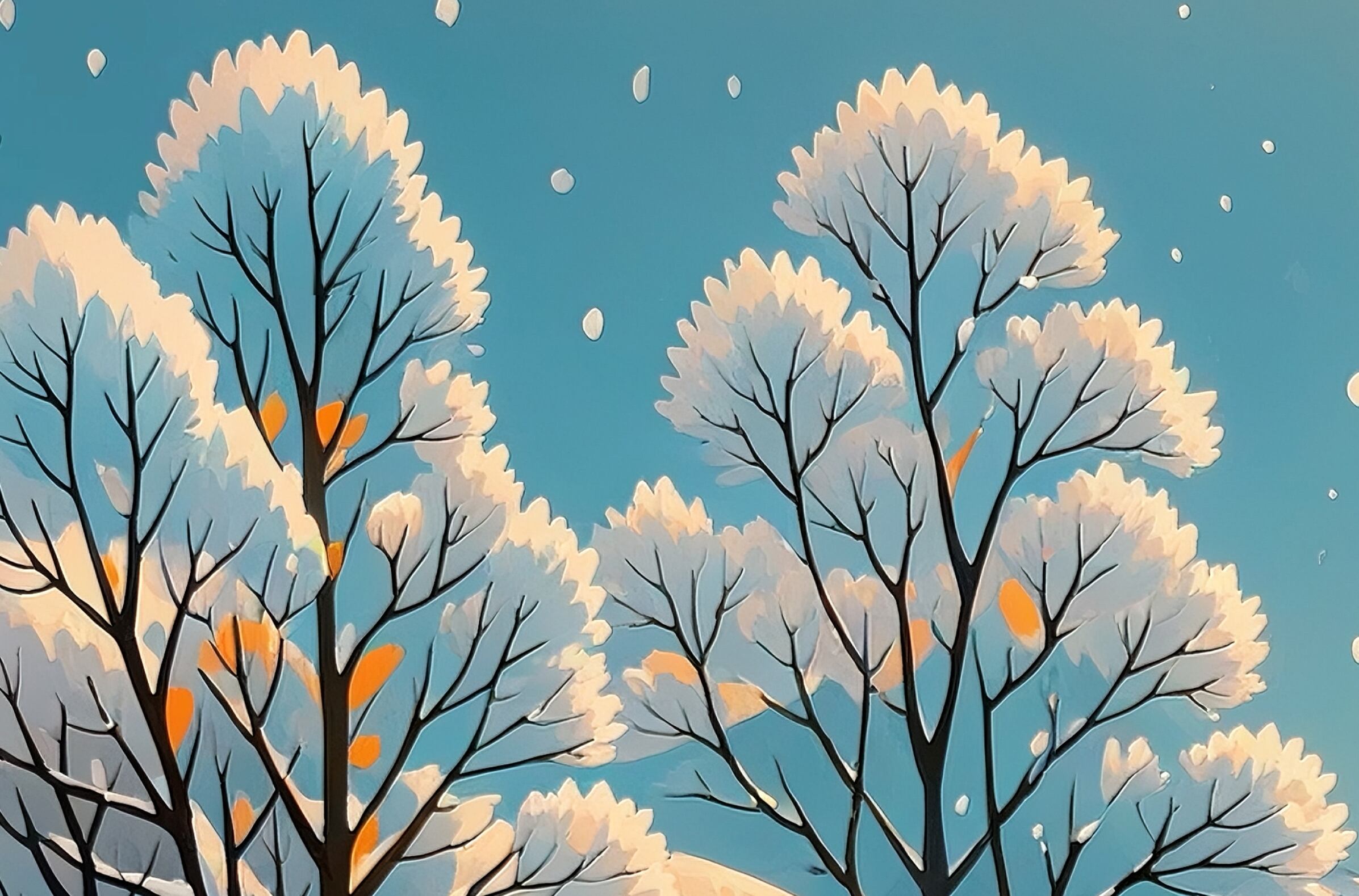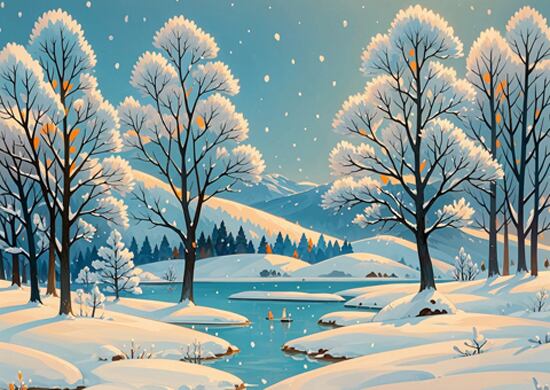 淡い雪が舞う中、木々が柔らかく佇む幻想的な風景画です。丸みのある木の表現が優しい雰囲気を伝え、見ているだけで心が落ち着きます。背景まで丁寧に描かれ、冬の奥深い静寂が空間に広がります。ナチュラルテイストのインテリアにも好相性な冬アートです。