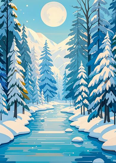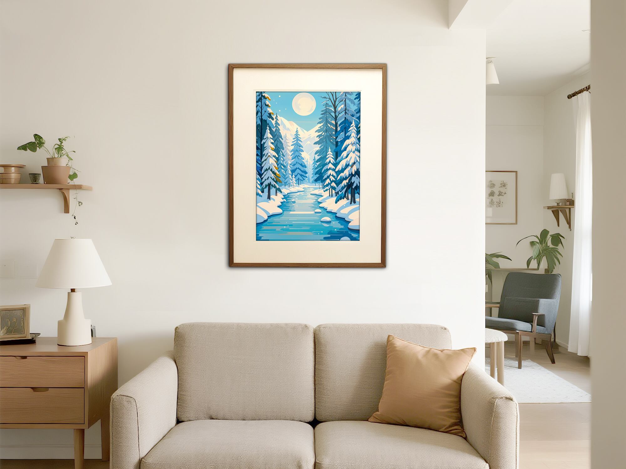 満月が澄みきった空に輝き、雪に覆われた森と川を幻想的に照らす一枚です。月光に照らされた水面のさざ波、深い森の静けさが調和し、冬のロマンを感じさせます。ブルートーンの空気感は、部屋に透明感と清潔感を演出。ナイトシーンが好きな方や、癒しのインテリアを求める方に最適の冬アートです。