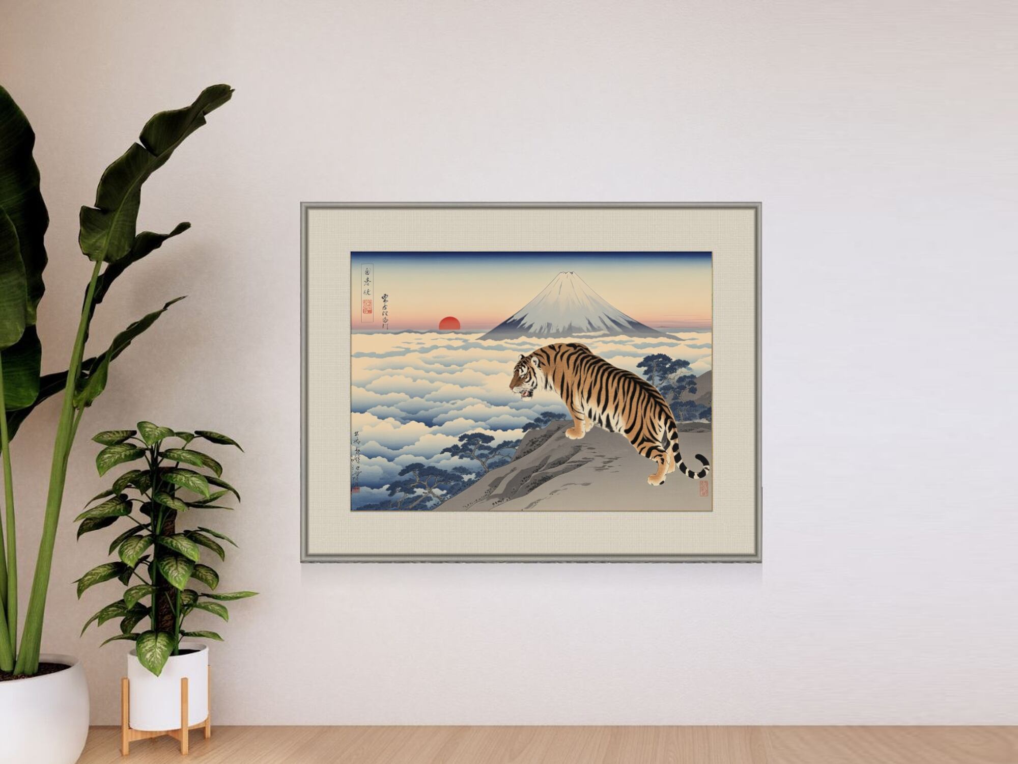 この作品は、虎の持つ圧倒的な生命力と守護の力、富士山が象徴する不動の安定、そして朝日がもたらす再生と始まりのエネルギーを融合させたスピリチュアルアートです。