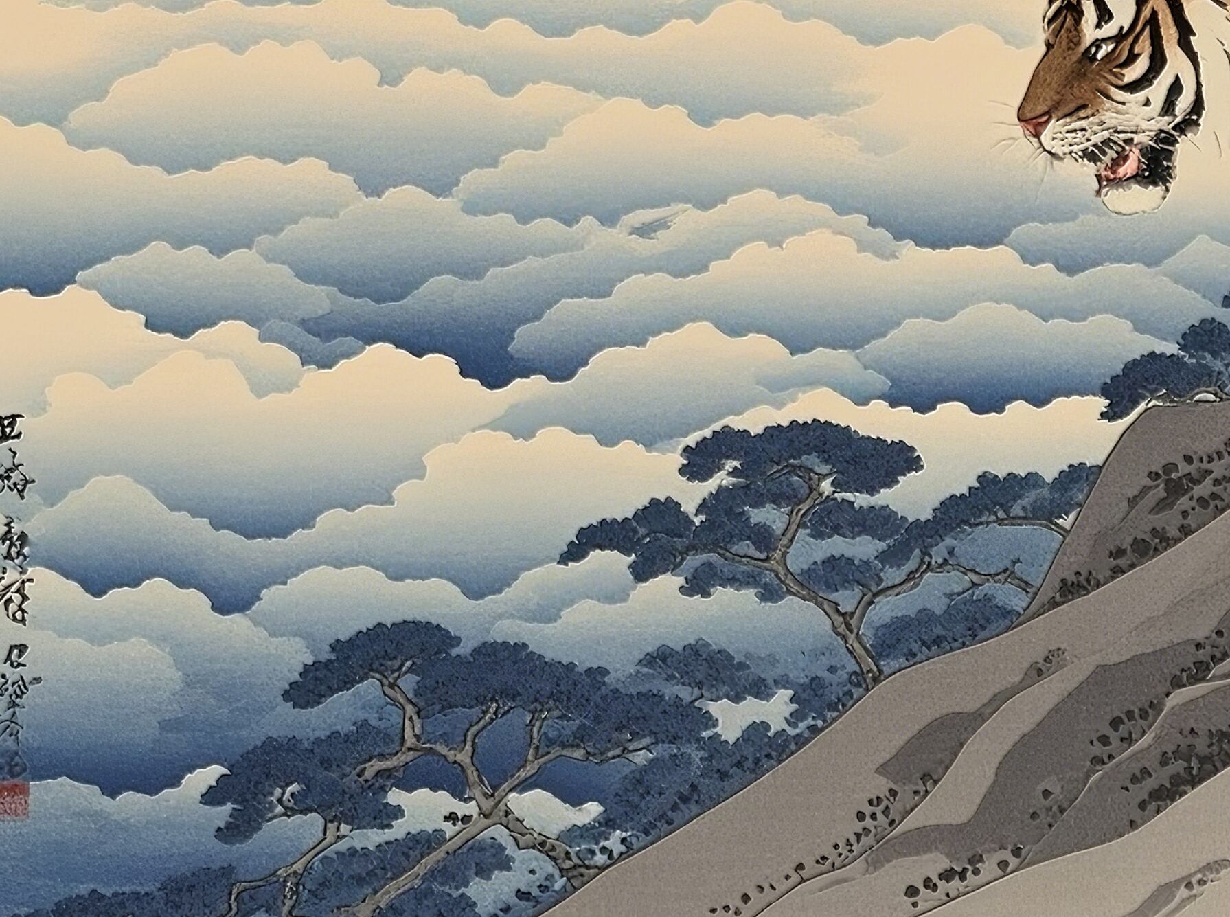 下界(雲海)を超えた場所に虎が立つことで、恐れや迷いを乗り越えた精神状態を示します。