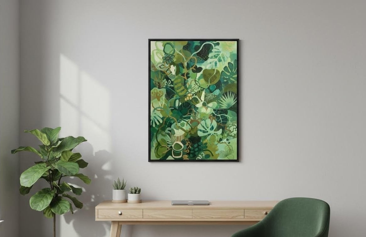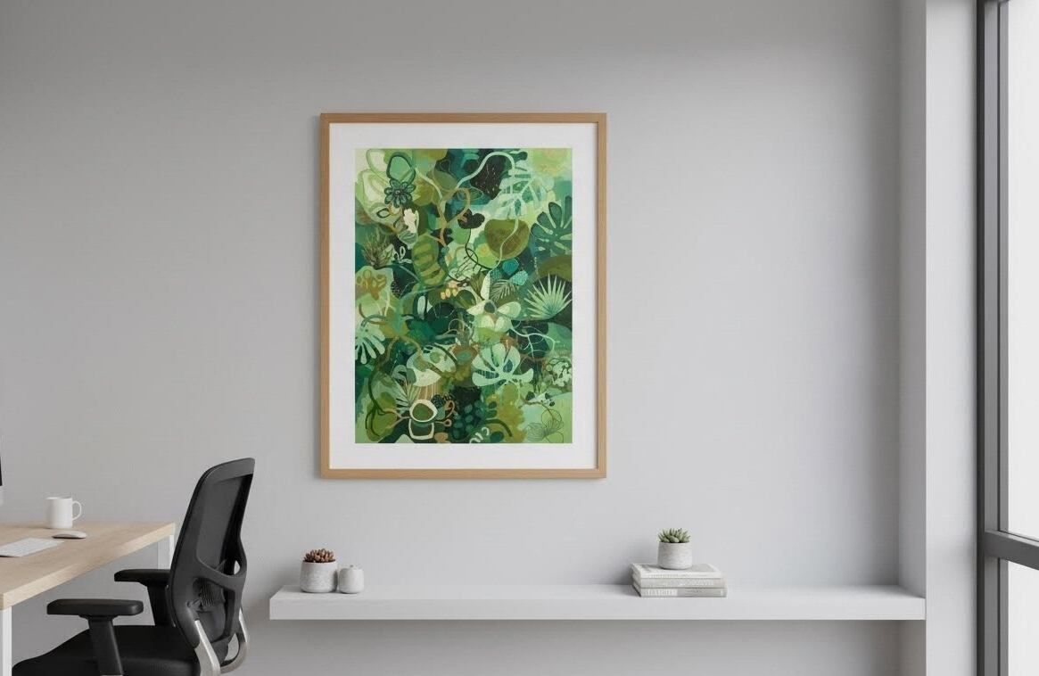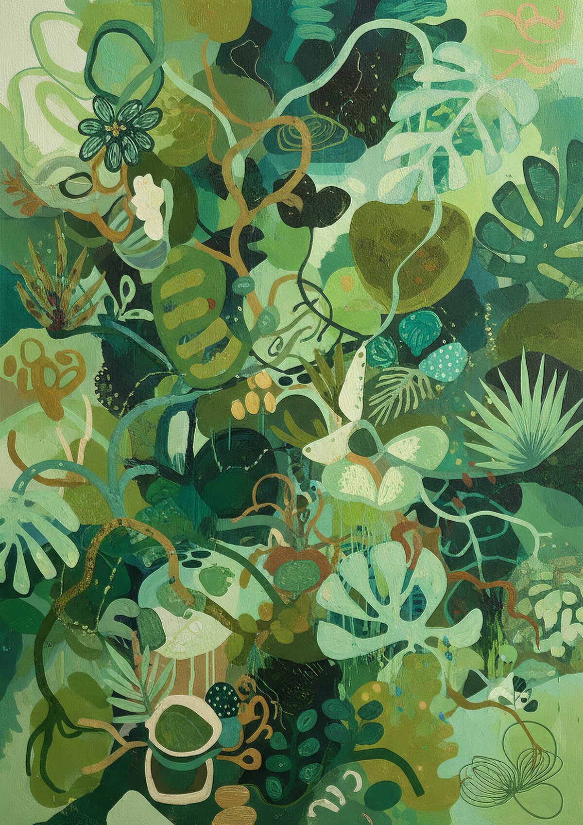 幾重にも重なり合う葉や蔓、抽象化された植物のかたちが、生命の流れと調和を描き出す一枚。